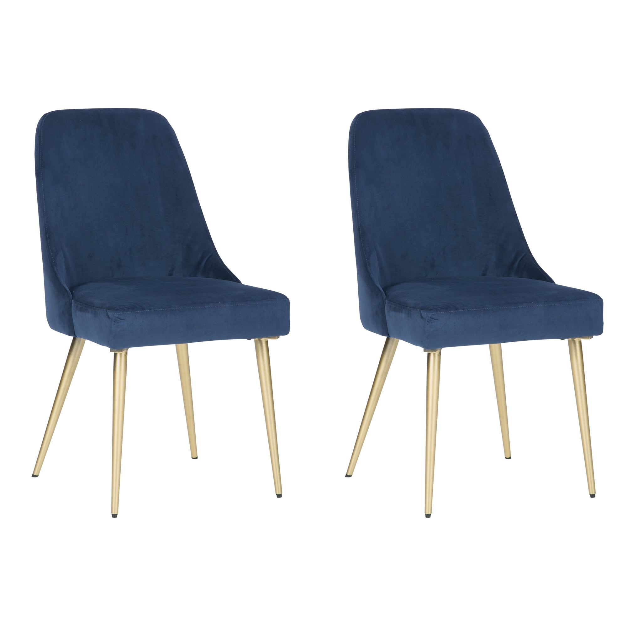 Set of 2 Blue velvety polyester upholstery over foam cushion Goldtone metal legs with powdercoat finish Assembly required