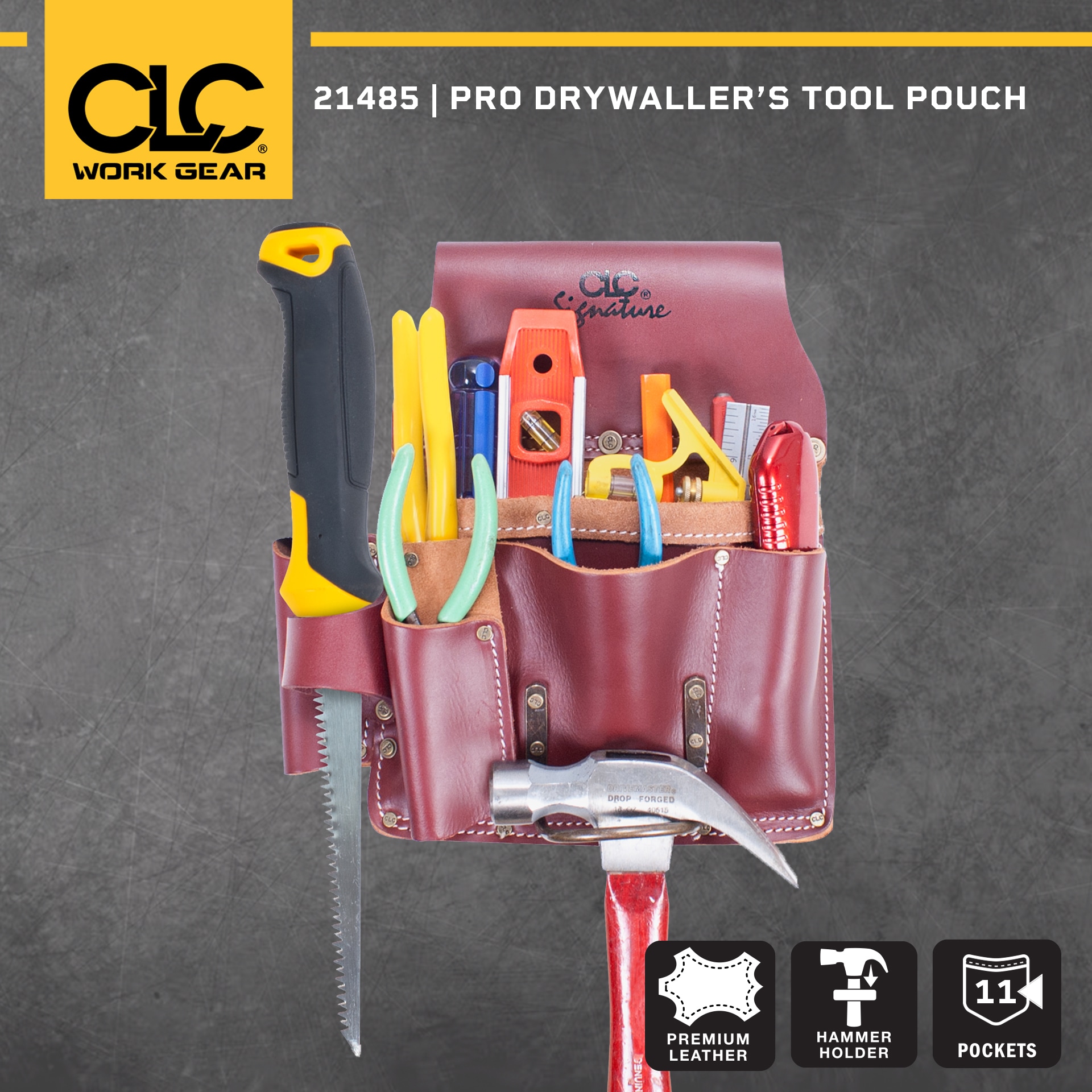 Part of the ultimate line of work gear from CLC, the Signature Elite series 11 pocket, heavy-duty drywall pouch made with heavy-duty top grain premium leather along with pockets for circle cutters, metal snips, and a hammer holder.