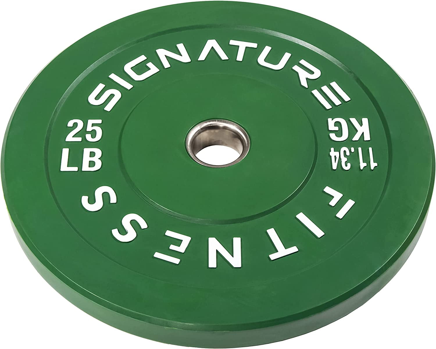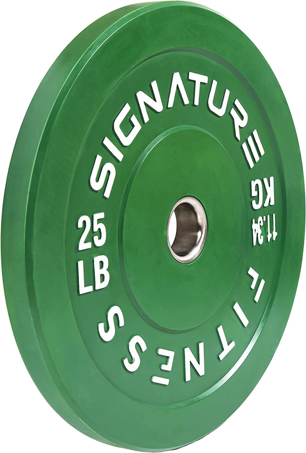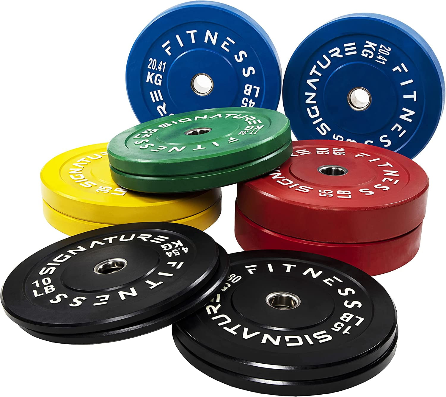 Signature Fitness 100% Virgin Rubber Bumper Plates – Low Odor, Low Bounce High Quality, Low Price – We invest in quality products that will last you a long, long time, so you don’t waste your hard earned money. Compared to similar products on the market, we believe we offer our bumper plates at the best prices for the highest quality. Protect your equipment and flooring with bumper plates – Using bumper plates allows you to protect your barbell and your floor from damage. Why risk it? Buy a pair of SF bumper plates today! Sold in Singles or Sets – 10-55lb Plates come in Singles, sets come in 160lbs, 210lbs, 260lbs, or 370lbs Come in Black or Color Coded: Black Plates are the most economical, color coded offers convenience by easy weight recognition. Weight displayed on both in Lbs and KGs Signature Fitness Brand Statement Quality and Affordability is who we are. As a small business made up of fitness enthusiasts, we found that there were hardly any brands that fit our budget while also providing top tier quality. We aim to provide convenience, affordability, and excellent quality to fitness enthusiasts of all levels. All of our products are made with the exact same materials as the most famous fitness brands in the world. There’s just one difference: we offer our products at a more affordable price. Order your set of Signature Fitness Bumper Plates today! Also be sure to check out our Barbells, Racks, and more. Follow us on Instagram @signature.fit Follow us on TikTok @signature.fitness