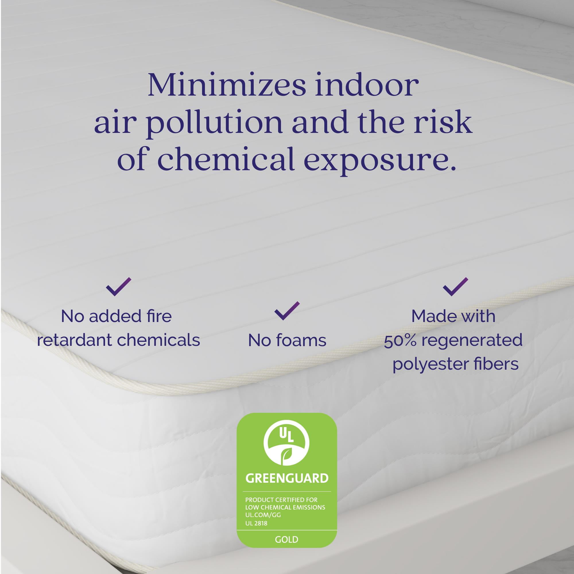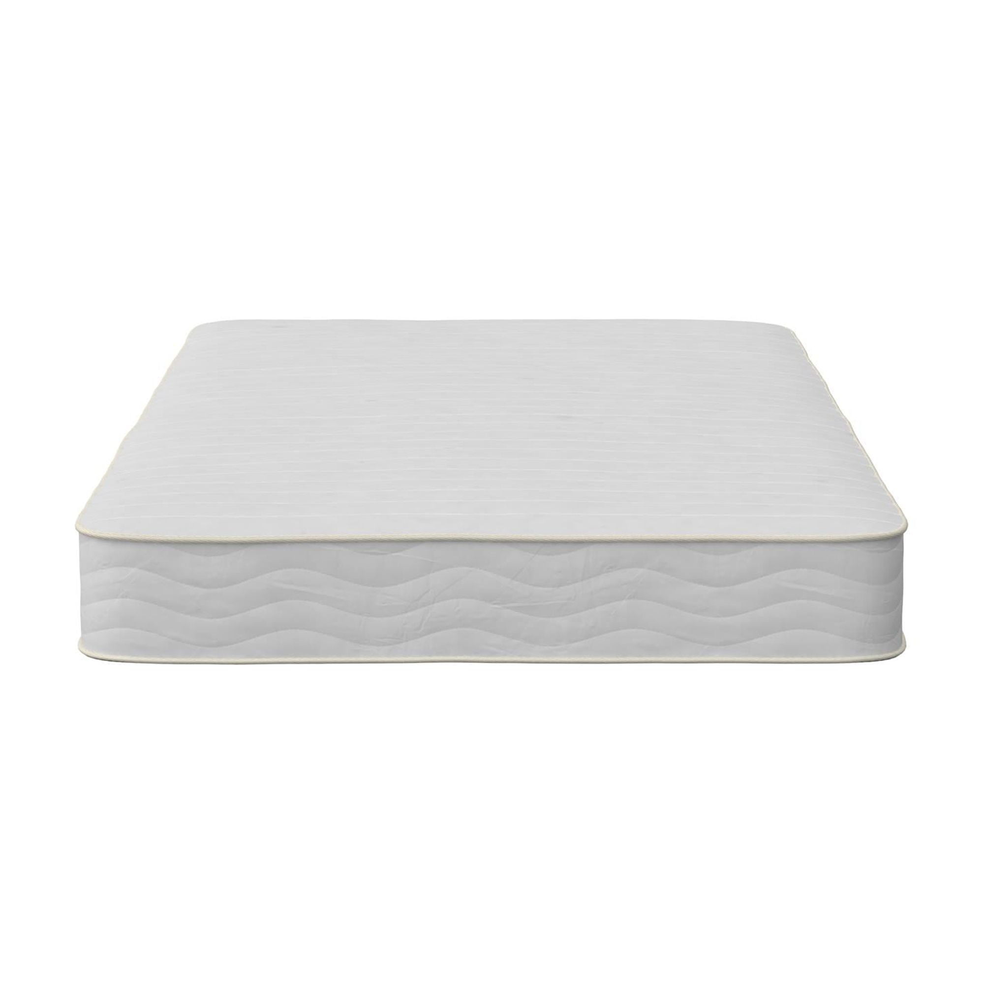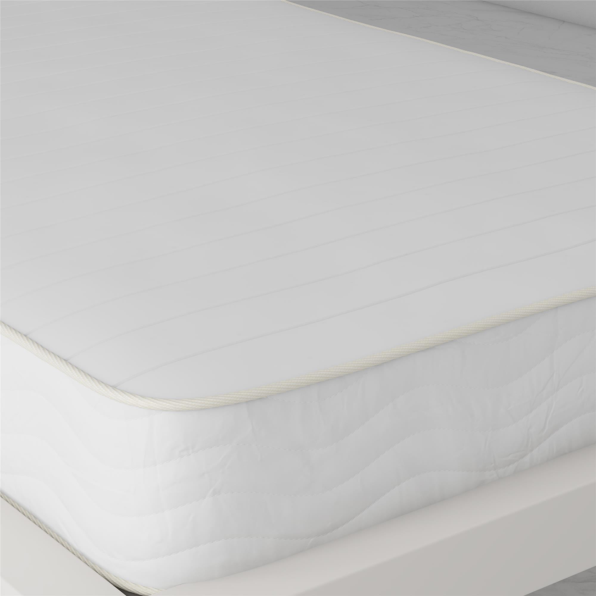 REVERSIBLE DESIGN: Dual sided construction is identical on both sides and can be flipped to extend the life of the mattress. Simply periodically rotate the mattress to promote mattress longevity and extended support. POCKET SPRING STRUCTURE: 7 inches of superior 465 heavy-duty steel independently encased pocket springs provide equal weight distribution by isolating partners movements for a more restful night’s sleep. Responsive coils provide dynamic pressure point relief by offering any body shape balanced support, no matter the sleeping style. MEDIUM-FIRM FIRMNESS LEVEL: Wrapped in a ”cushion-like” quilted polyester cover, the mattresses’ dual layers of high-density thermobonded polyester pads offer long-lasting support and durability. Mattress provides a cooler sleep than traditional foam mattresses because polyester pads do not retain heat and allow airflow. NON-TOXIC & ECO-FRIENDLY CONSTRUCTION: Pads are made from 50% recycled polyester fibers and mattress contains no added fire retardant chemicals. GreenGuard Gold Certified to meet strict indoor air quality standards. ASSEMBLED IN CANADA: Mattress conveniently ships to your door compressed and rolled up in a box for easy handling. Product dimensions: 74″L x 38″W x 8″H. Net weight: 47.5 lbs. Carton dimensions: 41″L x 12″W x 12″H. Gross weight: 53 lbs. 10-year limited warranty. Zippered cover is not removable or machine washable but can be spot cleaned with a damp cloth