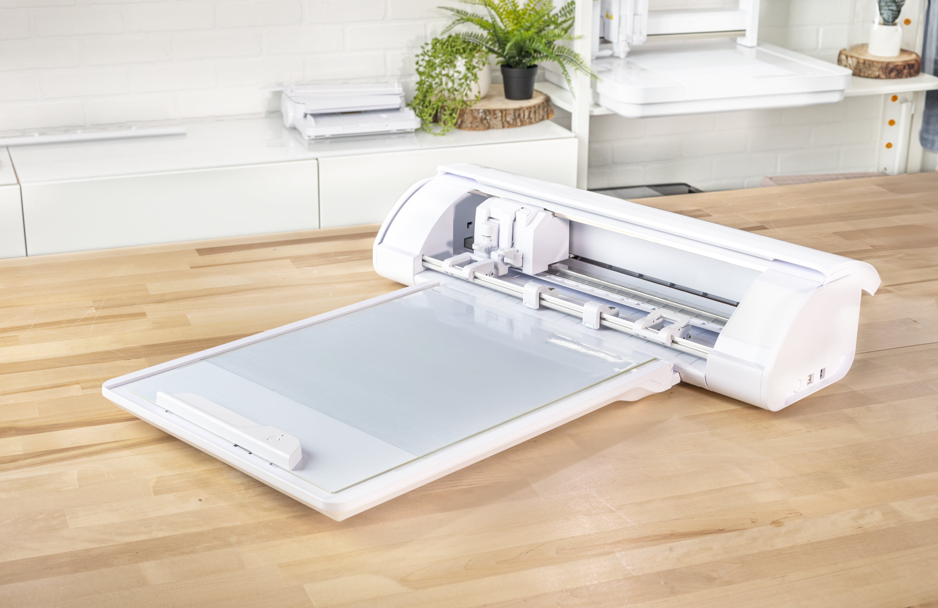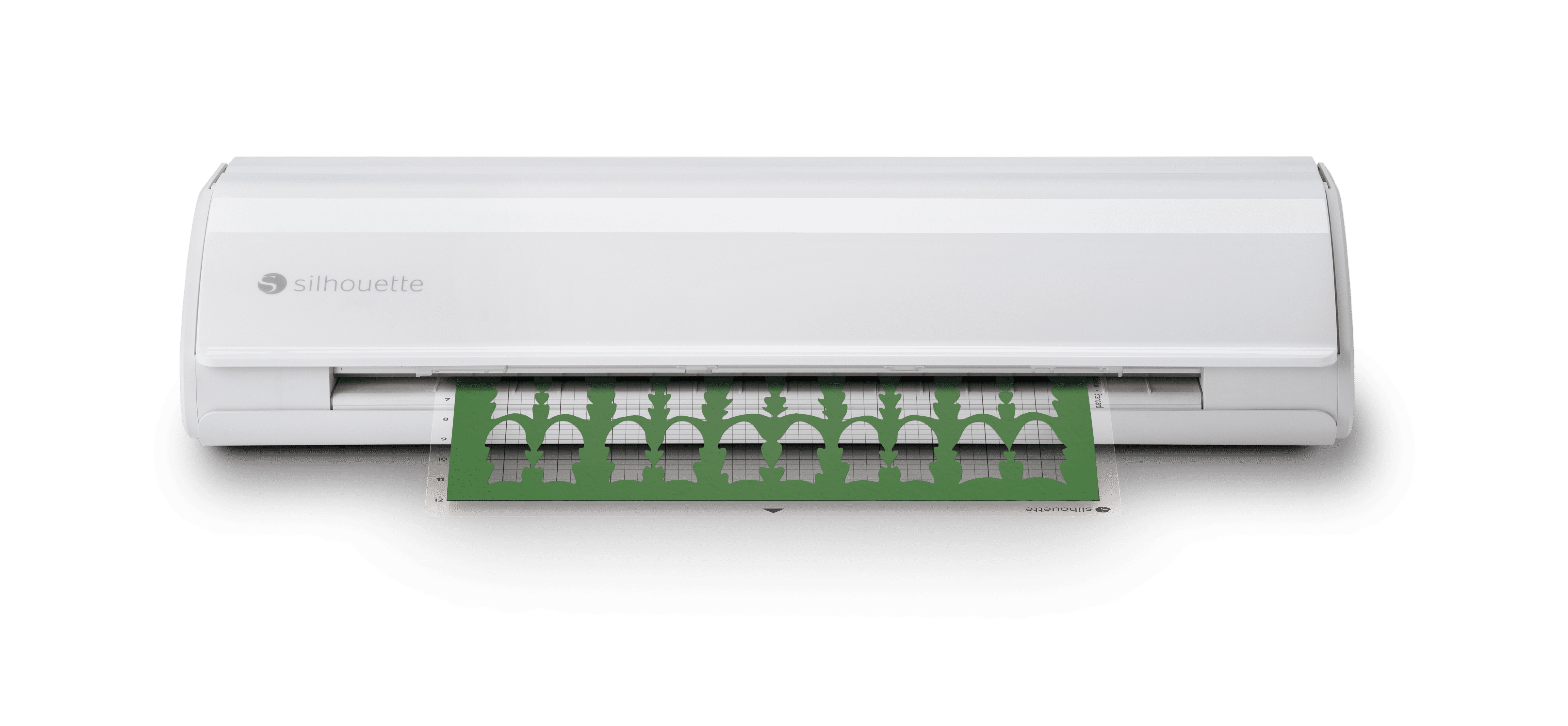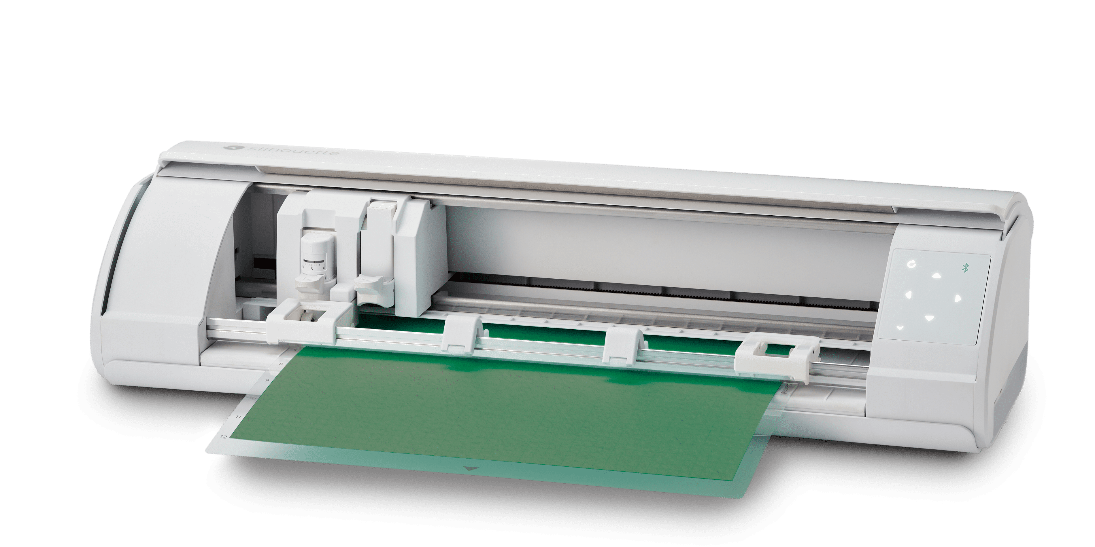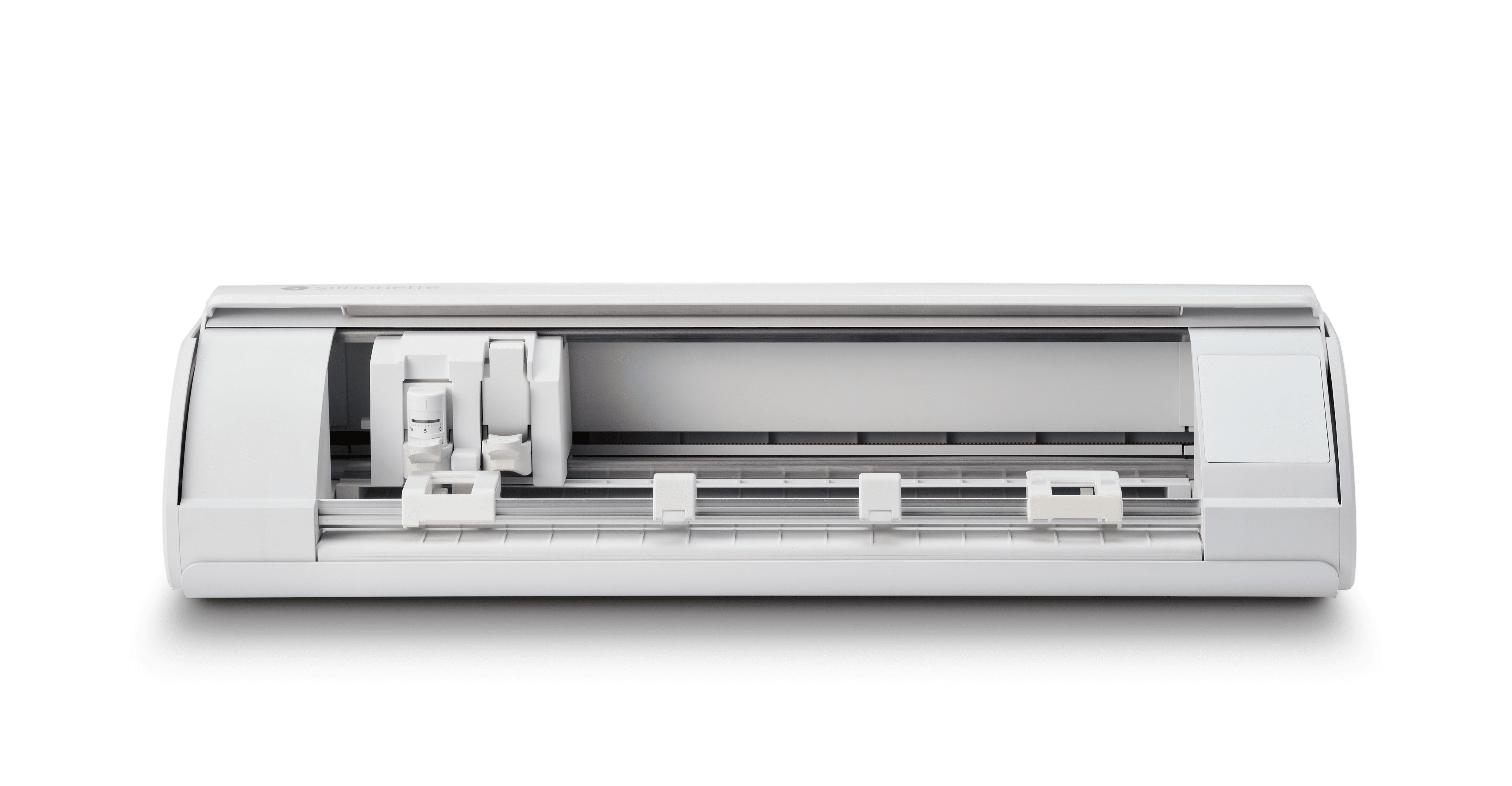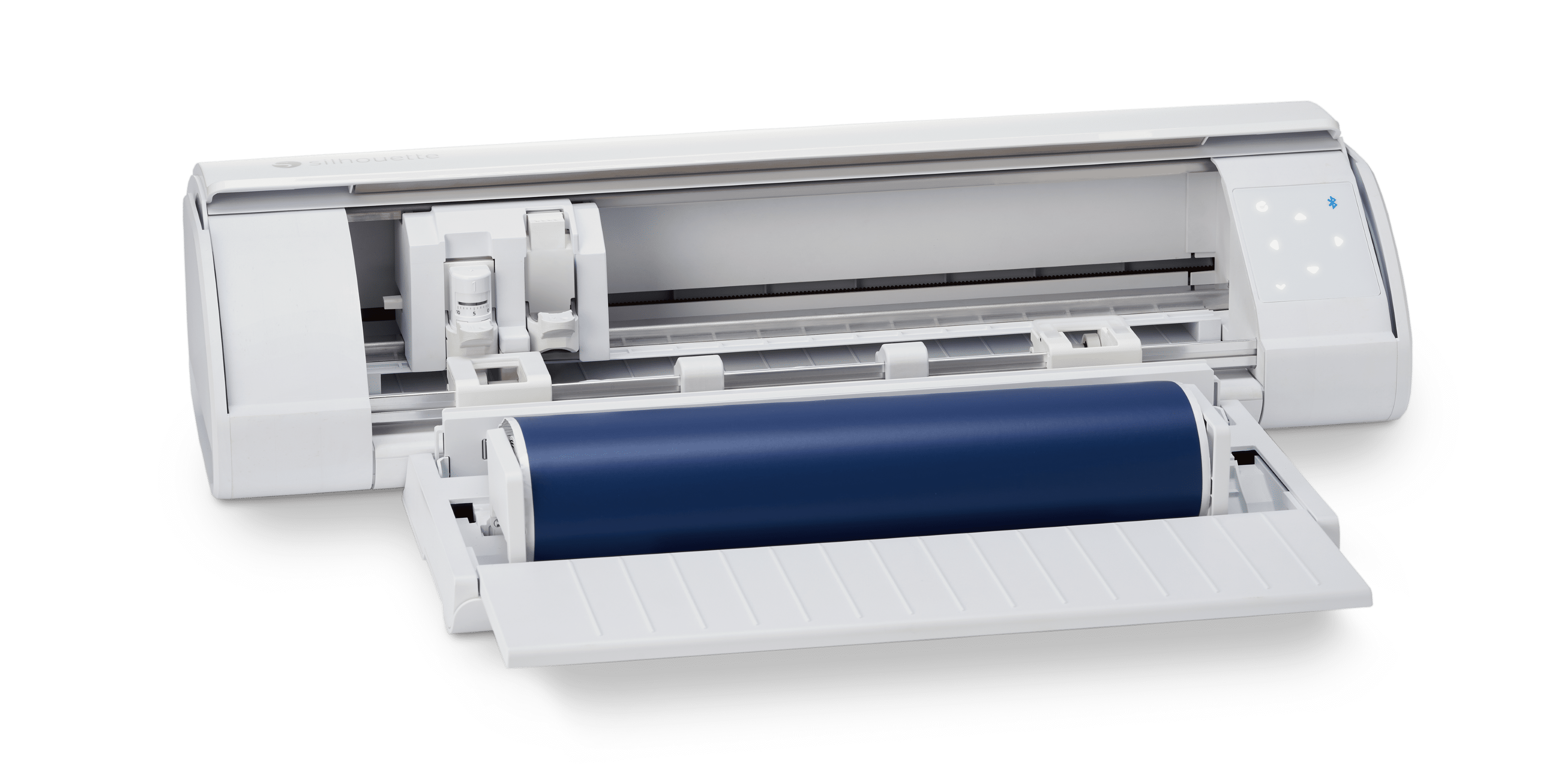 Silhouette Cameo 5 Cutting Machine (White) AC Adapter/Power Cable Set, Auto Blade, Blade Adjustment Tool, Roll Feeder 12in x 12in Cutting Mat – Strong Tack Heat Transfer Starter Kit – Bundle Size 3 Rolls of Oracal Transfer Tape 3 Vinyl Sampler Packs (Basic, Neutral, Bright) Silhouette Hook Tool Silhouette Pick-Me-Up Tool Silhouette Scraper Tool 100 Exclusive Designs (available with registration) Silhouette Studio Software (download) 1-month Silhouette Design Store Subscription (available with registration) No Batteries Required – Operates with a standard AC power adapter