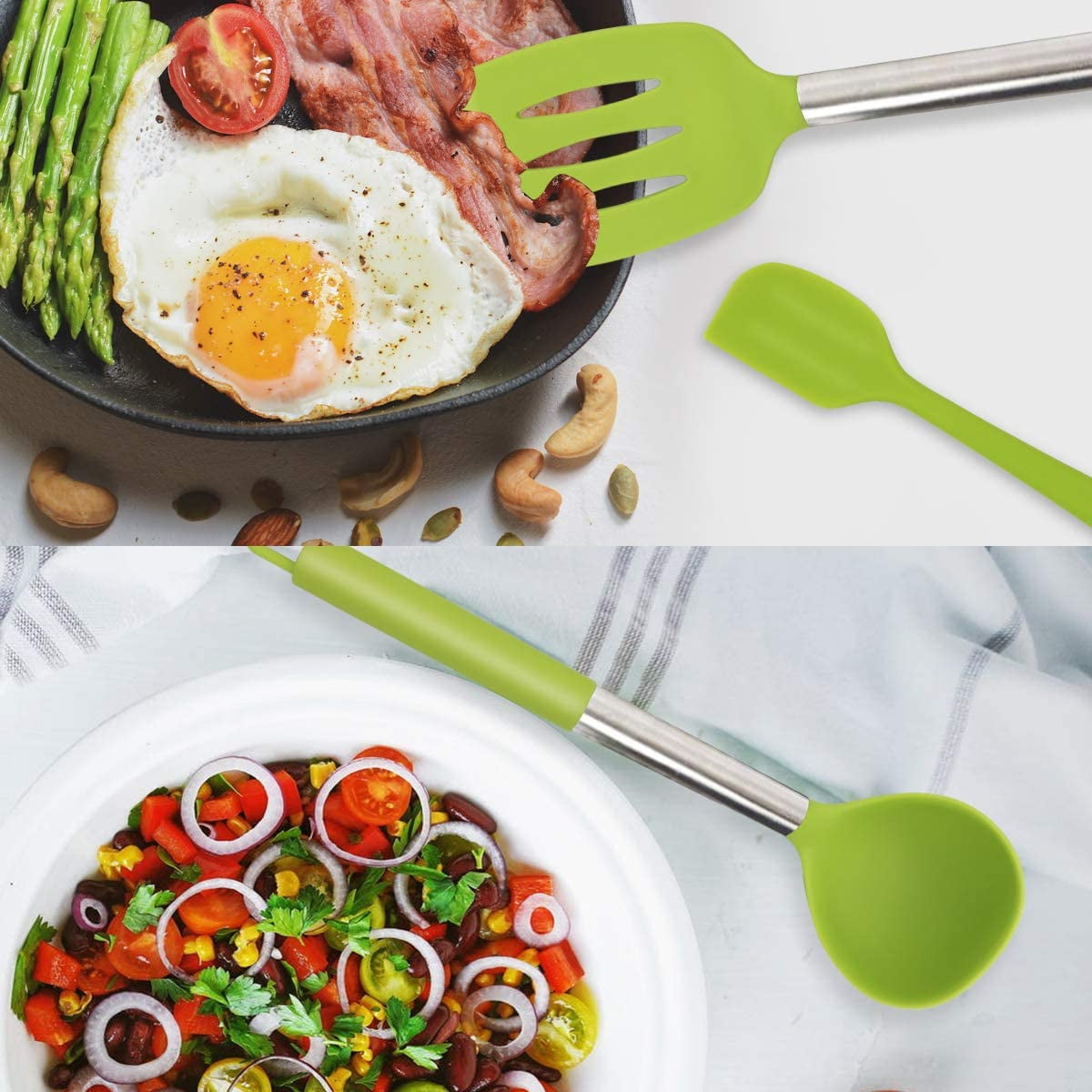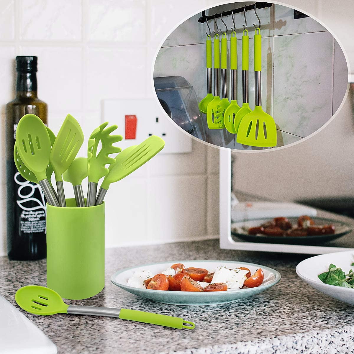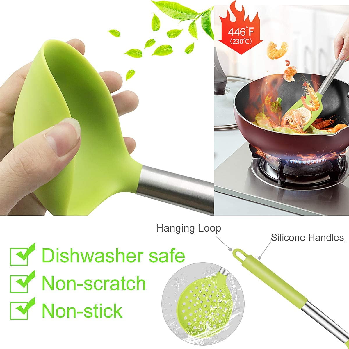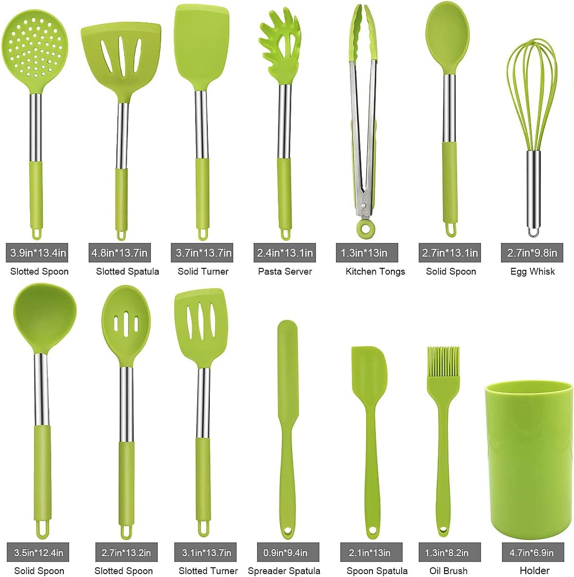 33-IN-1 Silicone Kitchen Utensil Set? Comes with a nice box includes: 1 Skimmer, 1 Slotted Spatula, 1 Solid Spatula, 1 Pasta Server, 1 Kitchen Tongs, 1 Solid Spoon, 1 Egg Whisk, 1 Ladle, 1 Slotted Spoon, 1 Slotted Turner, 1 Spreader Spatula, 1 Spoon Spatula, 1 Oil Brush, 1 Holder, 5 Measuring Spoons, 2 Silicone Clamping Gloves, 13 S-shaped Hooks. Heat Resistant and Durable? Silicone Cookware Set can withstand temperatures down to -446 ° F / 230 ° C and the 2 Silicone Clamping Gloves can withstand temperatures down to -248° F / 120° C.It does not react with food or drinks or produces dangerous vapors. It is non-toxic, odorless, non-corrosive and durable. Easy to use and Storage? Kitchen Tool Gadgets come with 13 hooks. Each kitchen appliance can be hung with hook in your kitchen. You can also put the cookware in the holder. The silicone kitchen utensils are non-stick coated,very easy to clean,support dishwasher too. Protect Your Cookware? Chief Cooking Set made of stainless steel handle cover premium silicone. No breaking or bending, no melting, non-stick. The silicone heads of these cooking utensils are particularly suitable for coated pans, pans, since they do not scratch your cooking utensils. Meets All Your Needs? Fully Equipped Cooking Utensils, with exquisite packaging box, is a suitbale gifts for your family and friends on Thanksgiving, Christmas, Birthday, etc. If you have any questions, please let us know at any time.We will try our best to help you.