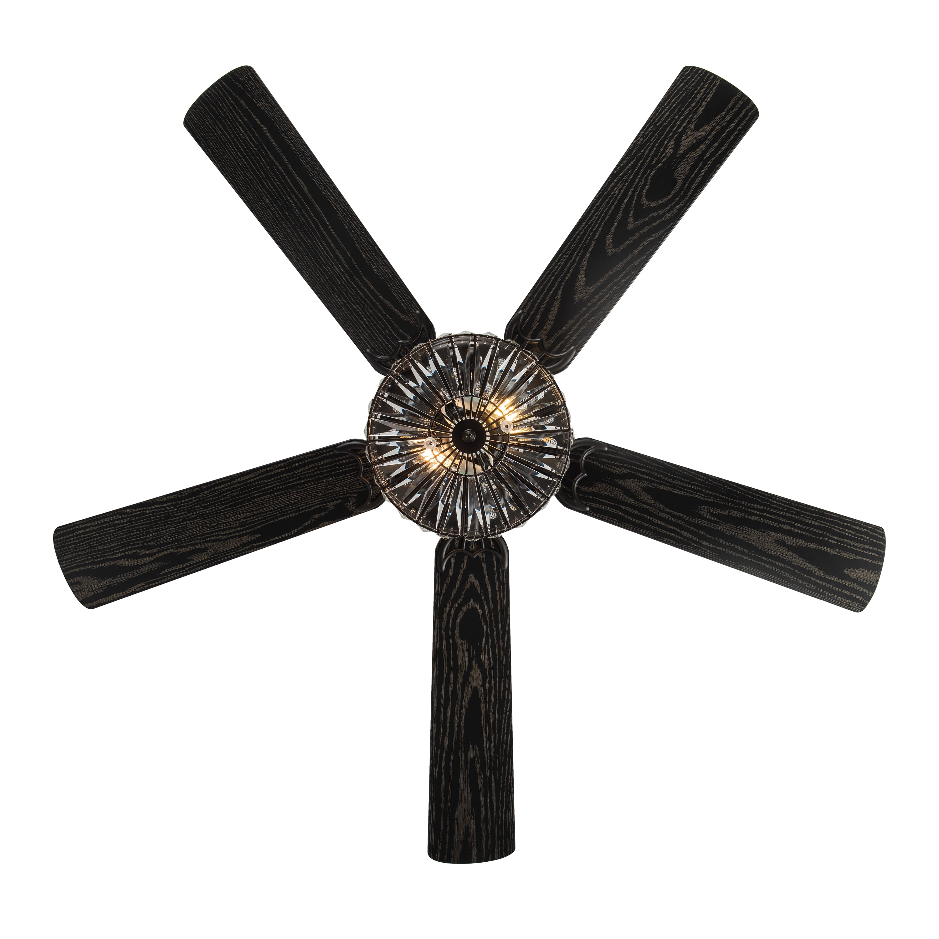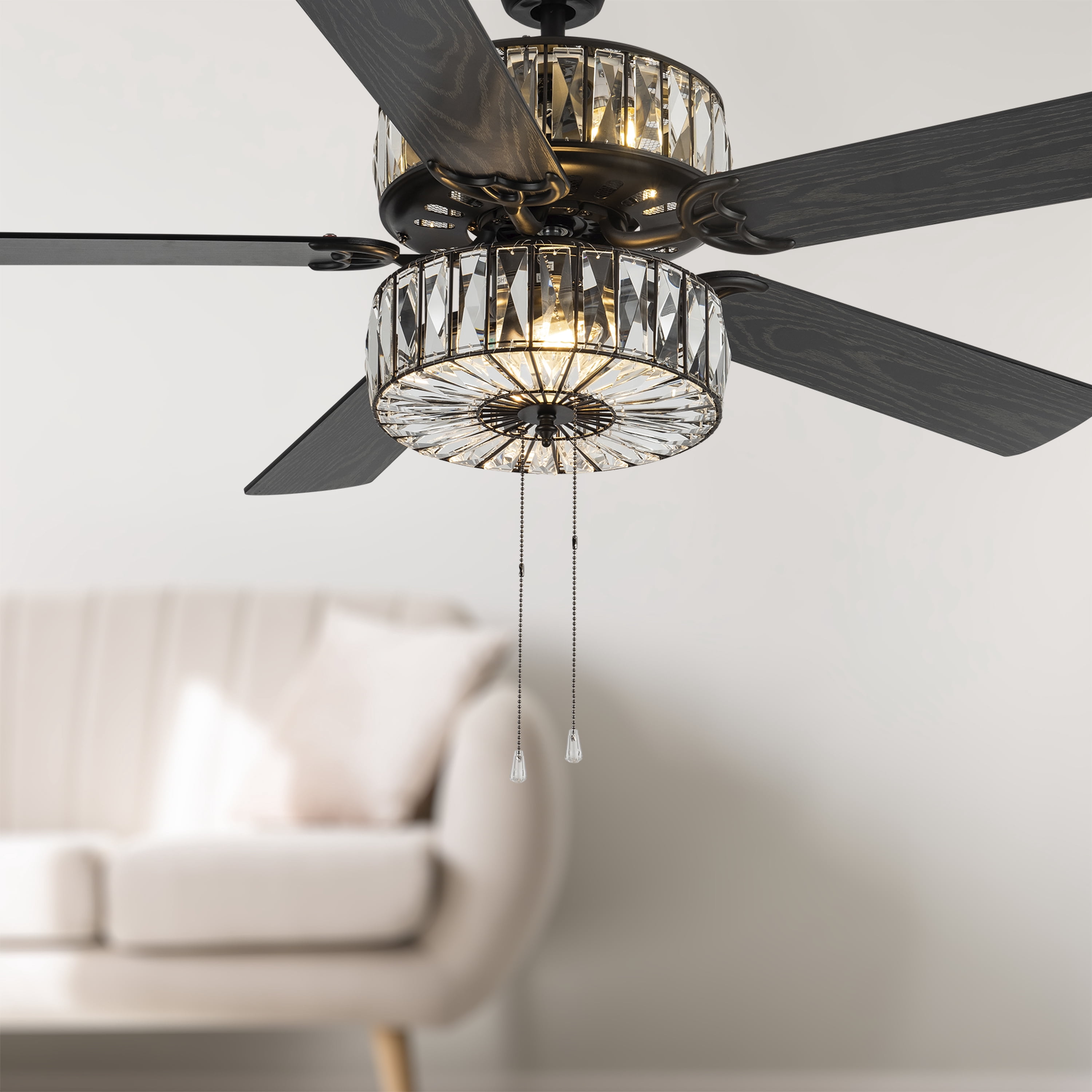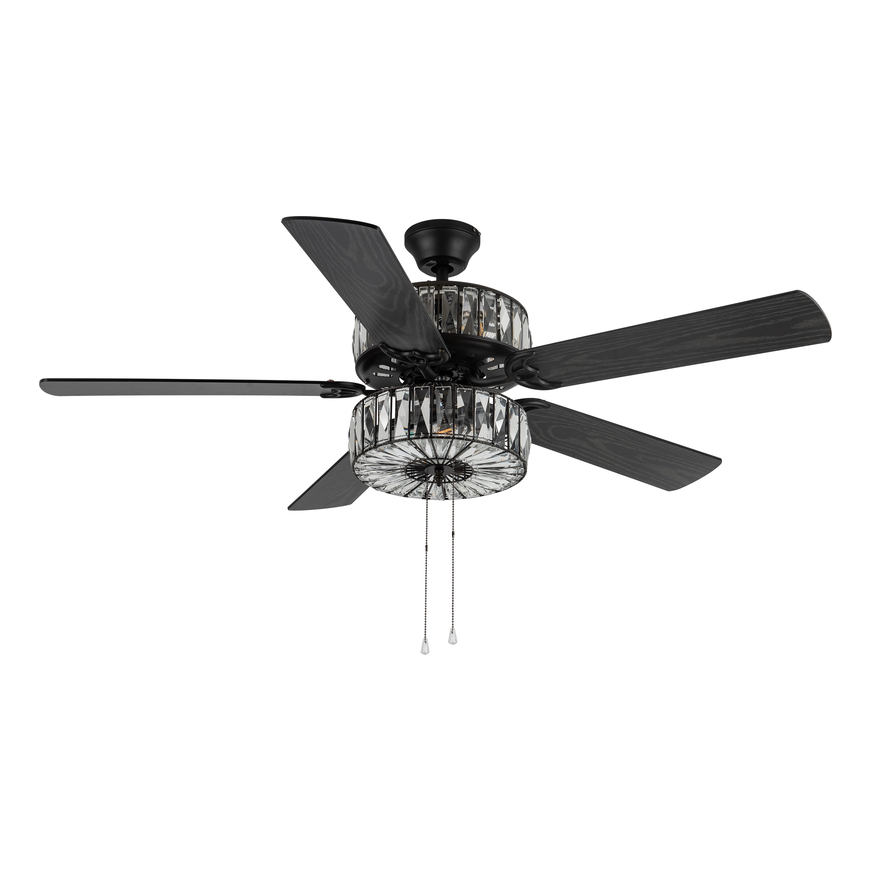 Add a touch of elegance to your home with this statement ceiling fan. This fan features rich oil-rubbed bronze finish on the motor and sparkling glass crystals set in black metal on both the upper and lower light chambers. The reversible motor has three speeds, and the five-wood grain textured blades that are antique black on one side and mahogany on the other offer 2 distinct designing options in your home. With pull-chain switches for easy use, this fan is both stylish and practical. Everything you need to set the mood in your living room, bedroom, or dining space is included: 6 total bulbs, flush mount installation, a 4″ downrod, and a 21″ downrod! This unique ceiling fan is a stunning addition to any space in your home and a value with the multiple hanging options/downrods/bulbs included. Features: Elegant design with 78 glass crystals Six lights on upper and lower components Five reversible blades (antique black or mahogany) Reversible motor with three speeds Pull-chain switches for easy use Includes 4-inch short down rod and 21-inch long down rod Measures 52 inches in diameter