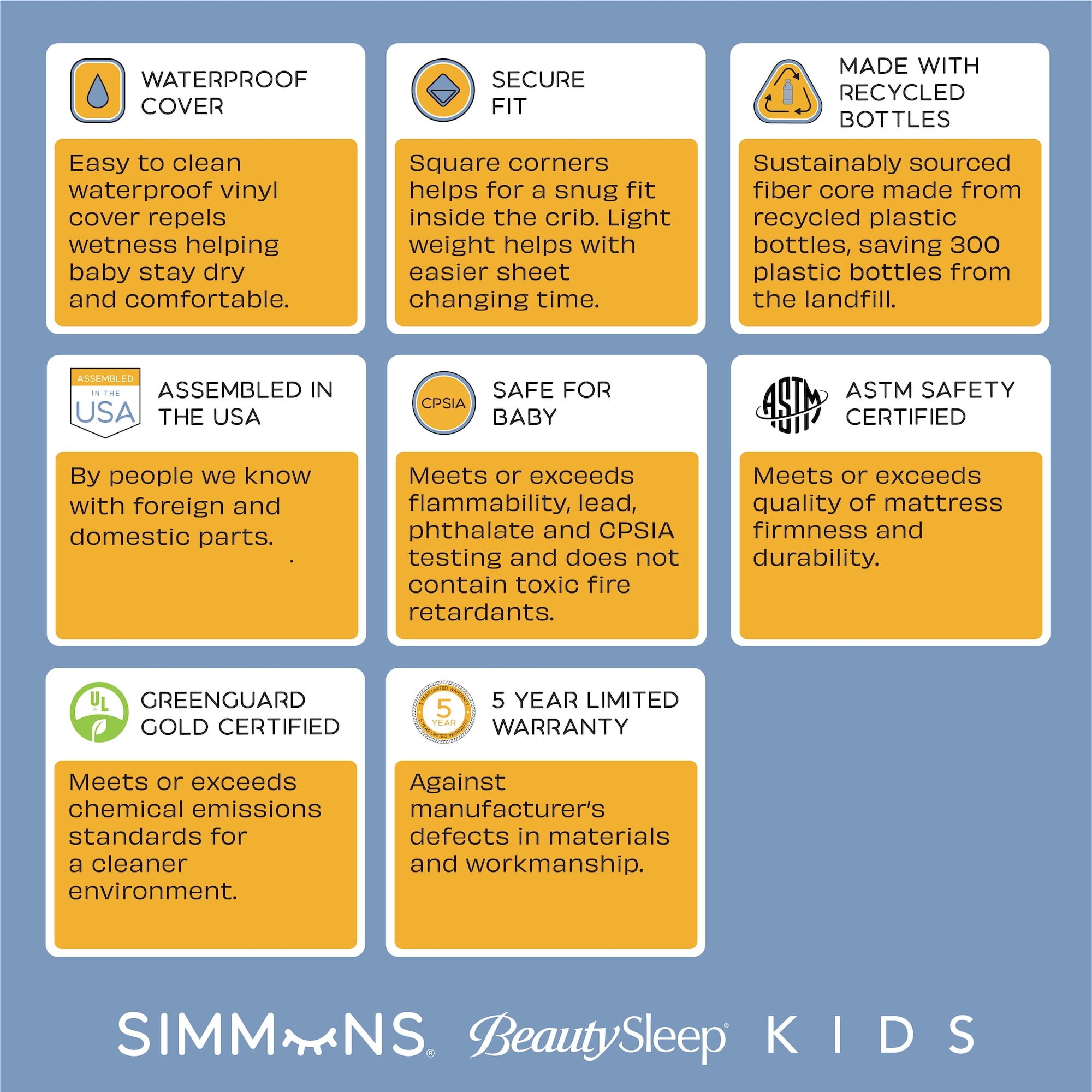 MADE FROM RECYCLED MATERIALS: Firm fiber core made from recycled bottles delivers the ideal firmness level for newborns, infants and toddlers while helping save over 300 bottles from the landfill–great for babies, great for the environment WATERPROOF DESIGN: Durable vinyl cover is waterproof and designed to easily repel all liquids and solids | The cover easily wipes clean and is stain-resistant GREENGUARD GOLD CERTIFIED: This mattress is GREENGUARD Gold certified, which means it’s made of materials with low chemical emissions, helping contribute to healthier environments and indoor air in your home | JPMA certified WE PUT BABY’S SAFETY FIRST: Non-toxic construction is free from harmful materials/chemicals | Meets or exceeds flammability, lead, phthalate and CPSIA testing and does not contain toxic fire retardants 5 YEAR WARRANTY: This mattress backed by a 5-Year Industry Leading limited manufacturer’s warranty on craftsmanship and materials