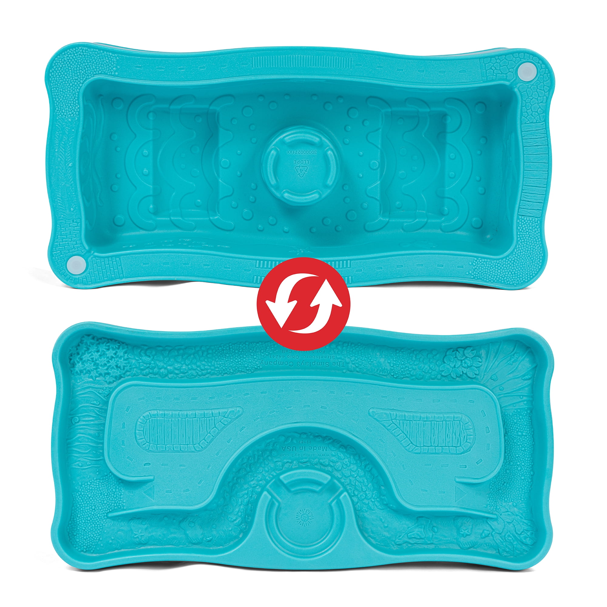 TWO SIDES TO PLAY: Simplay3 two-sided play around water table includes deep ocean dive side with large splash pond and lazy river water way side with roadways and canals. Both sides accept waterwheel for pouring play SENSORY LEARNING: Sensory-rich textures include molded in sea creatures, a cascading water wheel, raised ocean life details and textures of water, roads, rocks and more WATER PLAY ACCESSORIES INCLUDED: Spinning water tower, pouring cup with easy grip handle, floating boat, and watersafe submersible play truck are included. Comes fully assembled and ready for play. DURABLE: Heavy duty one-piece construction requires no assembly and is easy to clean and store when not in use NO ASSEMBLY REQUIRED: Designed for instant play and fun, this reversable water play table comes fully assembled. Just add water and it’s ready for hours of playtime!