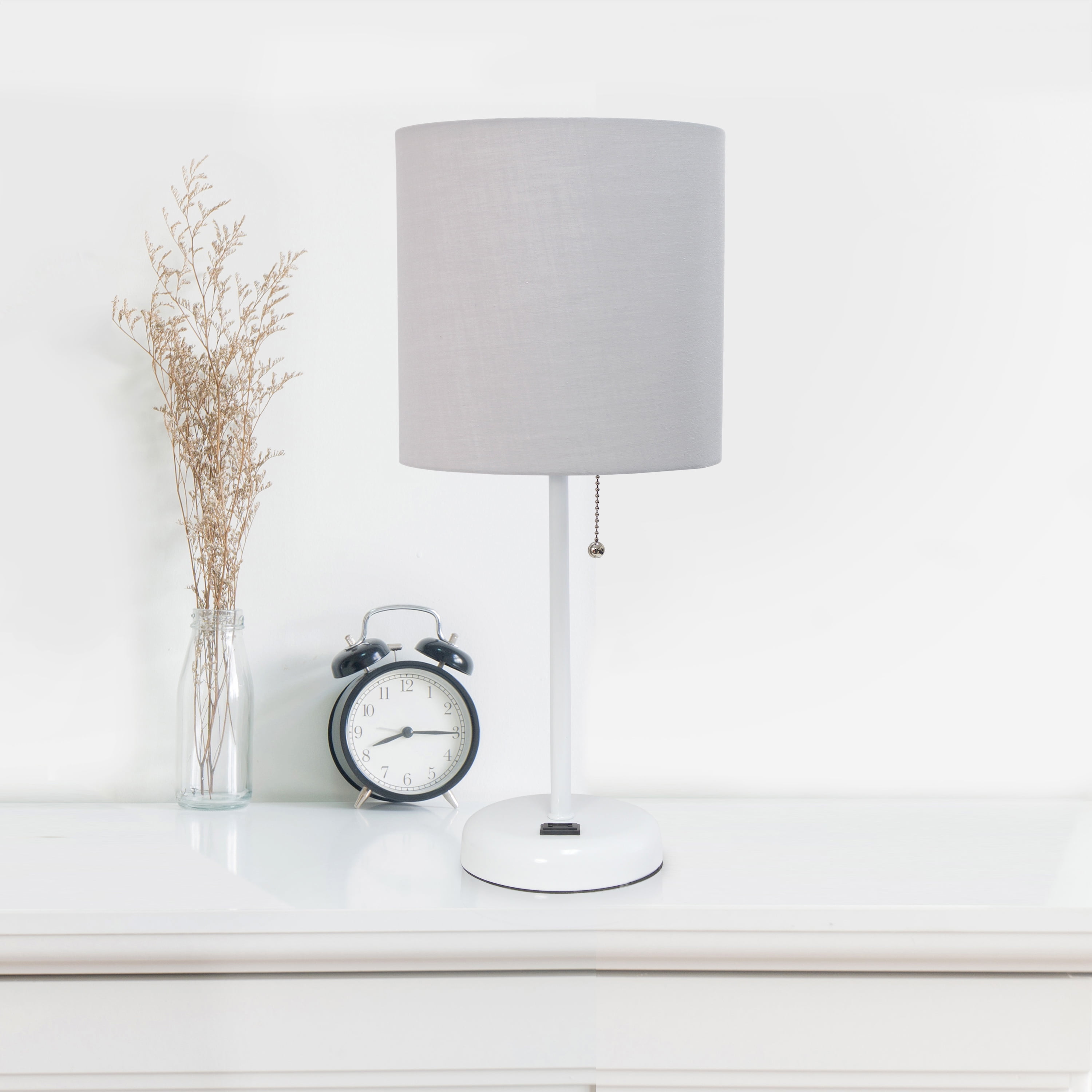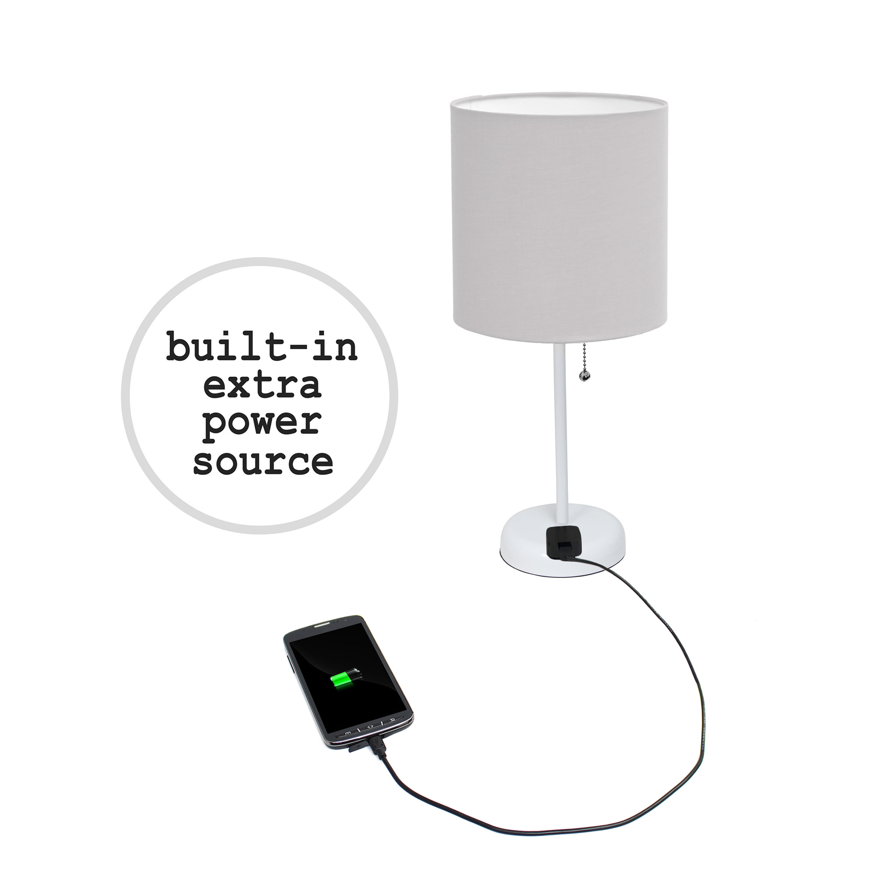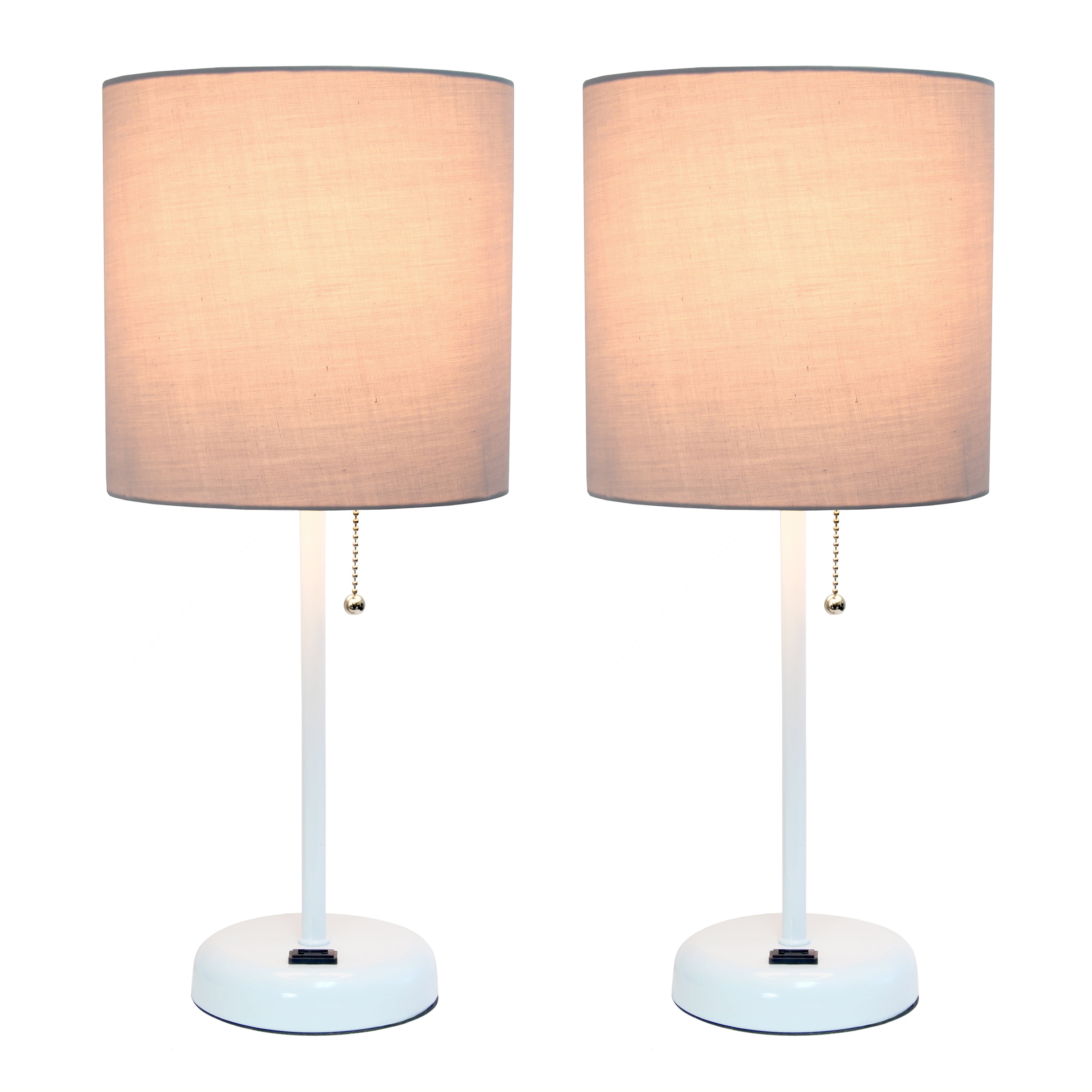 LimeLights White Stick Lamp with Charging Outlet and Fabric Shade 2 Pack Set, Gray Description: This fun and fashionable lamp features a white base and a fabric shade. It comes equipped with a 2 prong outlet seated in the base for use to charge mobile phones, handheld games, tablets, and other small electronics. This lamp will add a fabulous flair to any room. Perfect for bedrooms, kids and teens, college dorms, nurseries, or fun offices!. White base with Charging Outlet. Fabric Shade. Perfect for bedrooms, kids room, college dorm, nursery, or fun office. Shade Diameter: 8.5″ x Height: 19.5″. Uses 1 x 60W type A medium base bulb (not included). Features: Product Weight: 3.08 lbs. Product Dimensions: 8.5″L x 8.5″W x 19.5″H. Bulb Type: Incandescent (A-19). Switch Type: Pull switch Switch Location: Socket. Shade Diameter: 8.5. Shade Top Opening: 8.5. Shade Bottom Opening: 8.5 Shade Height/Slant: 8.5. Shade Security: Socket Nut. Number of Lights: 1. Maximum Wattage: 60. Height from Base to Shade: 11 Shade Material: Fabric. Cord Color: White. Cord Length: 5′. Style: Contemporary. Finish/Color: WHITE BASE/GRAY SHADE. Primary Material: Metal Material Breakdown: fabric: 25%, iron: 69%, plastic: 6%. Base Type: E26 Medium Base. Base Dimensions: 14.25 x 5.25 x 5.25. Bulb Included: No Brand Name: LimeLights Model No: 1270-LC2001-GOW-2PK