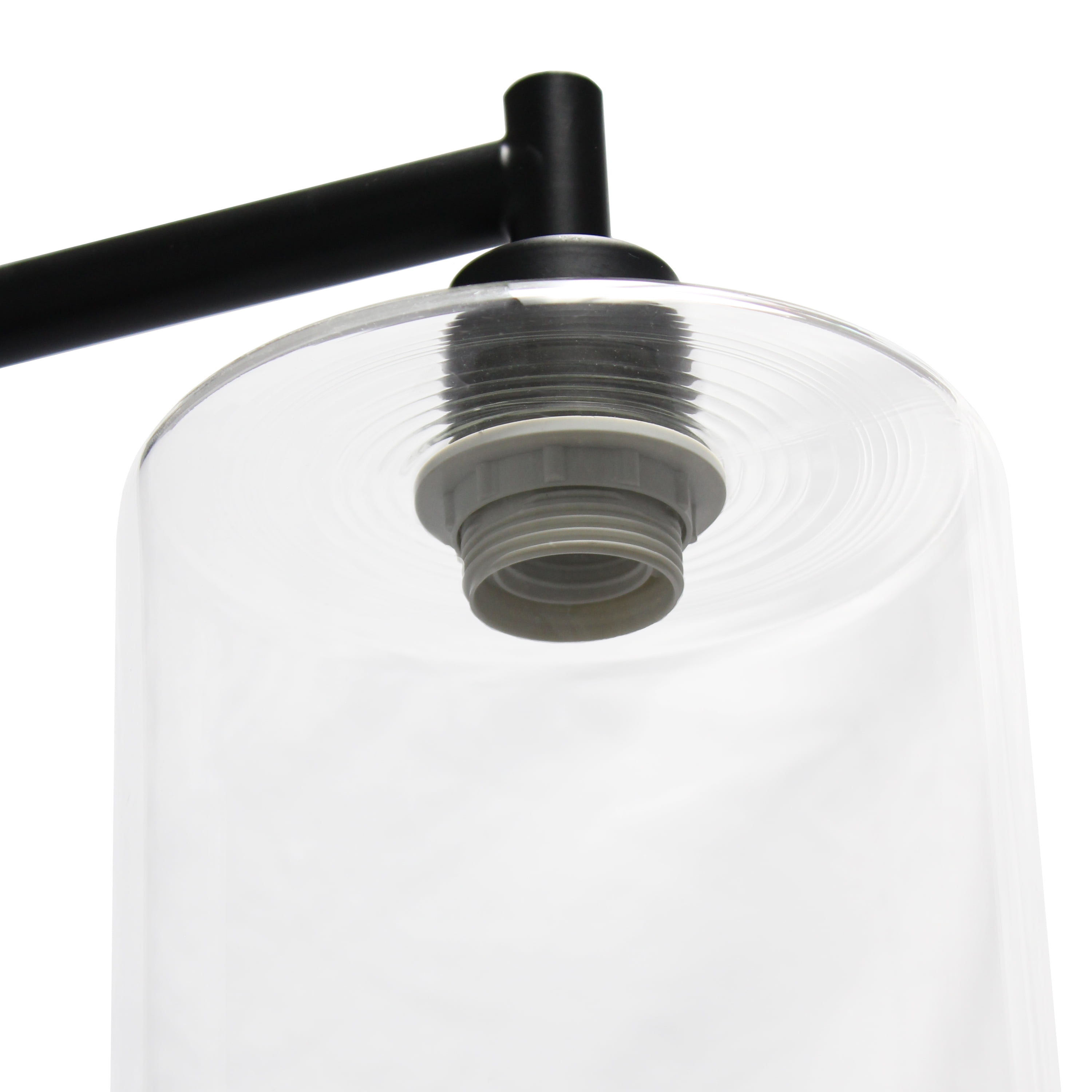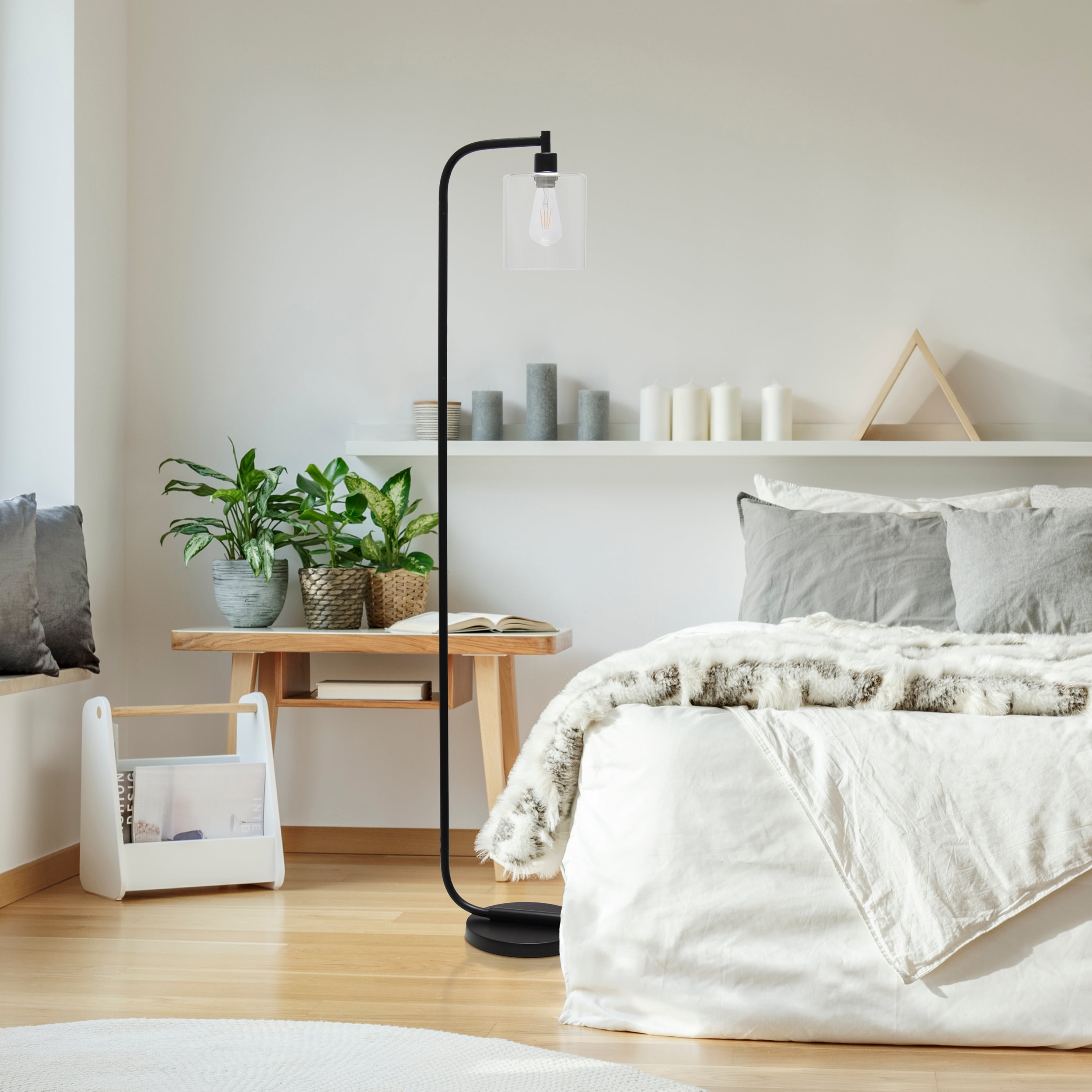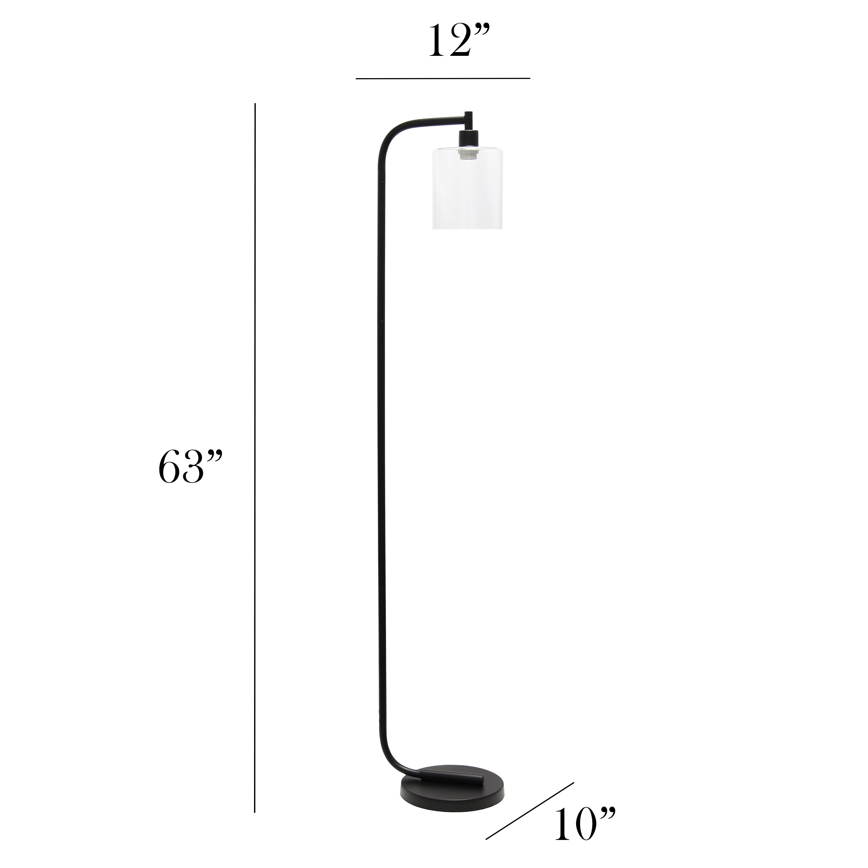 Black finish Clear cylindrical glass shade Foot switch located on cord Lamp measures L: 12″ x W: 10″ x H: 63″ Clean and Modern look Uses 1 x 60-Watt equivalent Type A Medium Base Bulb (not included)