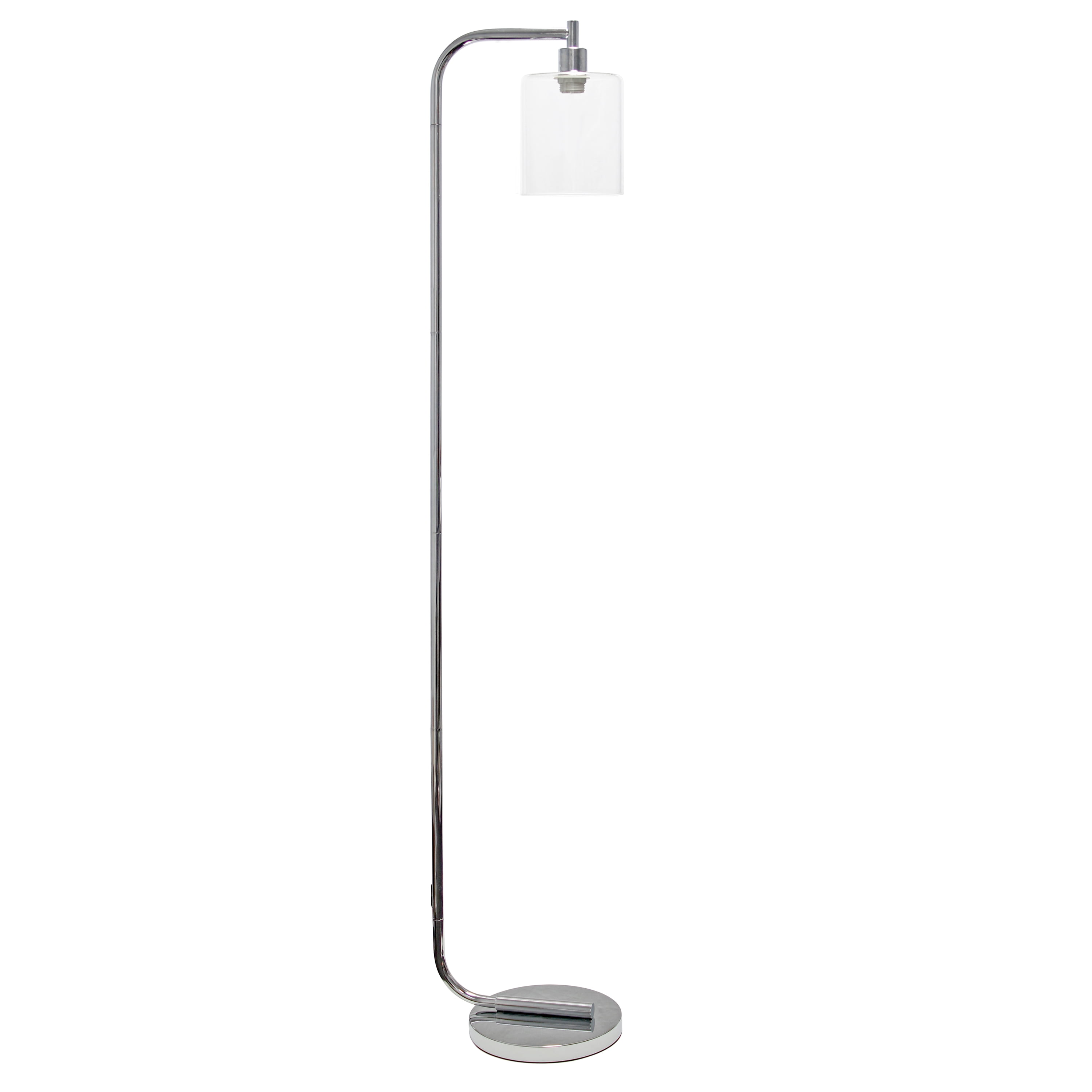 Chrome finish Clear cylindrical glass shade Foot switch located on cord Lamp measures L: 12″ x W: 10″ x H: 63″ Clean and Modern look 1 x 60-Watt equivalent Type A Medium Base Bulb (not included)