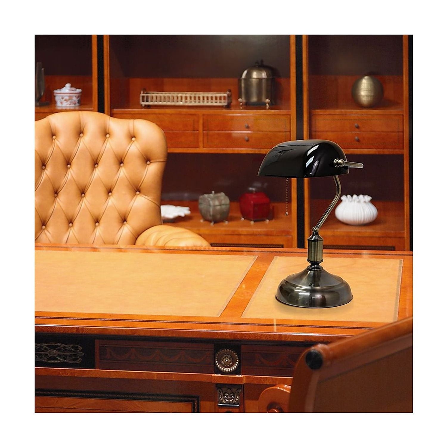 Simple Designs Executive Banker’s Desk Lamp with Glass Shade Add a touch of class to your workspace or home with this simply designed banker’s lamp. Just the right design to boost your decor with a sophisticated and professional feel, this desk lamp will be the perfect item for your lighting needs. Uses 1 x 40W E26 Medium Base Bulb (not included) : Antique Nickel Glass Rollover Shade. Pull chain ON/OFF Switch. Style: Traditional. Finish: Antique Nickel. Material: Metal. Base Type: E26 Medium Base. 7″ Diameter Cord Length: 5′ Bulb Type: Incandescent. Bulb Included: No. Switch Type: pull chain. Switch Location: socket. Shade Material: glass. Product Dimensions: 10.5″L x 8.66″W x 14.75″H, Weight: 4.62 lbs. Color: Black, Model No: 1270-LT3216-BLK Color: Green, Model No: 1270-LT3216-GRN Color: White, Model No: 1270-LT3216-WHT Shipping Details: