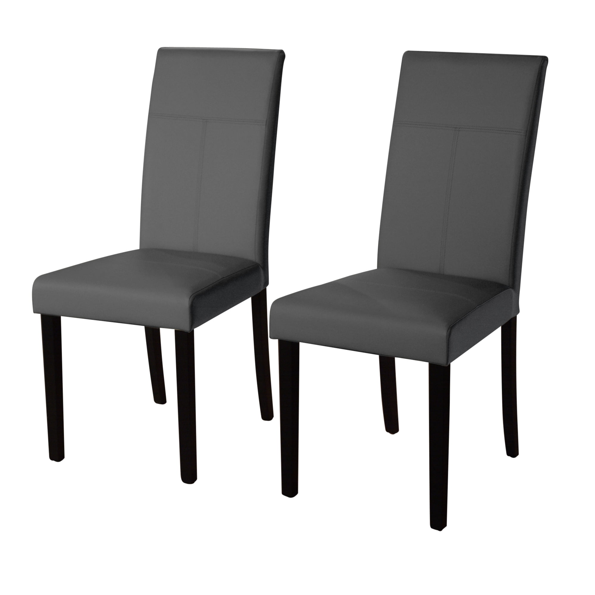 Enhance your dining room’s seating capacity with this pair of Bettega parson chairs from Simple Living. With a streamlined silhouette, faux leather upholstery and wood legs in an espresso finish, this chair set completes your room’s contemporary design scheme. Stitch detailing on the seat back offers aesthetic interest. Made from rubberwood for strength and durability, the set ensures years of use. High seat backs and dense polyester foam contribute to the chairs’ outstanding comfort, inviting your guests to sit back and linger over after-dinner coffee. Thanks to the faux leather upholstery, the chairs are easy to clean, so they stay looking great, even if you use them every day.