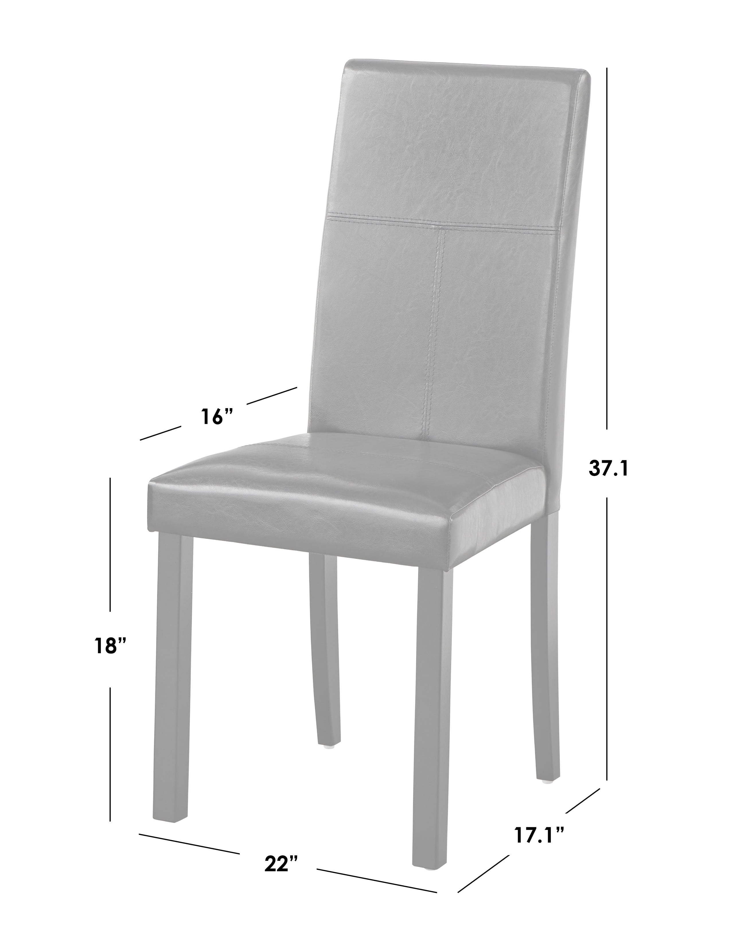 Enhance your dining room’s seating capacity with this pair of Bettega parson chairs from Simple Living. With a streamlined silhouette, faux leather upholstery and wood legs in an espresso finish, this chair set completes your room’s contemporary design scheme. Stitch detailing on the seat back offers aesthetic interest. Made from rubberwood for strength and durability, the set ensures years of use. High seat backs and dense polyester foam contribute to the chairs’ outstanding comfort, inviting your guests to sit back and linger over after-dinner coffee. Thanks to the faux leather upholstery, the chairs are easy to clean, so they stay looking great, even if you use them every day. Set of two parson chairs extends seating capacity for family gatherings and dinner parties Rubberwood construction for durability Wood legs with espresso finish add beauty Faux leather upholstery in dark brown makes chairs easy to clean Polyester foam delivers comfort Stitch detailing on back offers visual interest Seat height measures 18″H 37.1″H x 17.1″W x 22″D Seat dimensions are 17.1″W x 16″D Dimensions: Seat height: 18 inches Dimensions (overall): 37.1 inches high x 17.1 inches wide x 22 inches deep Seat dimensions: 17.1 inches wide x 16 inches deep Assembly Required. Please note: This item does not ship to Hawaii or Alaska.