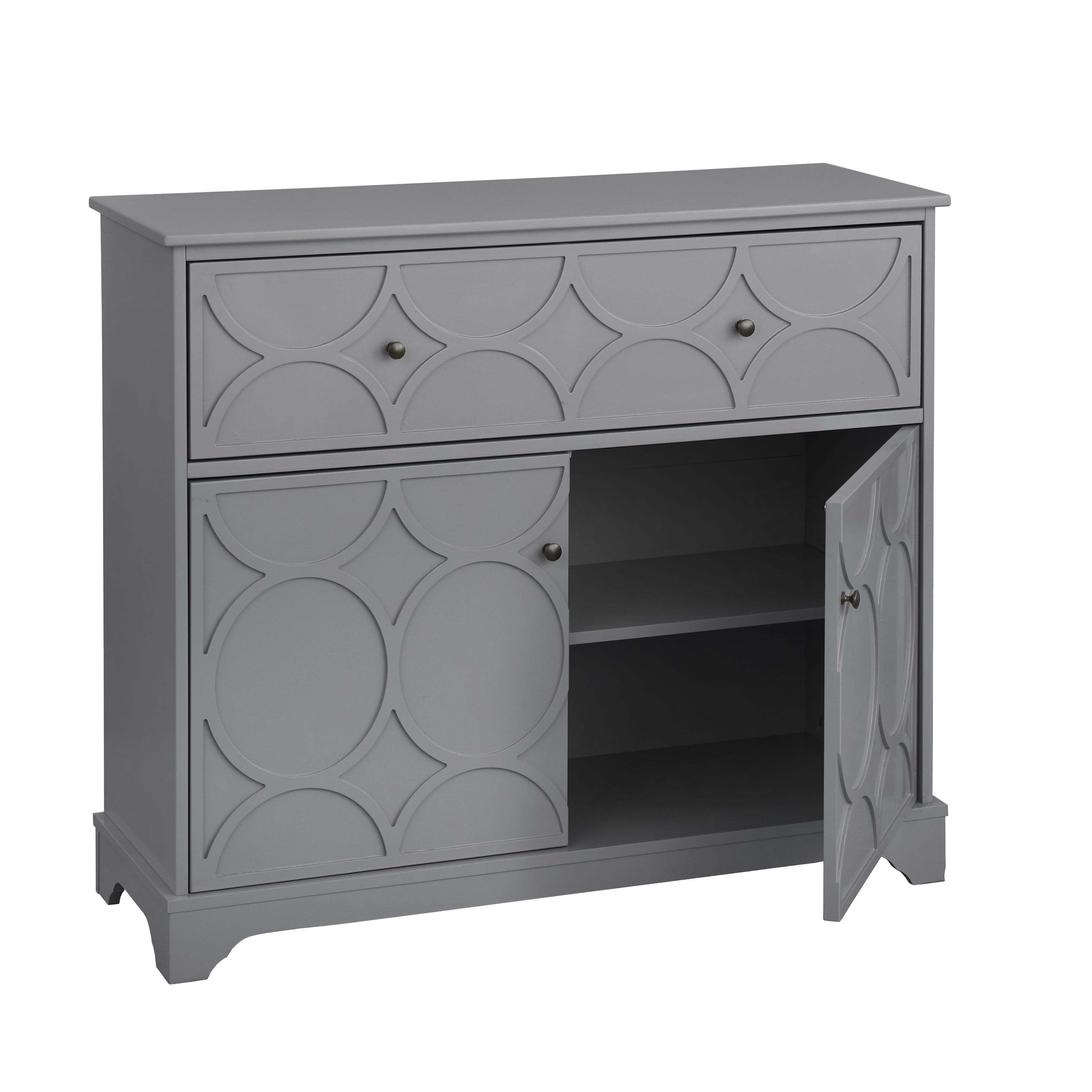 Dawson Circle Front Cabinet is designed with an aesthetically pleasing geometrically intricate circle pattern Spacious cabinet has one (1) drawer and a double door cabinet with an adjustable shelf Constructed with medium density fiberboard Versatile, this cabinet can be placed in many areas of the home for various uses such as storage, bar cabinet and more Assembly required Cabinet overall dimensions: 42´x 15” 36.2”H Inner drawer dimensions: 39.6” x 11.8” x 9.5”H Cabinet dimensions without shelf: 39.5” x 13.5” x 20”H