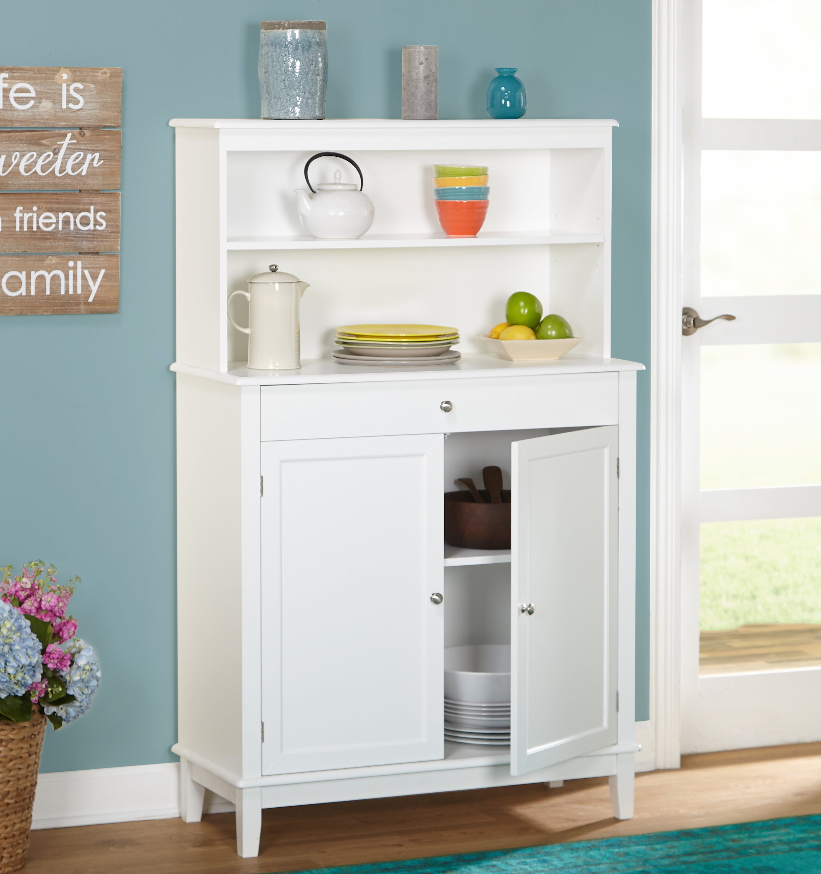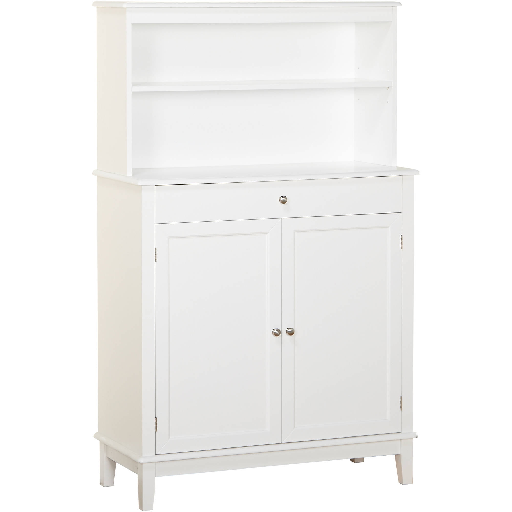 Store your dining and kitchen accouterments in this buffet and hutch arrangement. An adjustable shelf allows concealed storage, as the single drawer is ideal for serving accessories. Display a few of your favorite things on the single-shelf hutch to save space in your kitchen. Features: Crafted of engineered woods Includes 1 buffet with hutch 1 buffet drawer 1 adjustable shelf behind 2 doors 1 fixed hutch shelf Crisp, clean white finish for modern charm Weighs 97 lbs. altogether Dimensions: Overall: 58 inches high x 36 inches wide x 15.75 inches deep Top buffet shelf: 6.25 inches high x 33.5 inches wide x 10.3 inches deep Bottom buffet shelf: 9.75 inches high x 33.5 inches wide x 15.6 inches deep Drawer: 2.5 inches high x 29.75 inches wide x 12.8 inches deep Cabinet: 26.6 inches high x 33.5 inches wide x 15.6 inches deep