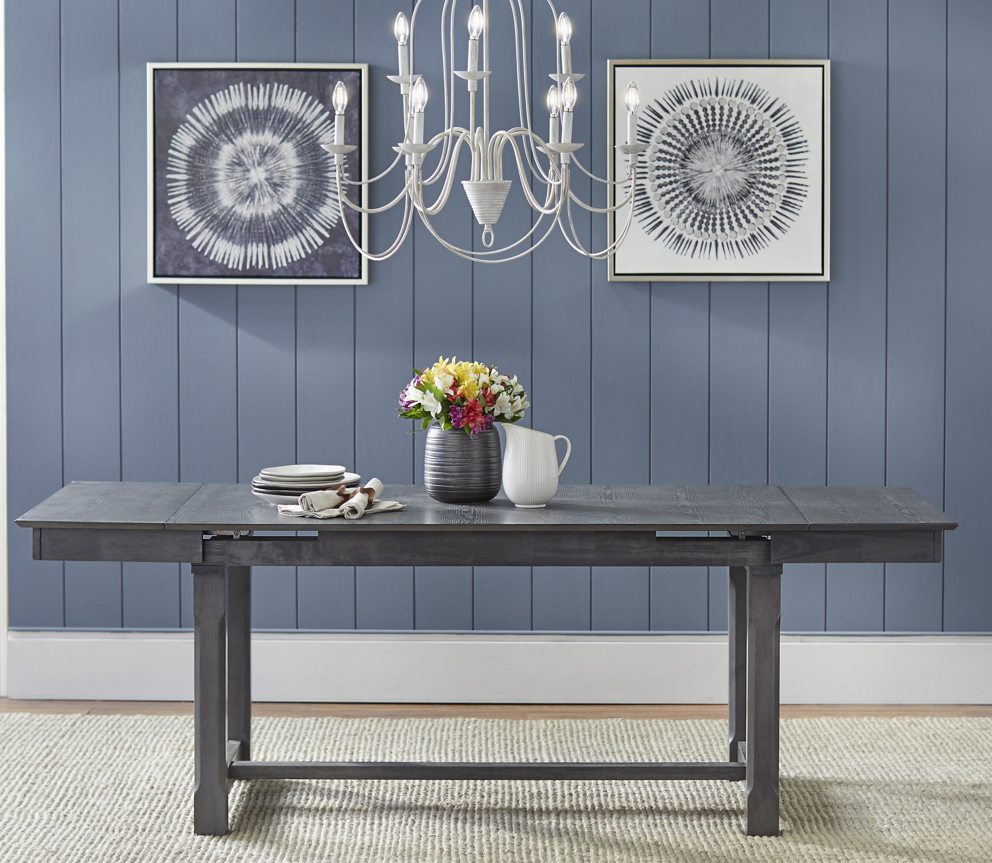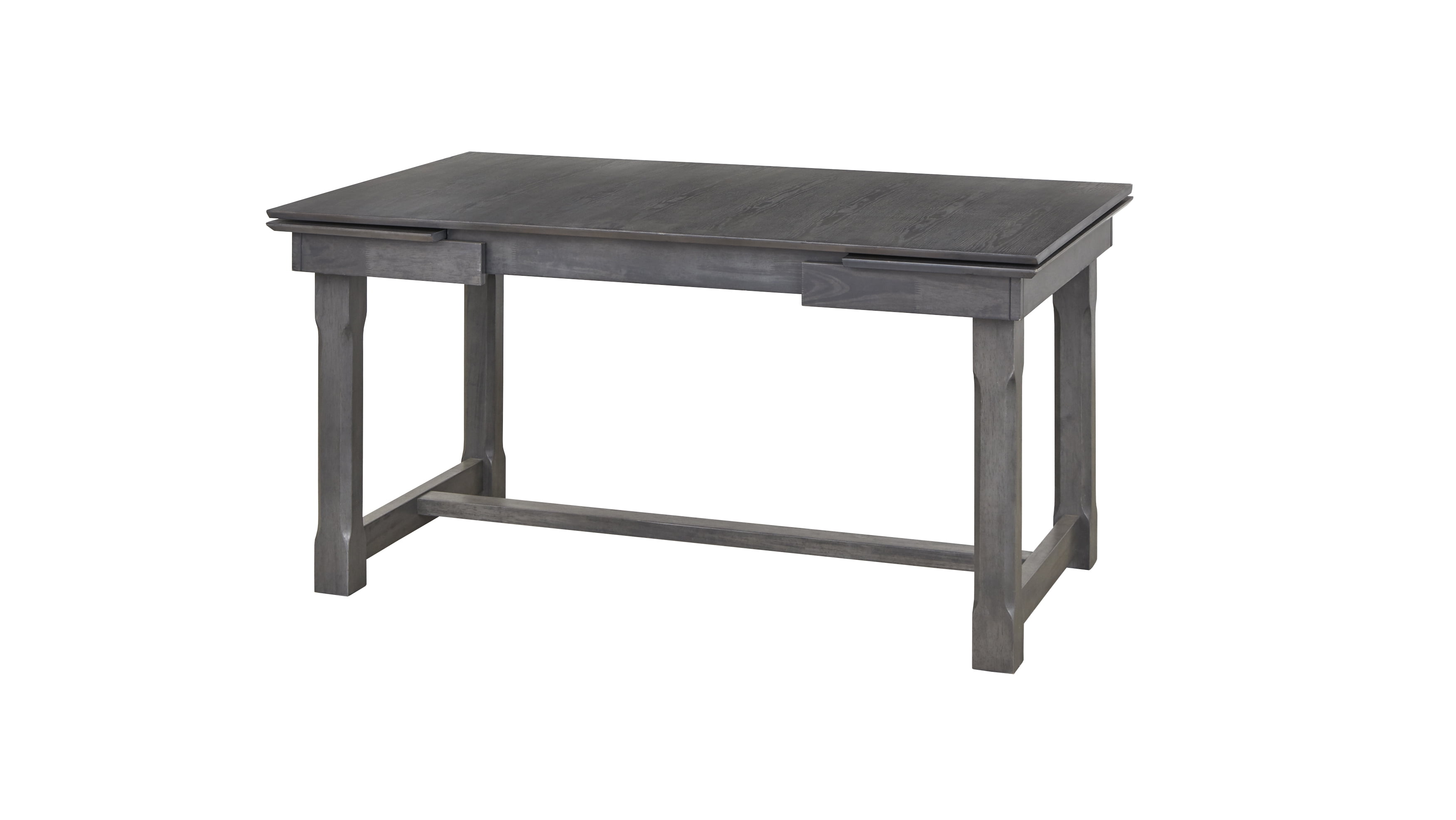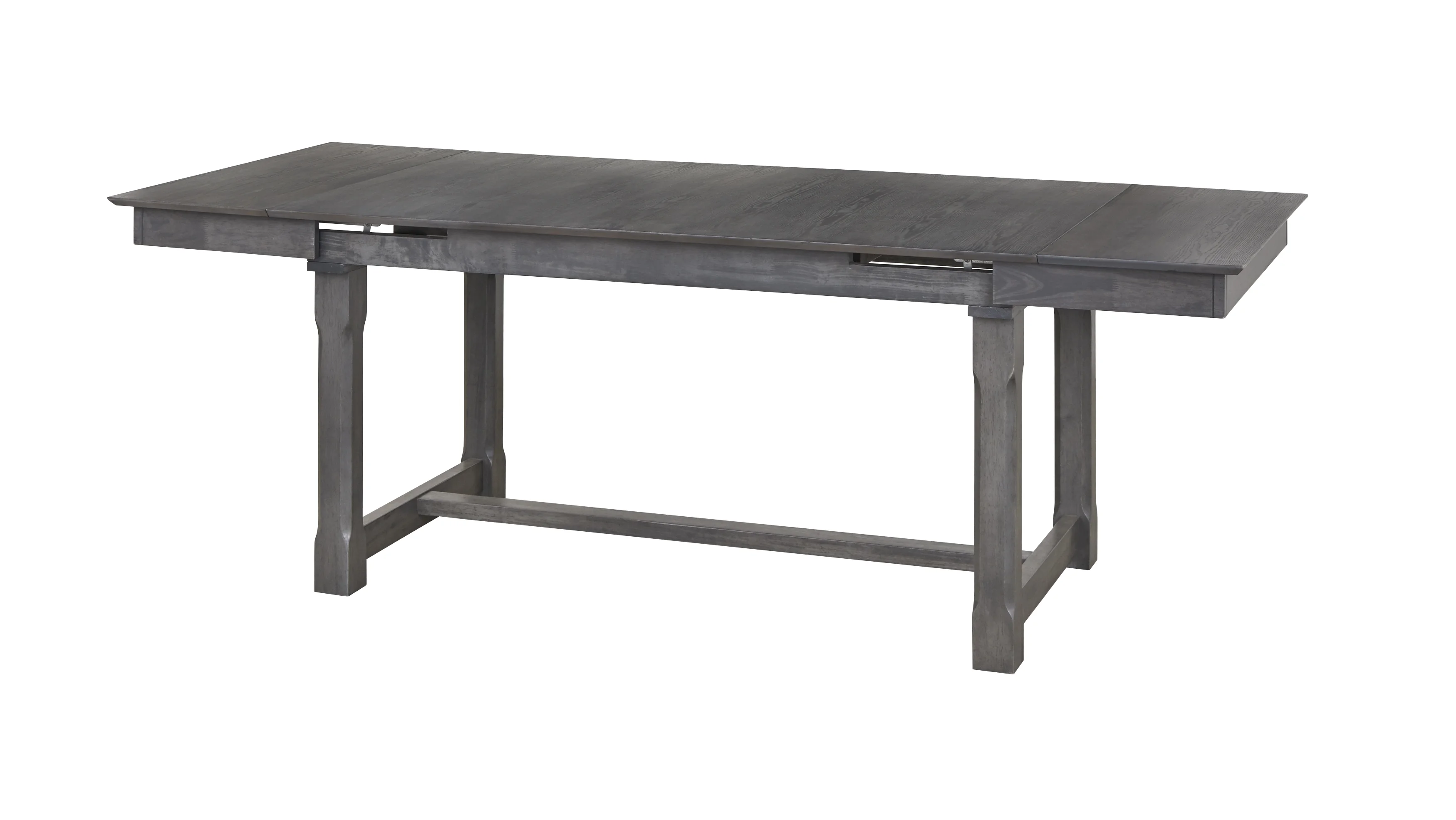 Riga Expandable Dining Table Includes: one (1) table with two expandable (2) leaves Modern Farmhouse inspired style Supportive trestle base dining table Table expands from 59 inches to 86.6 inches with two (2) leaves Seats six (6) comfortably Table constructed with MDF top and solid Rubberwood legs Rustic Weathered Gray finish Ships in two (2) cartons, assembly required Table overall dimensions: 29.9 inches high x 59-86.6 inches wide x 35.5 inches deep