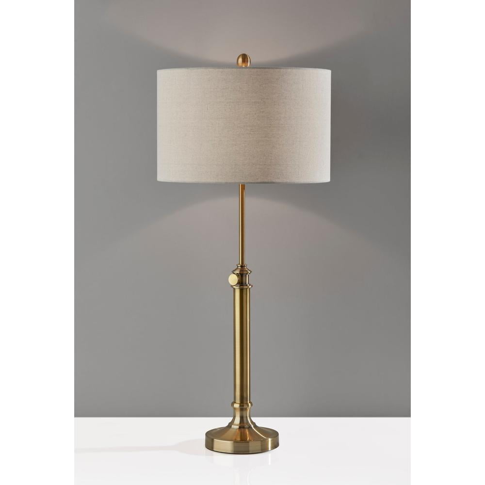 Antique Brass Finish Adjust the height from 26-34.5 with a decorative joint Oatmeal linen fabric shade This lighting product is either UL or ETL listed, meaning that it has been tested and approved to meet the government-regulated safety standards for the USA.