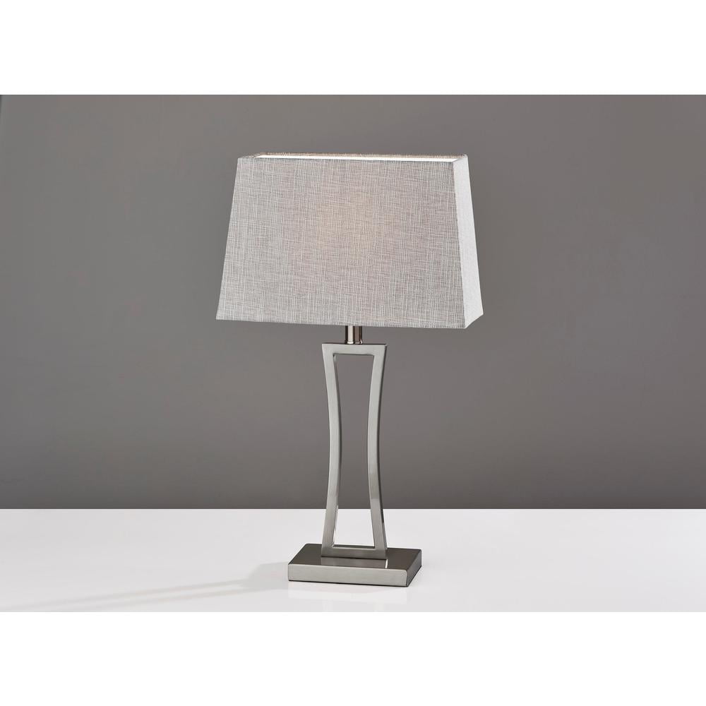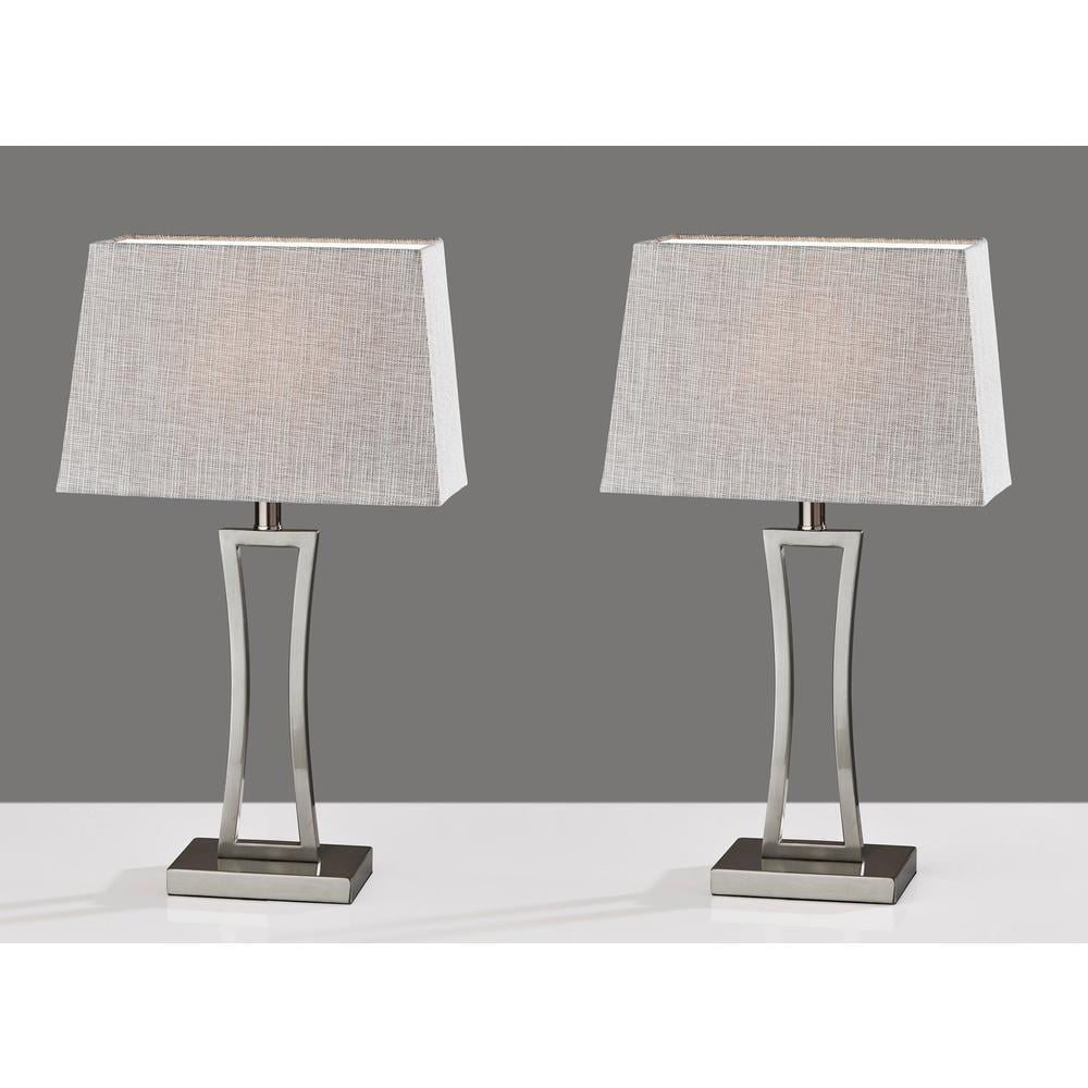 Camila Table Lamp (Set of 2) Create a modern matching look with the Camila 2 Piece Table Lamp. Each lamp features a brushed steel open rectangular frame. Mimicking the rectangular shape of the base, the lamp shades are made up of an eye catching mixture of white and grey woven fabrics. At a 24.25 height, these lamps are perfect for each end of the bedside or a console table. A simple rotary switch is located on the socket controlling a 100W bulb (not included). Two lamps for the price of one! 24.25 Height Grey & White Textured Fabric Shade This lighting product is either UL or ETL listed, meaning that it has been tested and approved to meet the government-regulated safety standards for the USA. – Finish: Brushed Steel – Dimensions: 14”W x 8”D x 24.25”H – Collection: Camila – Item Depth: 8 – Item Height: 24.25 – Item Width: 14 – Item Weight: 8.8 – Item Color: Silver – Indoor/Outdoor: Indoor – Bulb: 100W Type A Bulb (Not Included) – Design/Style: Modern Chic – Item Material: Metal:60% Fabric:30% Electrical part:10%