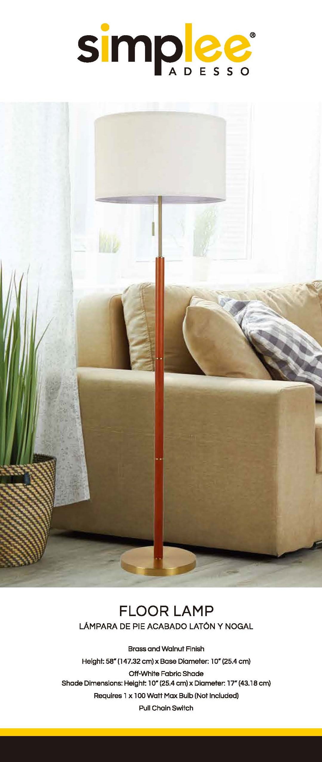 AF40804 is 58in Overall HT Floor Lamp Transitional Styling Adult and Young Adult use Wood and Brass Finish 17″ D x 17″ W x 10’H Fabric Shade Simplee Adesso Brand
