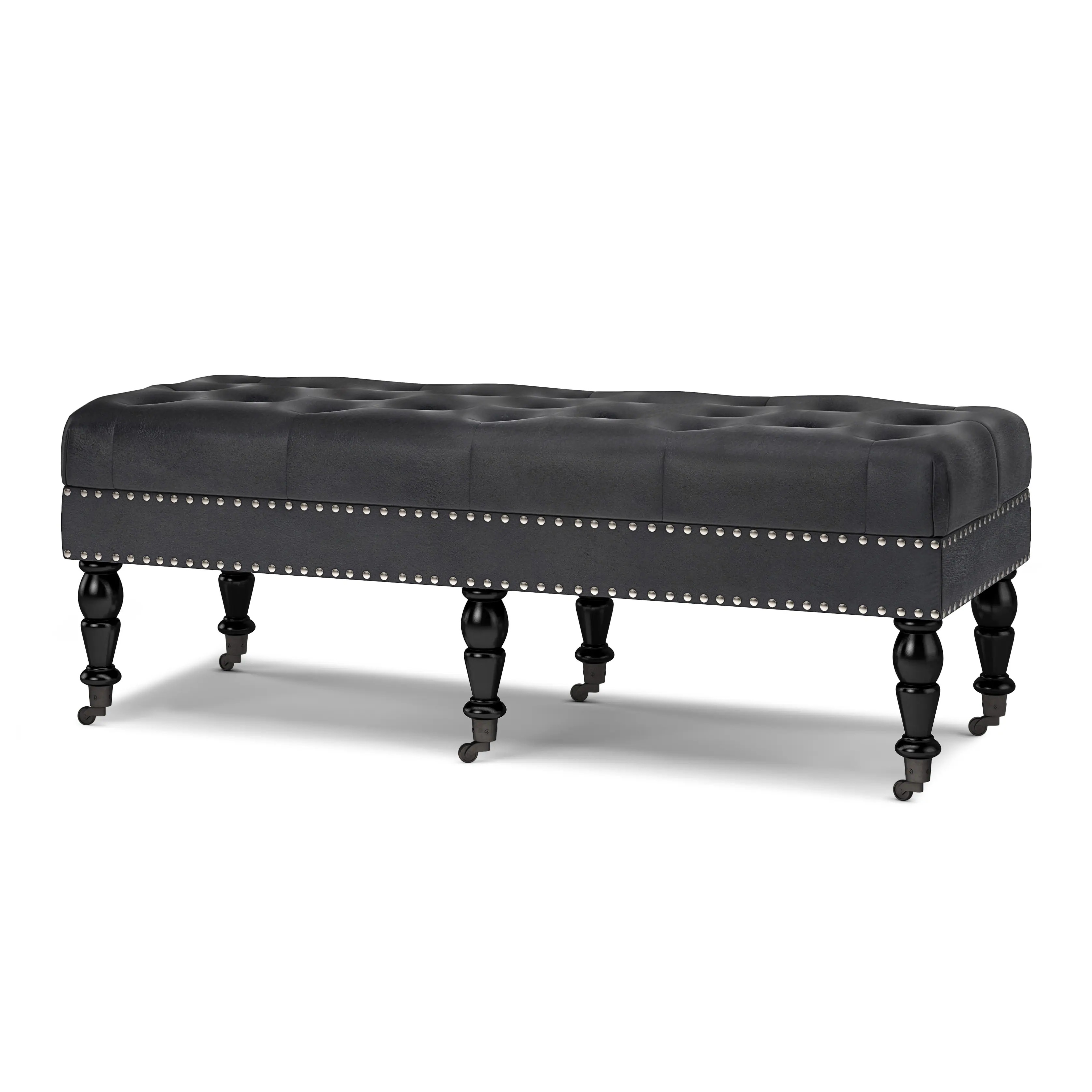 Roll this regal tufted ottoman bench into any room that needs a touch of sophisticated elegance. Position the Henley Ottoman Bench at the foot of your bed or place it your living room, den or great room. Durable Faux Air Leather or Fabric combines with tufting, Antique Brass nail head trim and dark Brown turned legs to create a breathtaking accent piece for just about any room in your home.