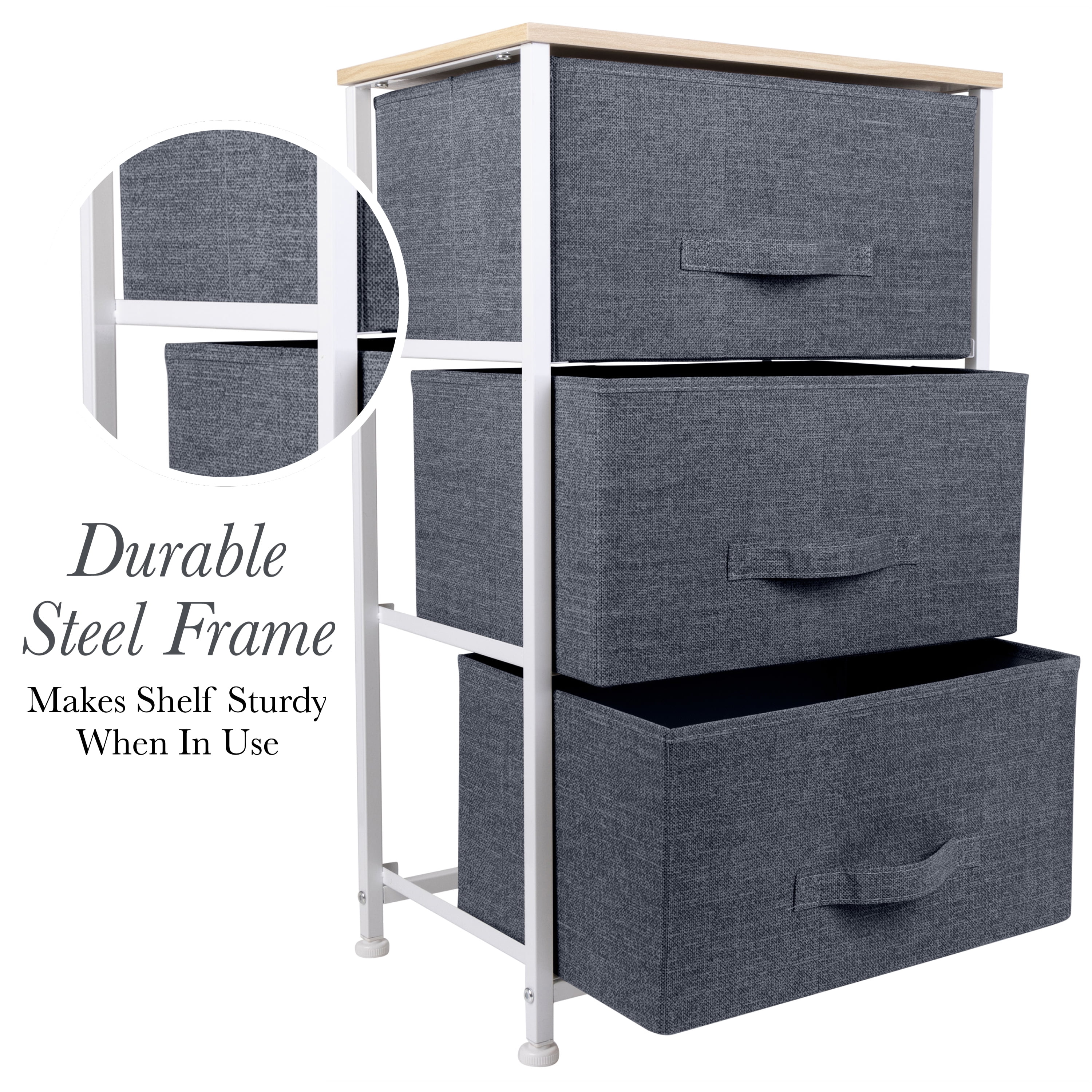 Add extra drawer space anywhere with the Simplify Adult 3 Drawer Storage Chest. Designed with 3 breathable non-woven drawers and a work top surface, this is the perfect addition to any room in the house. This piece would be perfect in a closet or bedroom. This chest has a durable steel frame which allows it to be sturdy when in use yet easy to transport from room to room. The chest is easy to assemble and all hardware is included.