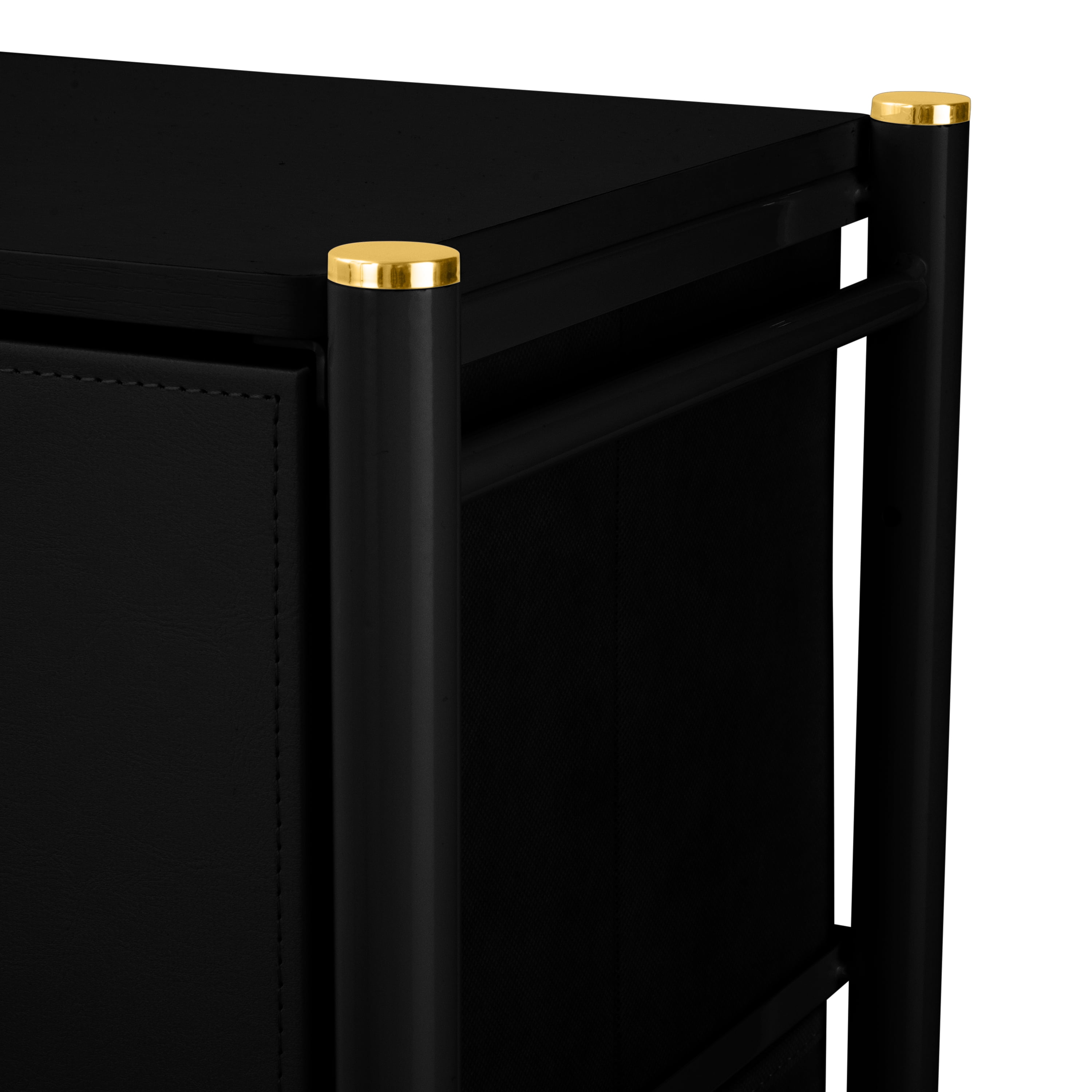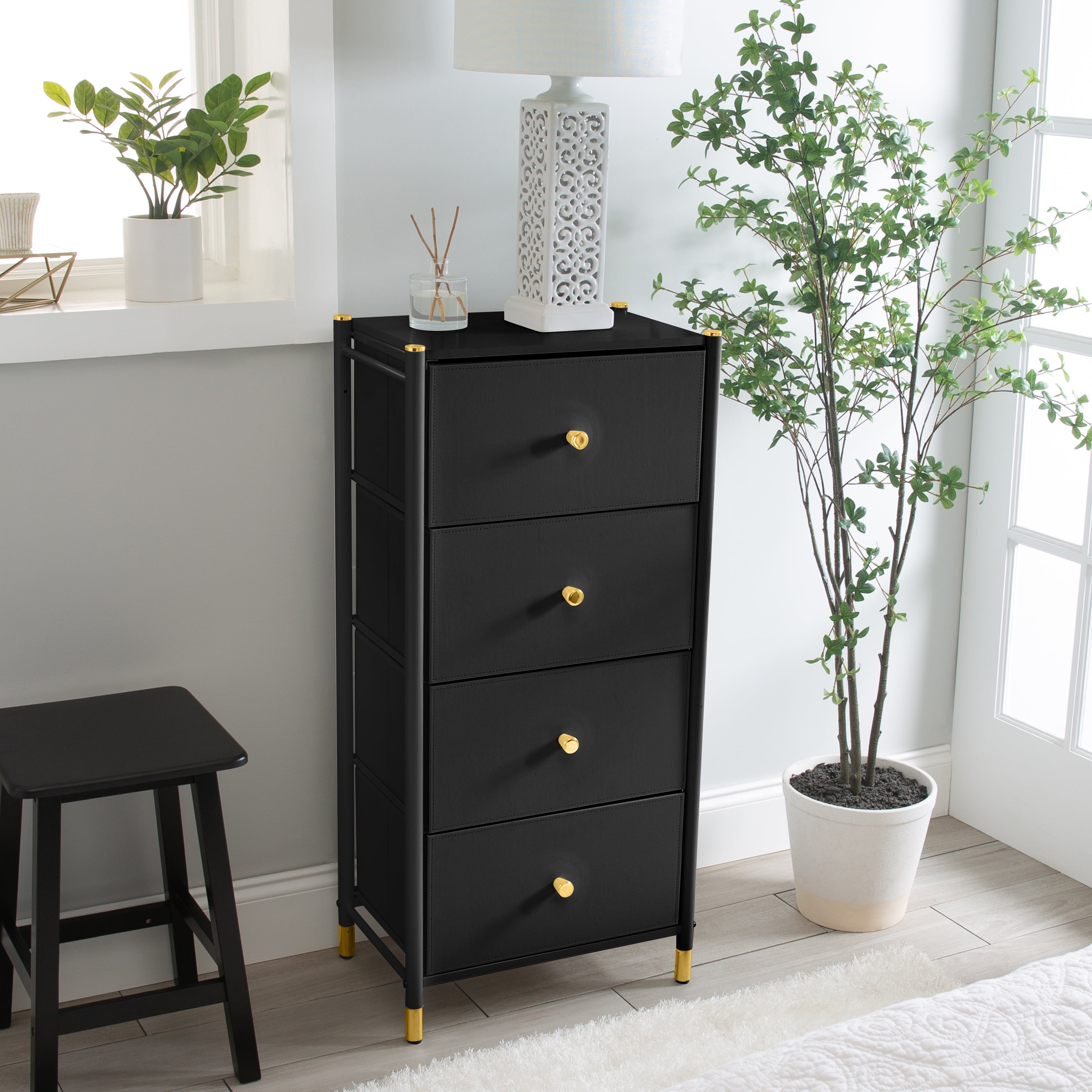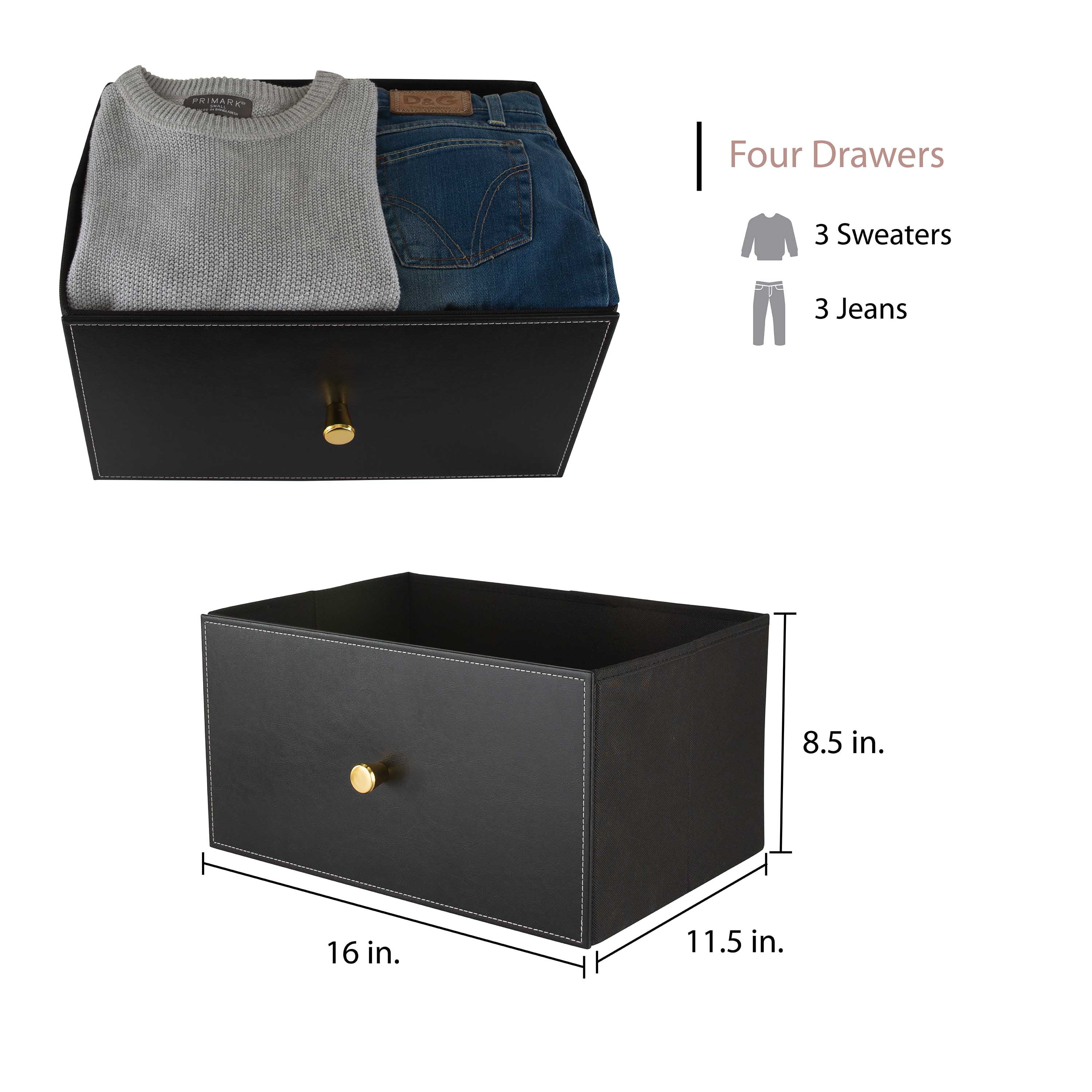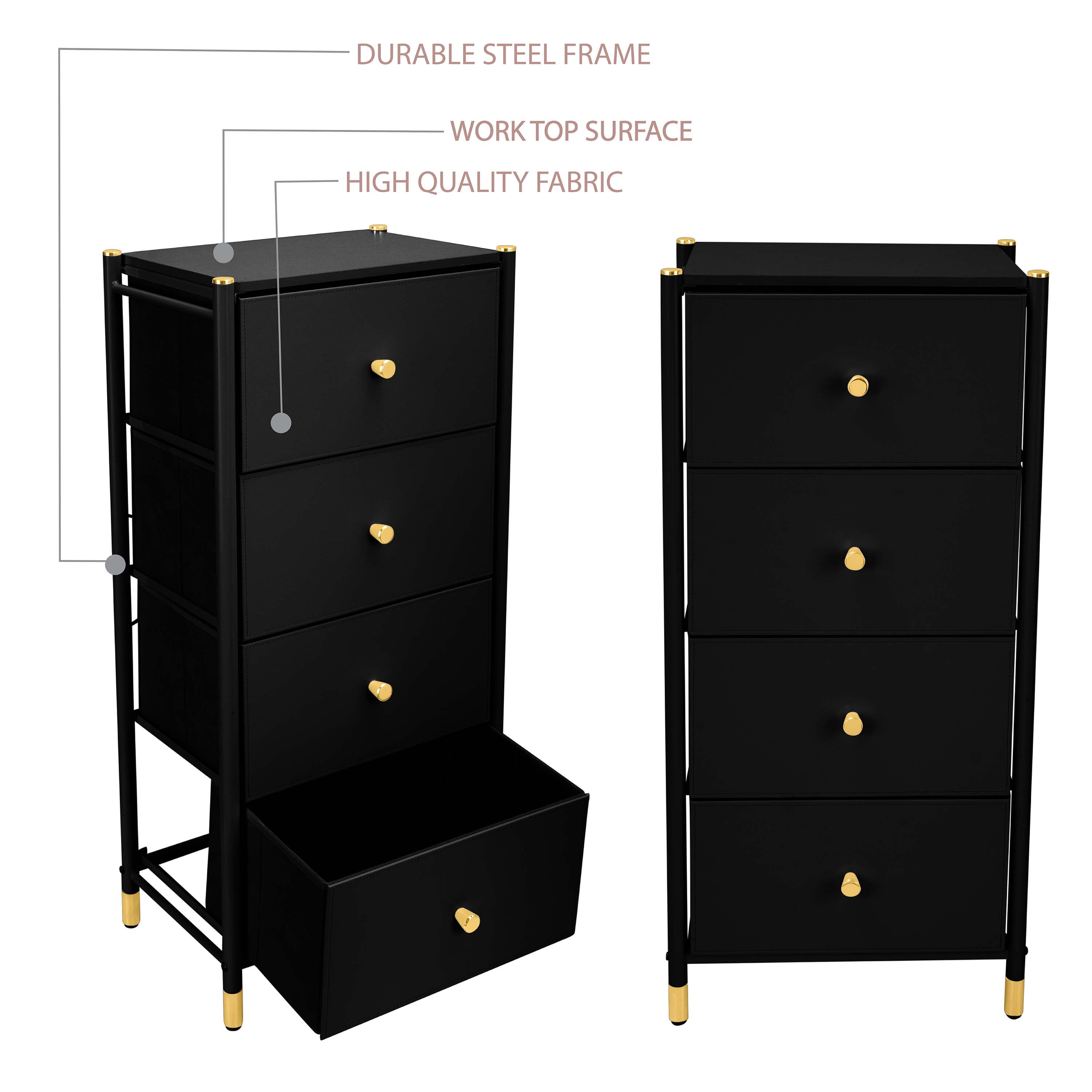 Simplify Adult 4 Drawer Luxury Dresser Dimensions: 18″x 12″x 39″ Durable Steel Frame with Solid, Work Top Surface Leather-Look Material with Gold Accents Removable Drawers Easy to Assemble, All Hardware included