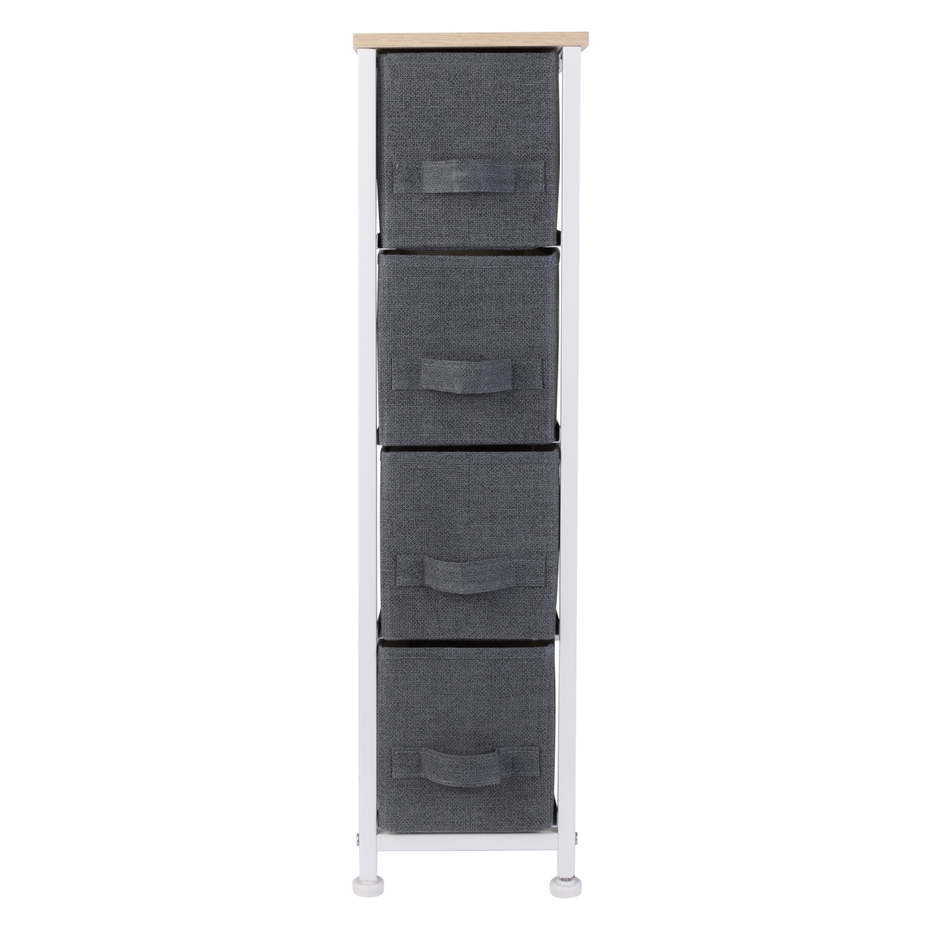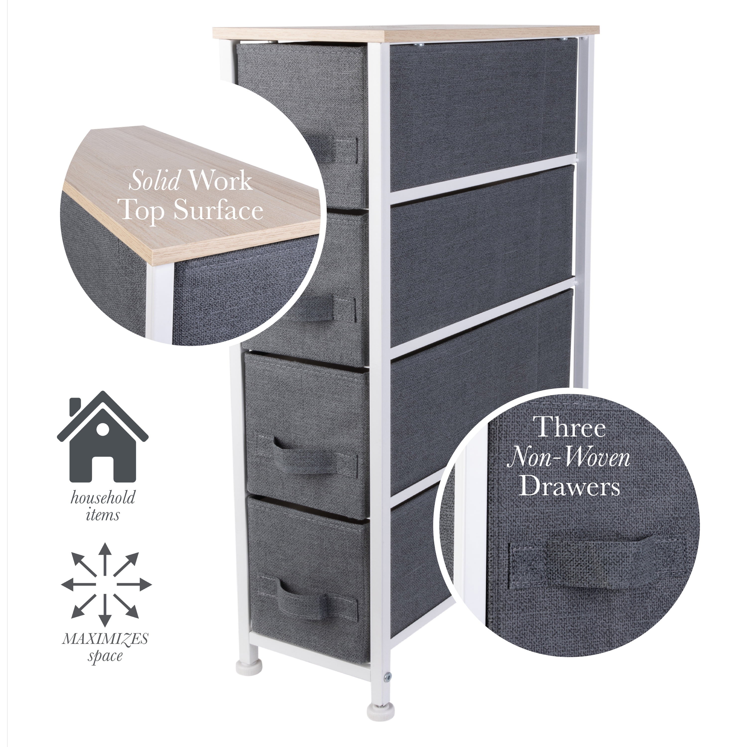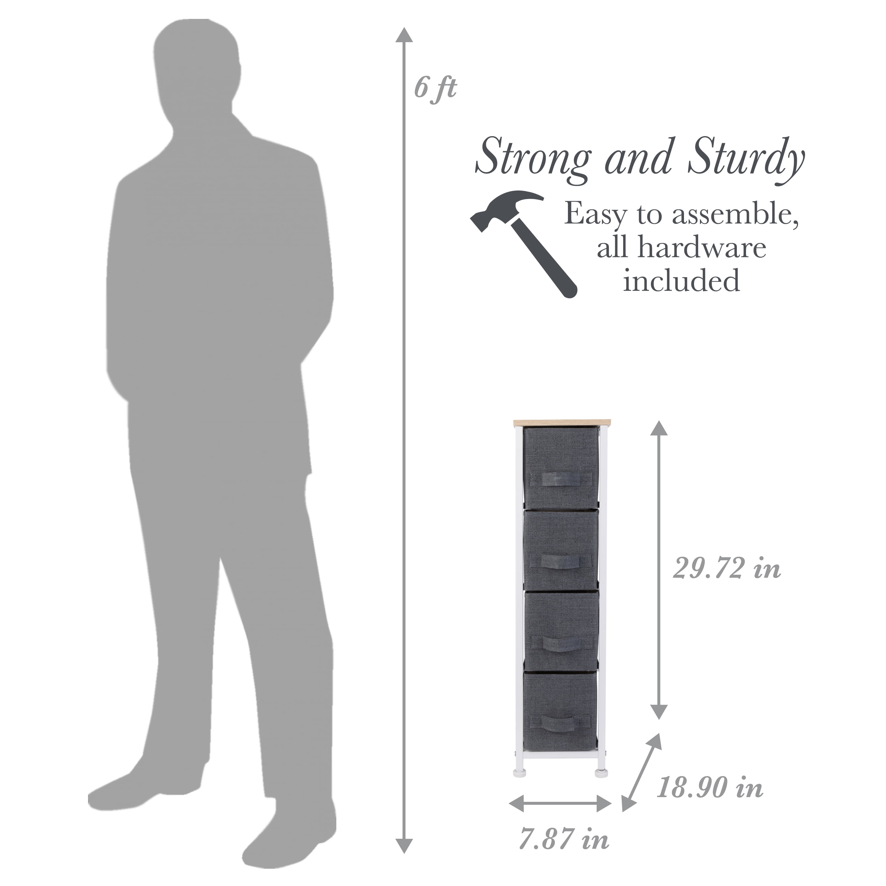 Simplify 4 Drawer Narrow Storage Chest in Grey Dimensions: 7.9″x 18.9″x 29.7″ Four breathable, non-woven drawers Durable steel frame with solid, work-top surface Easy to assemble, all hardware included Printed jute drawers Color: Grey