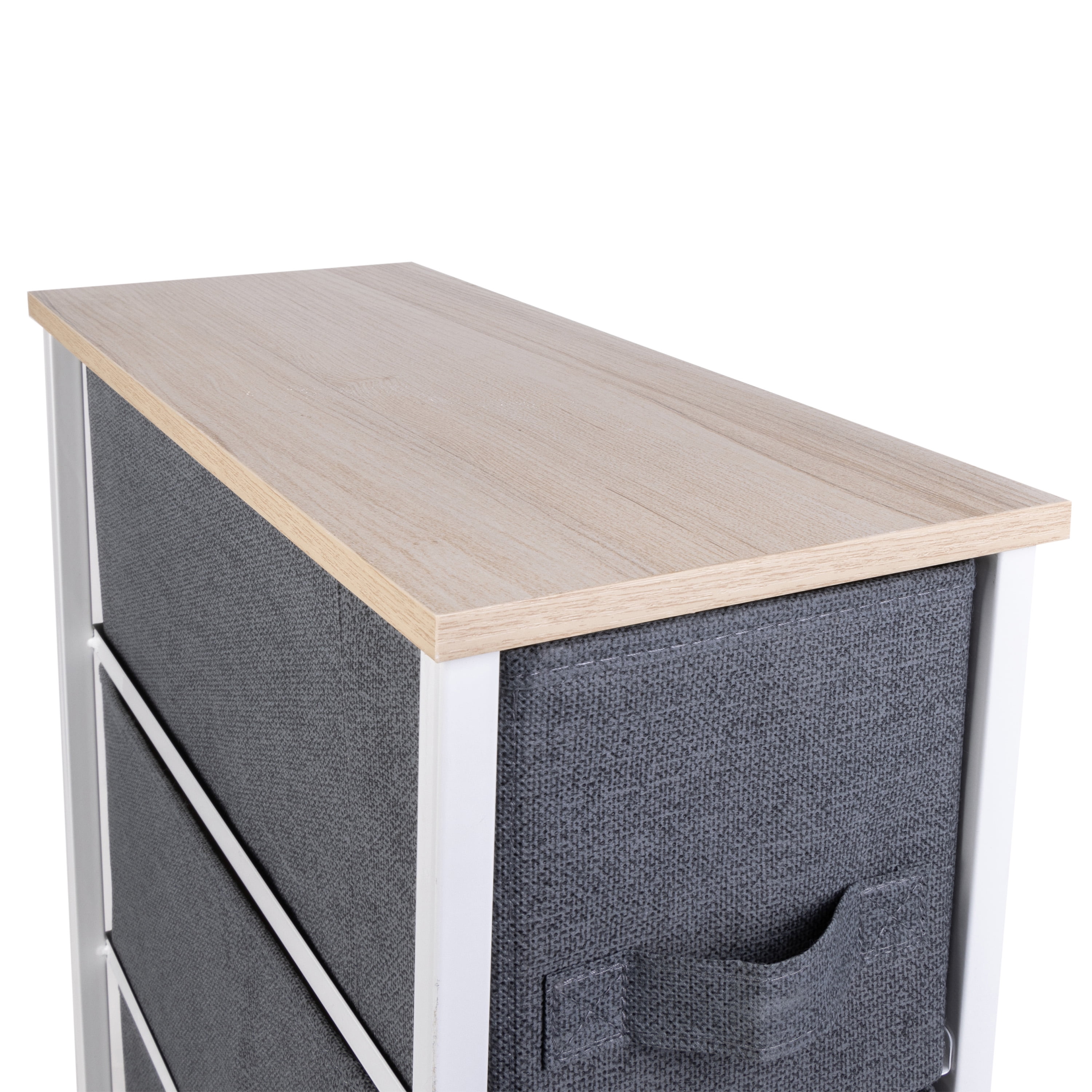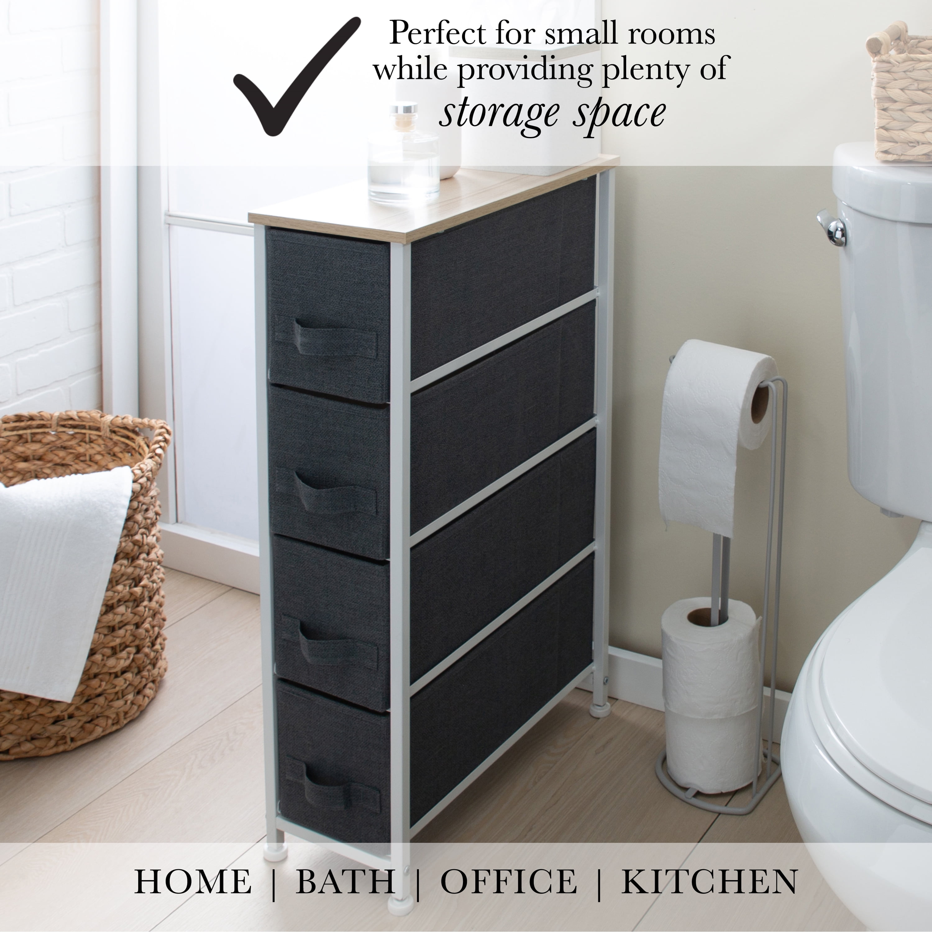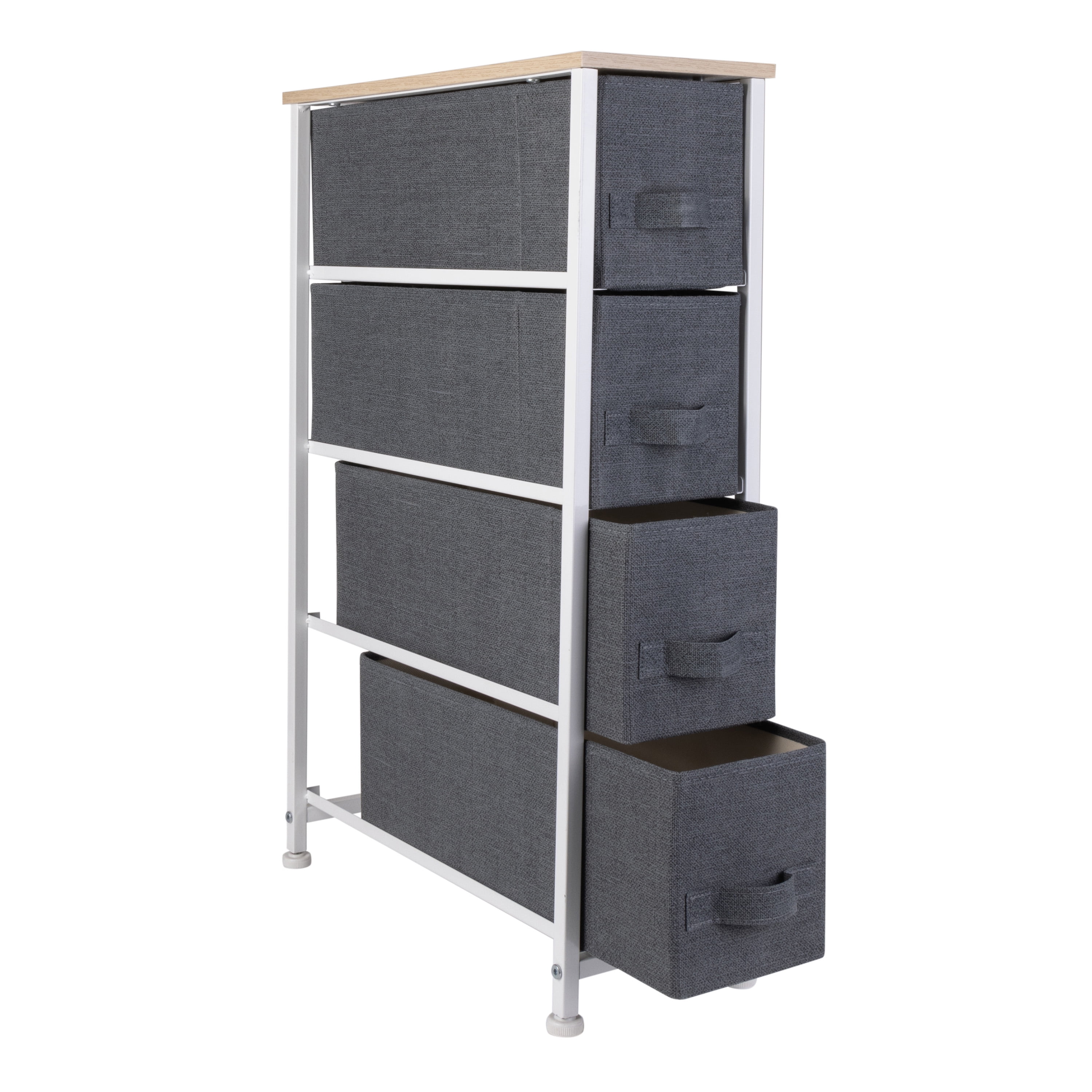 Simplify 4 Drawer Narrow Storage Chest in Grey Dimensions: 7.9″x 18.9″x 29.7″ Four breathable, non-woven drawers Durable steel frame with solid, work-top surface Easy to assemble, all hardware included Printed jute drawers Color: Grey