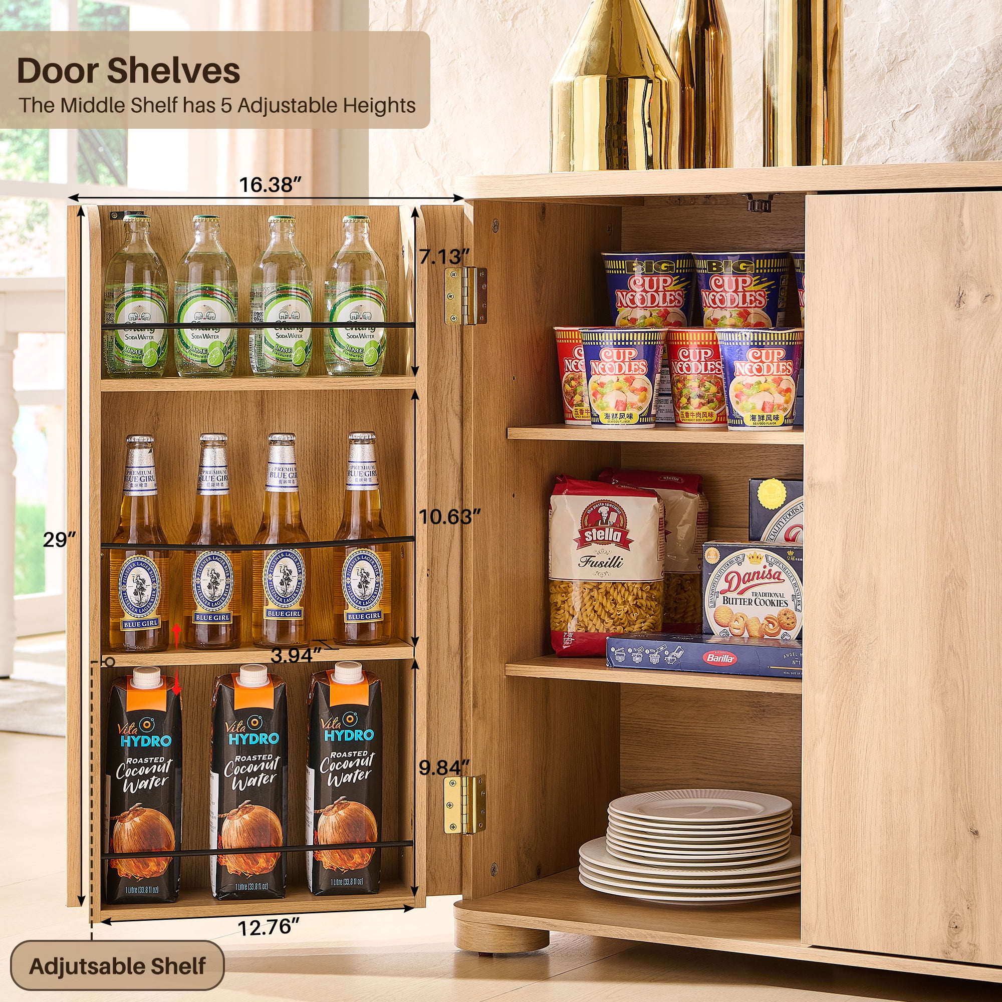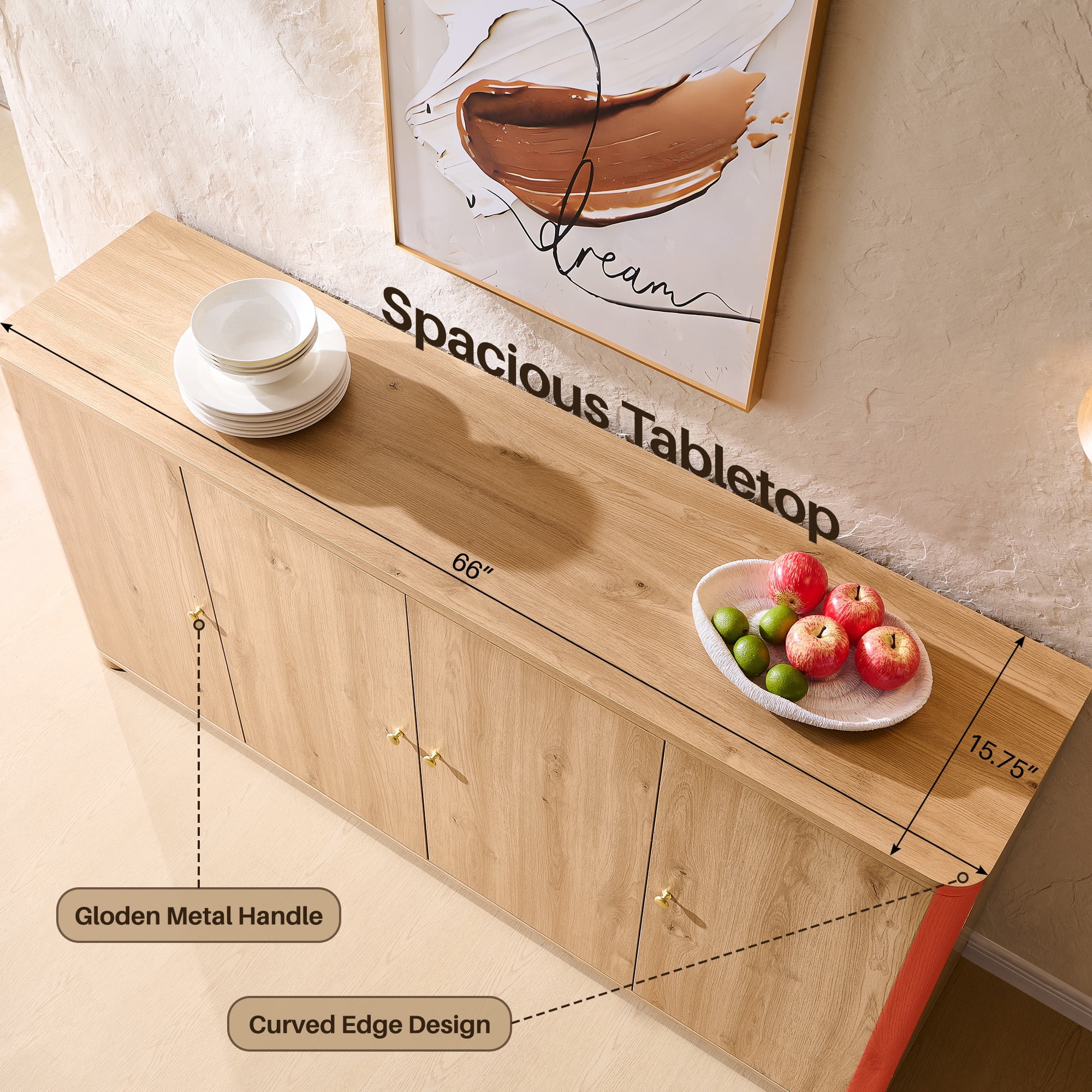 Feature: Contemporary Design with Ample Space: The buffet sideboard cabinet, measuring 66″W x 15.75″D x 32″H, combines a modern look with generous storage capacity. Its curved edges and clean lines give it a charming appearance that fits well in kitchens, dining rooms, or living rooms. This cabinet is designed to store a variety of items, from pantry essentials to small appliances, with ease. Durable Top Surface for Heavy Loads: The cabinet features a top surface that can bear up to 120 lbs, making it suitable for placing heavy small appliances like coffee makers and microwaves. The surface is scratch-resistant and waterproof, ensuring it remains durable and easy to clean, maintaining its appearance over time. Enhanced Safety with Curved Edges: The cabinet’s curved edge design not only adds to its aesthetic appeal but also enhances safety by reducing the risk of physical injuries from accidental collisions. This thoughtful design detail makes the cabinet a practical choice for homes or for those who value safety in their living spaces. Customizable Storage with Adjustable Shelves: Inside, the coffee bar counter offers four doors and six adjustable shelves, along with three additional storage shelves integrated within the side doors. This setup allows for a high degree of customization, enabling you to tailor the storage space to your specific needs and optimize both functionality and spatial efficiency. Sturdy and Long-Lasting Construction: Constructed from premium engineered wood, this kitchen buffet cabinet is built to last. It offers reliable stability and durability, ensuring that it will remain a sophisticated and functional piece of furniture in your home for years to come. The quality of construction not only adds a touch of elegance but also guarantees long-lasting use. Specifications: Brand: SinCiDo Color: Brown/Dark Grey/White/Natural/Light Grey Product Dimensions: 15.75″D x 42″W x 32″H Special Feature: Curved Doors Mounting Type: Free Standing Package included: 1x Curved Buffet Cabinet Notes: When receiving the goods, please confirm the product according to the listing of instructions. Once you find less pieces, please provide relevant pictures to contact us. We will deal it in the time. Please install goods with the instruction manual.