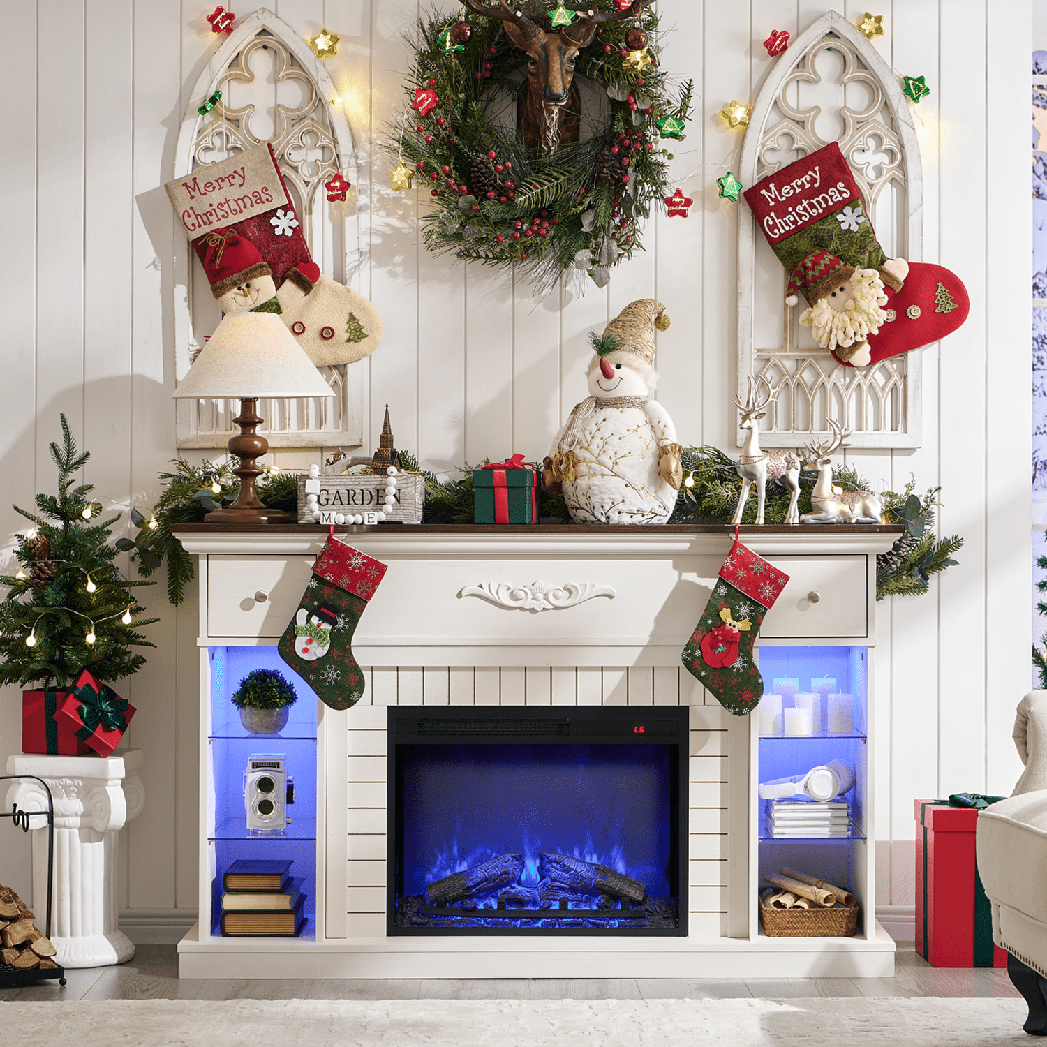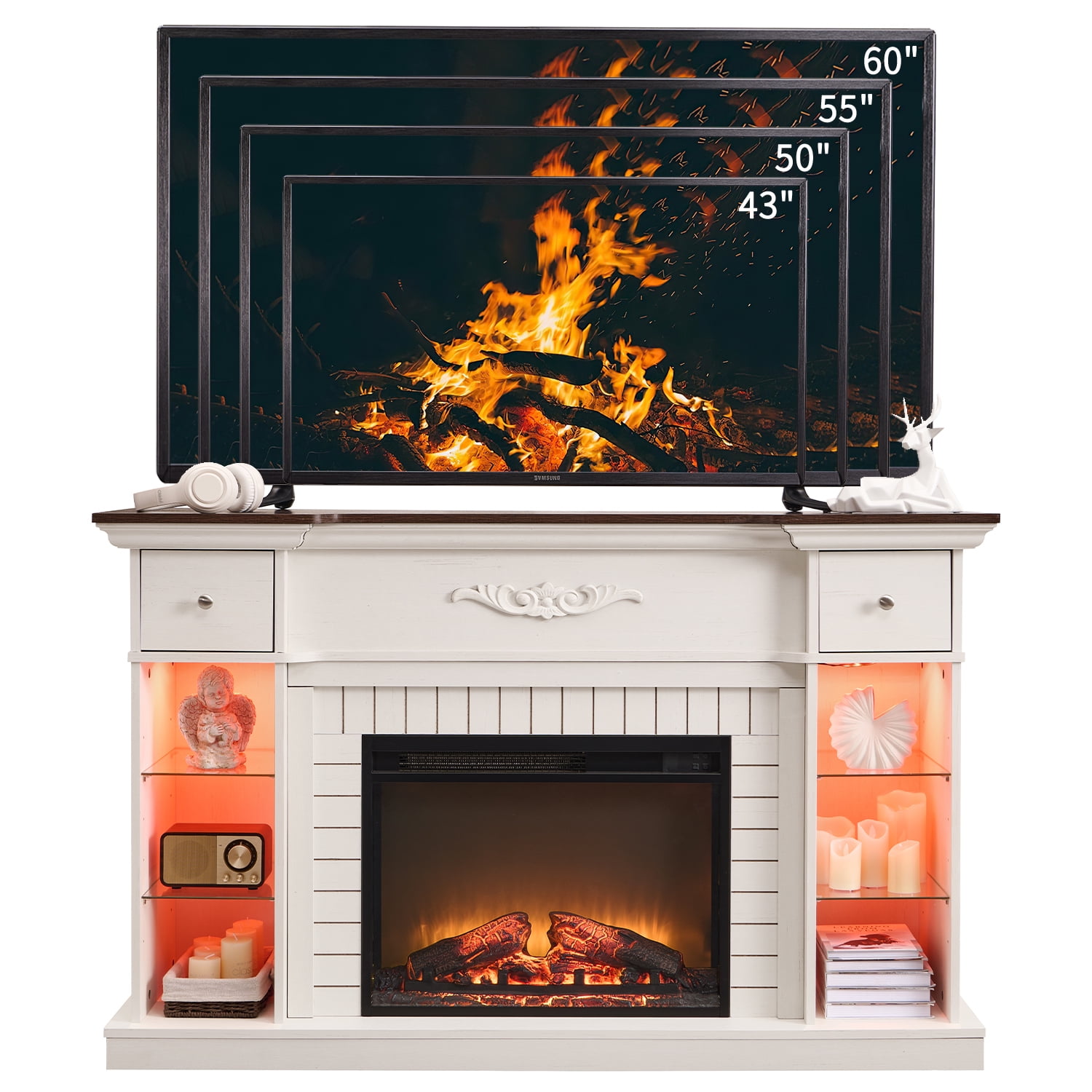 SinCiDo Electric Fireplace TV Stand for 65 Inch TVs, Farmhouse LED Entertainment Center w/7 Colors Changing and Adjustable Shelves