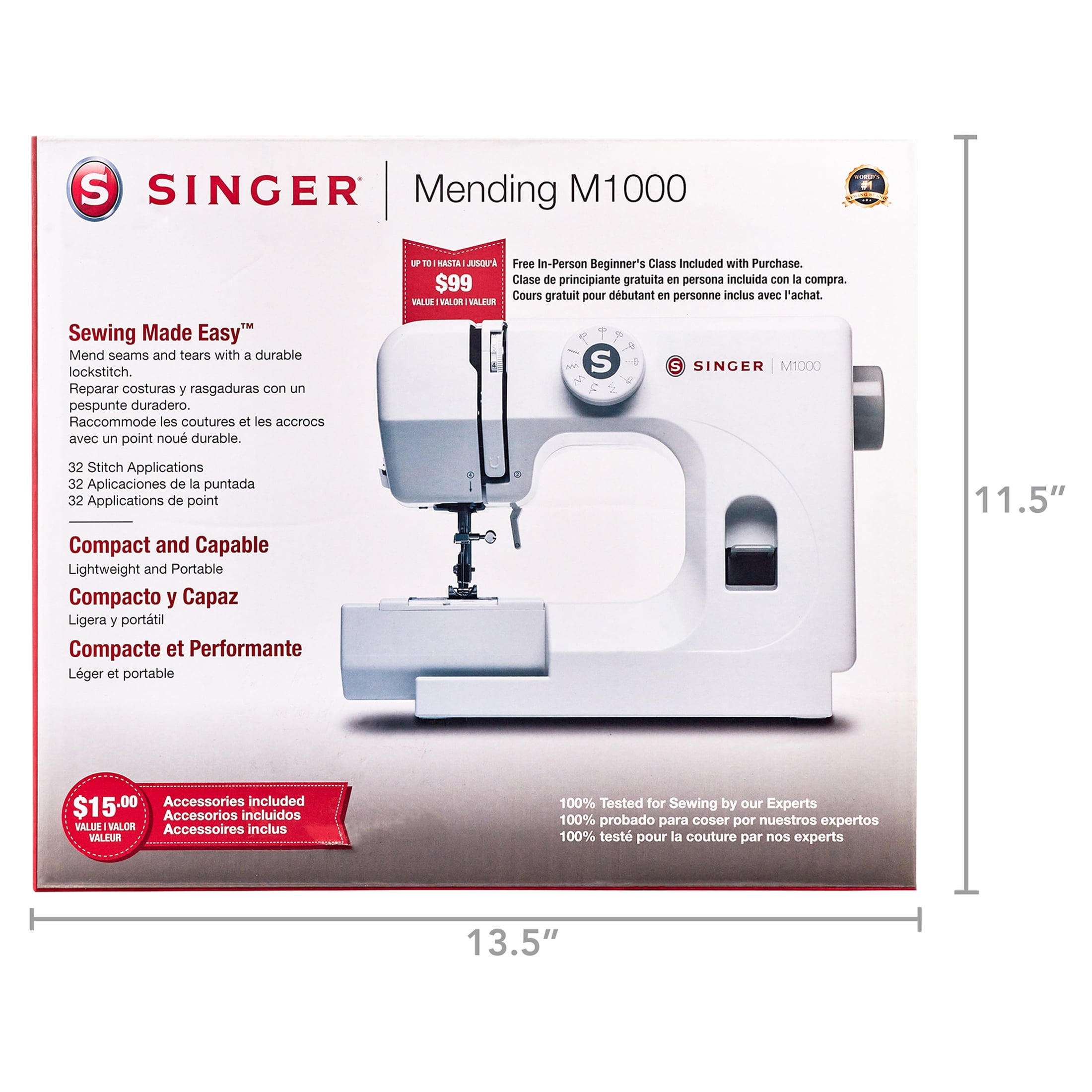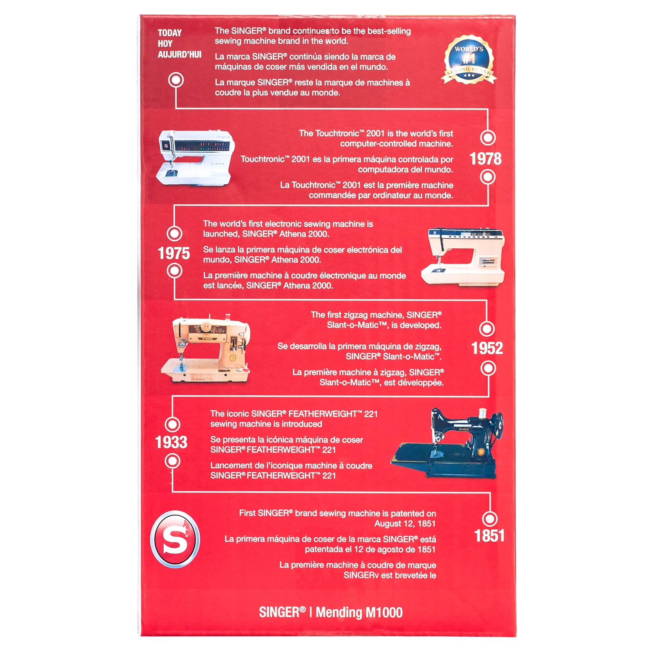 The SINGER® M1000 mending machine is only 5.5lbs (2.5kg), making it a lightweight, portable sidekick for the sewist-on-the-go! An affordable machine with easy set-up, a portable size, preset stitch settings, and 32 stitch applications that will assist you with simpler mending and garment repairs. For thicker fabrics and more applications, a full-size machine is recommended. 32 Essential Stitch Applications: Straight Stitch – with options for different stitch lengths and needle positions Zigzag – wide, medium and narrow sizes Multi-step Zigzag – for elastic insertion, seam finishing, or decorative stitches Blindhem Stitch – for blind hemming Features $25 included accessories 32 Stitch Applications to cover your basic sewing needs Repair seams and create durable hems Lightweight and portable, great for small spaces & easy to store! Top drop-in bobbin to easily insert & monitor bobbin thread supply Free arm to mend hems and cuffs with ease 4.25″ sewing space (needle to tower) and 3.75″ height Use SINGER Class 15 Transparent bobbins Stitch Applications (32): A Stitch Application simply means a specific sewing technique that you can do with a selected stitch. Basically, Stitch Applications are all the different things you can actually DO with your machine! Built-In Stitches (4): Choose from a variety of stitches for basic sewing, decorative sewing, and more. Top Drop In Bobbin (+): Easy to thread and easy to see! The transparent bobbin and cover allow you to monitor your thread supply so you don’t run out of thread in the middle of a seam. Easy Stitch Selection Dial (+): Built-in stitches are displayed on the Stitch Selector Dial. Simply turn the dial to select the stitch you want to sew. Adjustable Tension (+): Threads should be balanced in the fabric when stitches form. The machine’s tension control allows for adjusting the threads to fine-tune the look of the stitch, depending on the fabric and thread being used. Reverse (Lever): Sew stitches in reverse, usually done to secure a seam at the beginning and end to prevent unraveling. Free Arm (+): Slide off the Removable Storage Compartment for access to the free arm, making it easy to sew trouser hems, sleeve cuffs and other smaller or tubular projects. Extra High Presser Foot Lifter (+): Presser foot has an extra high position available to accommodate thick fabrics. Sewing Space (Needle to Tower) (4.25″): The distance between the needle and the main part of the machine. Having a generous “C” space allows you to sew larger projects like quilts with ease. Bobbin Class (15 Transparent): SINGER branded bobbins are recommended for best results. Warranty: (1yr / 25 yr) What’s Included? 32 Stitch Applications. A stitch application is a specific technique you can do with a selected stitch. Included Accessories ($25 value): All-Purpose Foot Extra Needle Bobbins: Class 15 (transparent) Manual Needle Threader