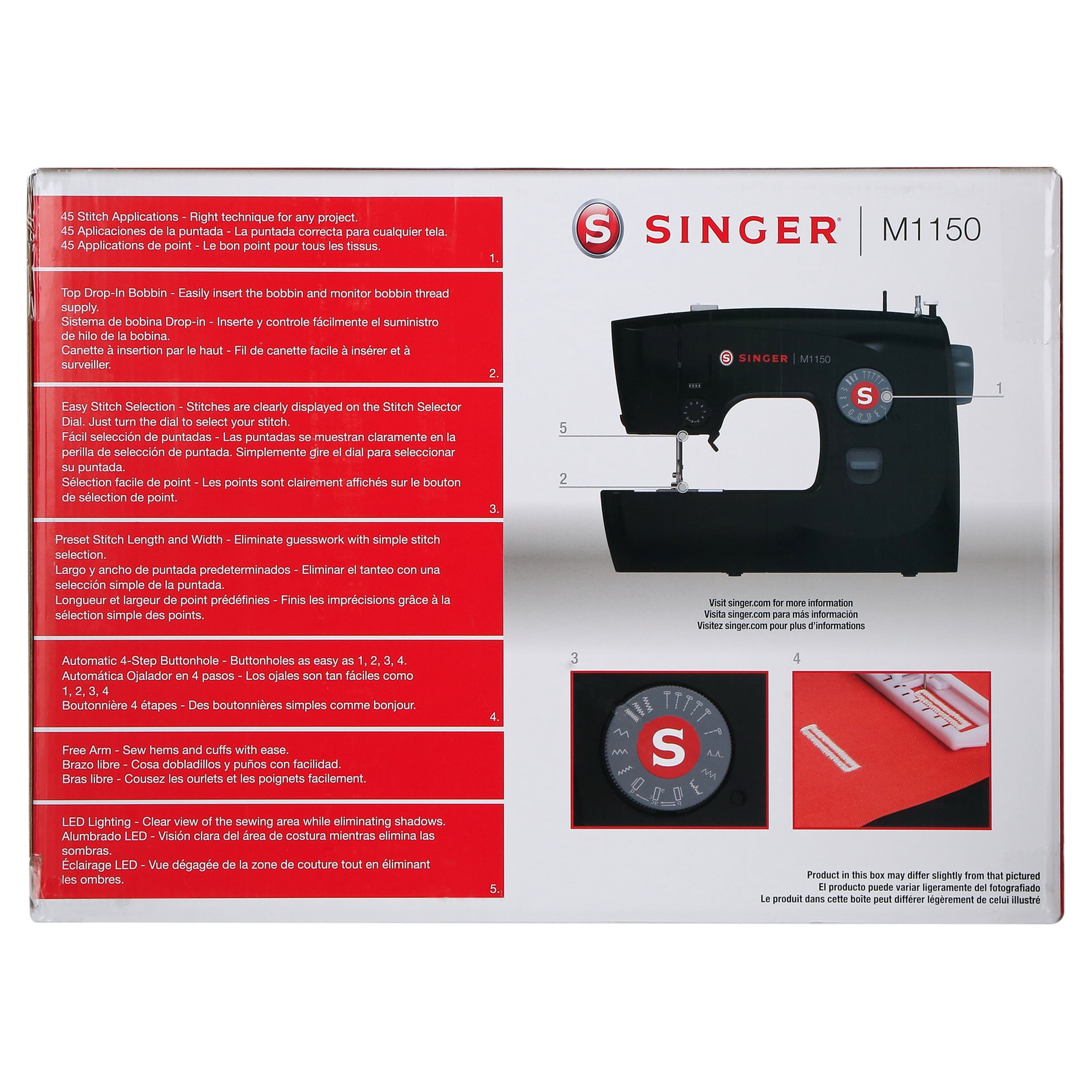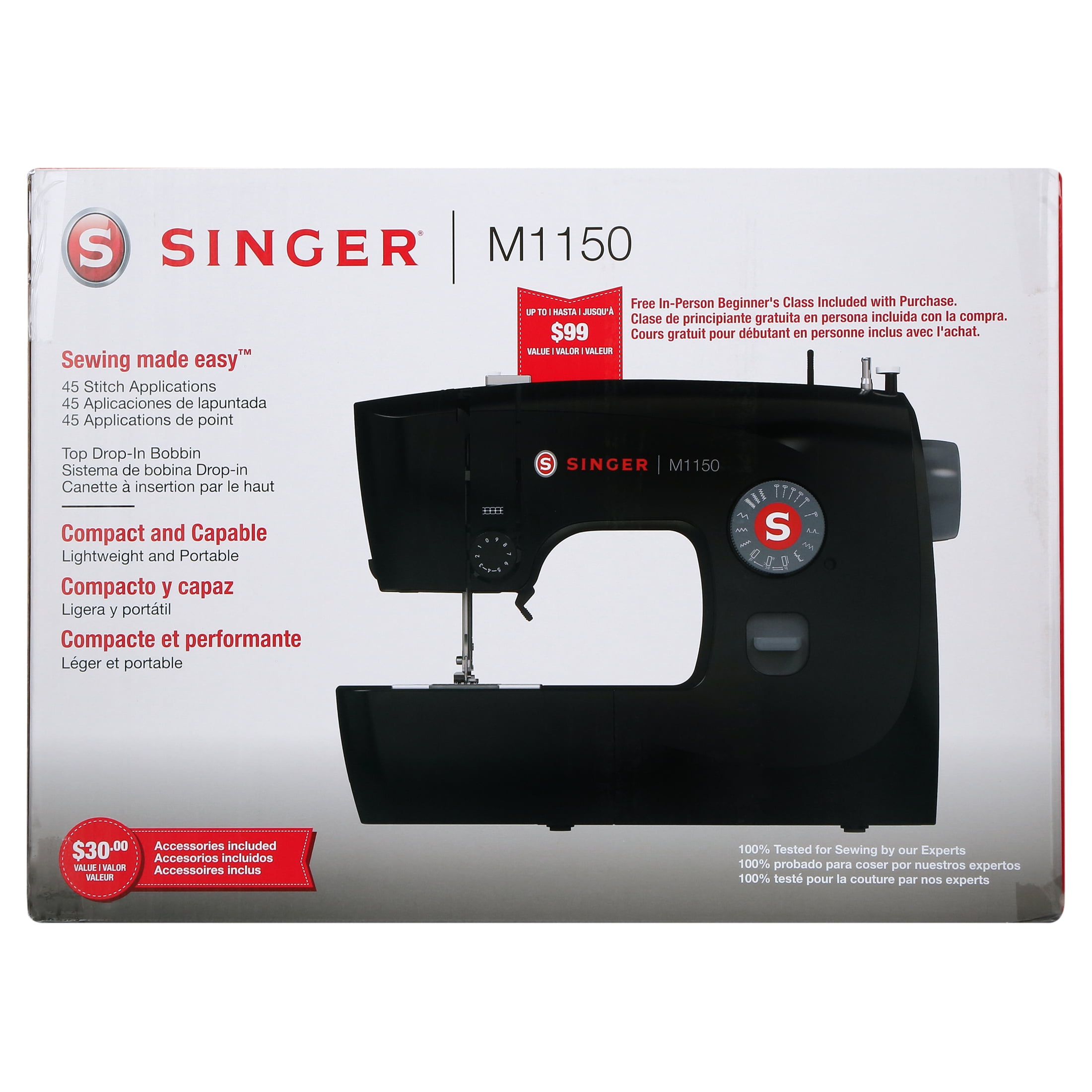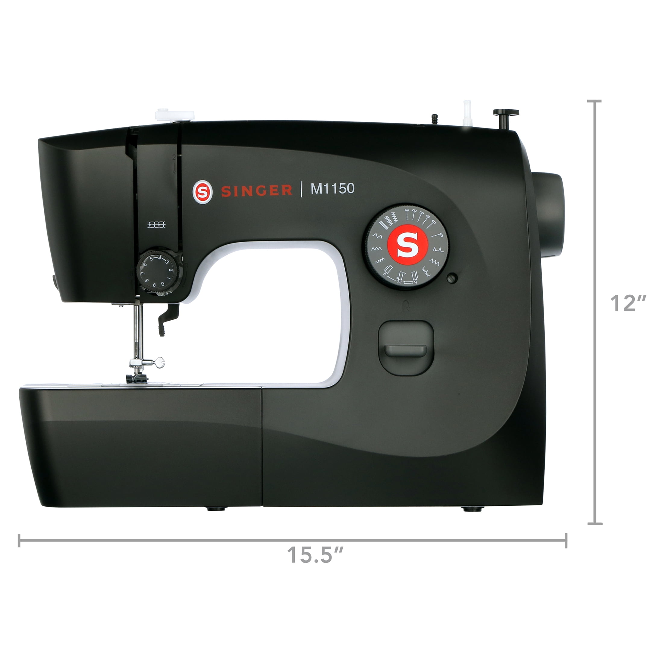 Description: The SINGER® M1150 is lightweight and portable, making it a great choice for taking to sewing class or for sewing in smaller spaces. Thanks to its ease-of-use features such as the top drop-in bobbin, 45 stitch applications, easy stitch selection and preset stitch length and width, beginners and advanced sewists will find this machine easy to use. Sew garments, piece quilts, create crafts or do simple mending – you can do it all! Included Feet and Accessories: All-Purpose Foot Buttonhole Foot Zipper Foot Seam Ripper/Brush Screwdriver Bobbins Needles Product Information: Weight: 10.41 lbs. Dimensions: 16.14” x 5.91” x 12.6”