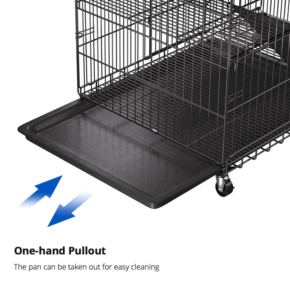 Our cat cage is made of powder-coated hard steel wire, the bottom leak-proof tray is made of a sturdy thick plastic which could slid out for quick cleaning. This cat crate is rust-resistant, thereby further establishing its long-lasting nature. All doors are secured with latches, keeping your pets safe in the cage while gone, and protecting your cats from injury by other animals.