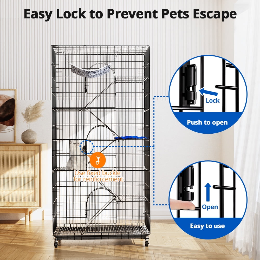 Extra large exercising space: 35.43 L x 23.62″ W x 76.57″ H. Special 6-tier design ideal for 3-5 cats, also suitable for small pets like guinea pigs, ferrets, rabbits, etc. Spacious cat crate provides room for even the most energetic cat and will make sure your pets are energetic and happy all the time