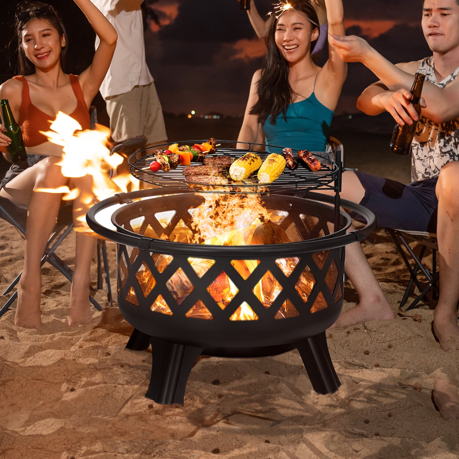 30 inch Wood Burning Fire Pit for Outside: Fire Pit with Adjustable Grill: The grill is fixed with screws and can be freely disassembled/rotated 360°;, and the height can be adjusted up and down to control the temperature. The grill made of ceramic is a material specially used for grilling, which is harmless, non-stick, healthy, easy to clean and rust-proof. Grate edges prevent food from falling off during cooking. Easy to Clean: Removable and easy-clean heat shield at the bottom of the fire pit, easy drainage and removal of ash and debris. Ash does not fall directly on the ground or lawn, protecting the ground from fire. Fire pit with drainage holes will not accumulate water and keep dry. Durable and Rust Resistant: The long lasting heavy duty gauge steel and mesh cauldron are treated with a high temp paint for withstands temperatures up to 930 degrees Fahrenheit, large load-bearing capacity, rustproof features can be used for a long time. Safe Design: The fire pit with a spark screen and a fire poker to protect you and loved ones from potentially dangerous flying embers. The seamless ring-shaped handle makes the movement of the firepit portable, while also preventing family members from being scalded. The fire pit has four legs and is more stable than three legs, and it is not easy to fall over. Quick Assembly: You don’t need to buy additional installation tools, and assembly is quick and easy. Specifications: Product Type: Fire Pit Material: Alloy Steel Finish: Black High-Temperature Paint Heat Resistant Coating: Yes Weather Resistant: Yes Product Shape: Round Location: Outdoor Package size: 25 x 25 x 13 inch Package Weight: 31 lb. Package Included: 1 x Fire Bowl 1 x Mesh Spark Screen 1 x Ash Plate 4 x Legs 4 x Outer Handles 1 x Cooking Grate 1 x Fireplace Poker 1 x User Manual