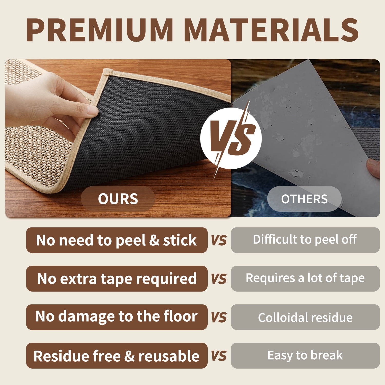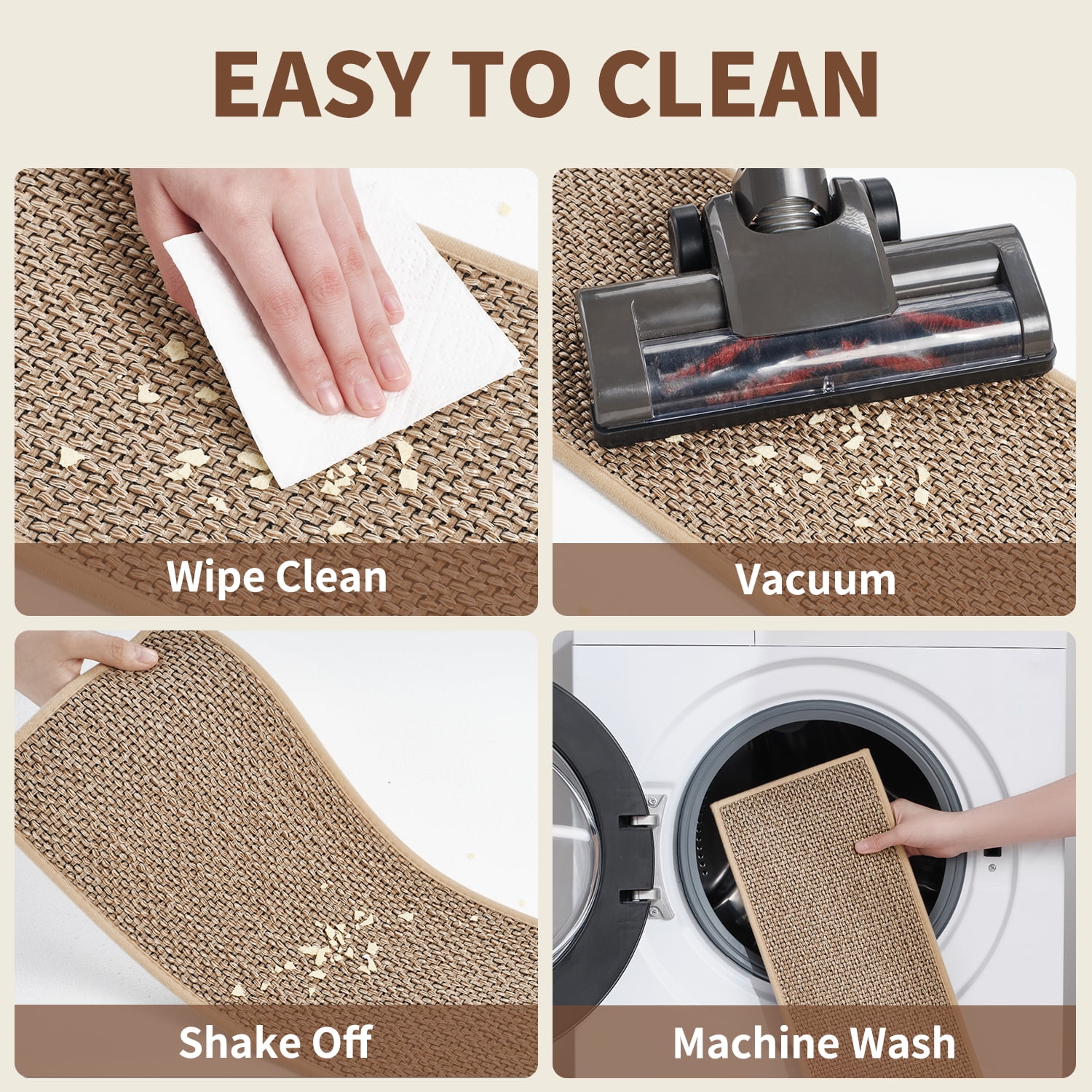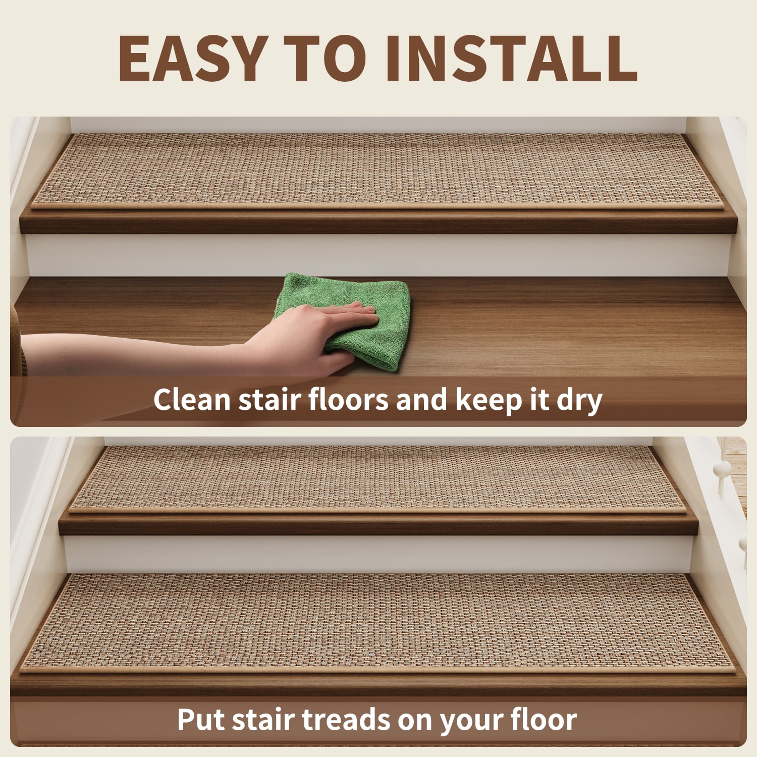 Non-slip rubber backing stair treads for wooden steps Easy to install: no need to peel and stick, no extra tape required Durable and reusable; can be removed without damaging stairs Thick rubber non-slip pads for elderly safety Comfortable meterial, soft to the touch and step, even for bare feet Easy to vacuum for daily cleaning, machine washable for deep cleaning Reduces noise while walking on stairs and creates a warm atmosphere Set of 15 stair treads, each measuring 8 x 30 x 0.35 inches Neutral color coordinates with almost any decor: farmhouse, boho, modern, or neutral Great for Home steps, kitchens, restaurants steps, hallways, basement, offices steps, hotels steps Clean steps first before putting these step treads down Machine wash in cold water, gentle cycle