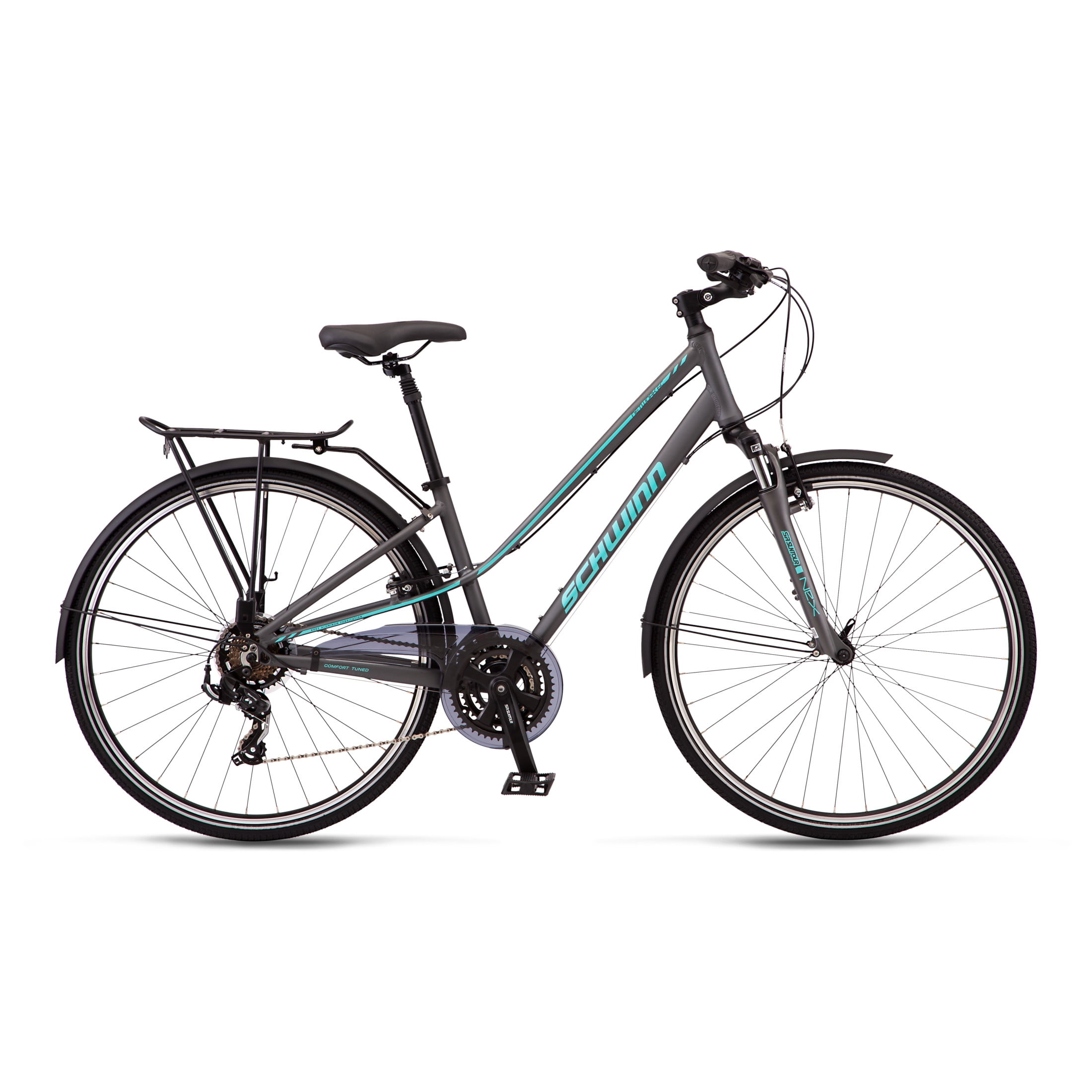 A hybrid bike for women combines the features of a comfort bike and a commuter bike Shimano 7-speed external derailleur and front and rear handbrakes for leisure rides to long-distance commutes Low, swooping 17. 5-inch steel frame with easy step-through puts you in an upright riding position and keeps your back, knees, and shoulders comfortable 26-inch wheels and 2-inch semi-slick tires provide excellent roll and a cushioned, stable ride Uniquely designed frame, fenders, saddle, and grips make a stylish statement