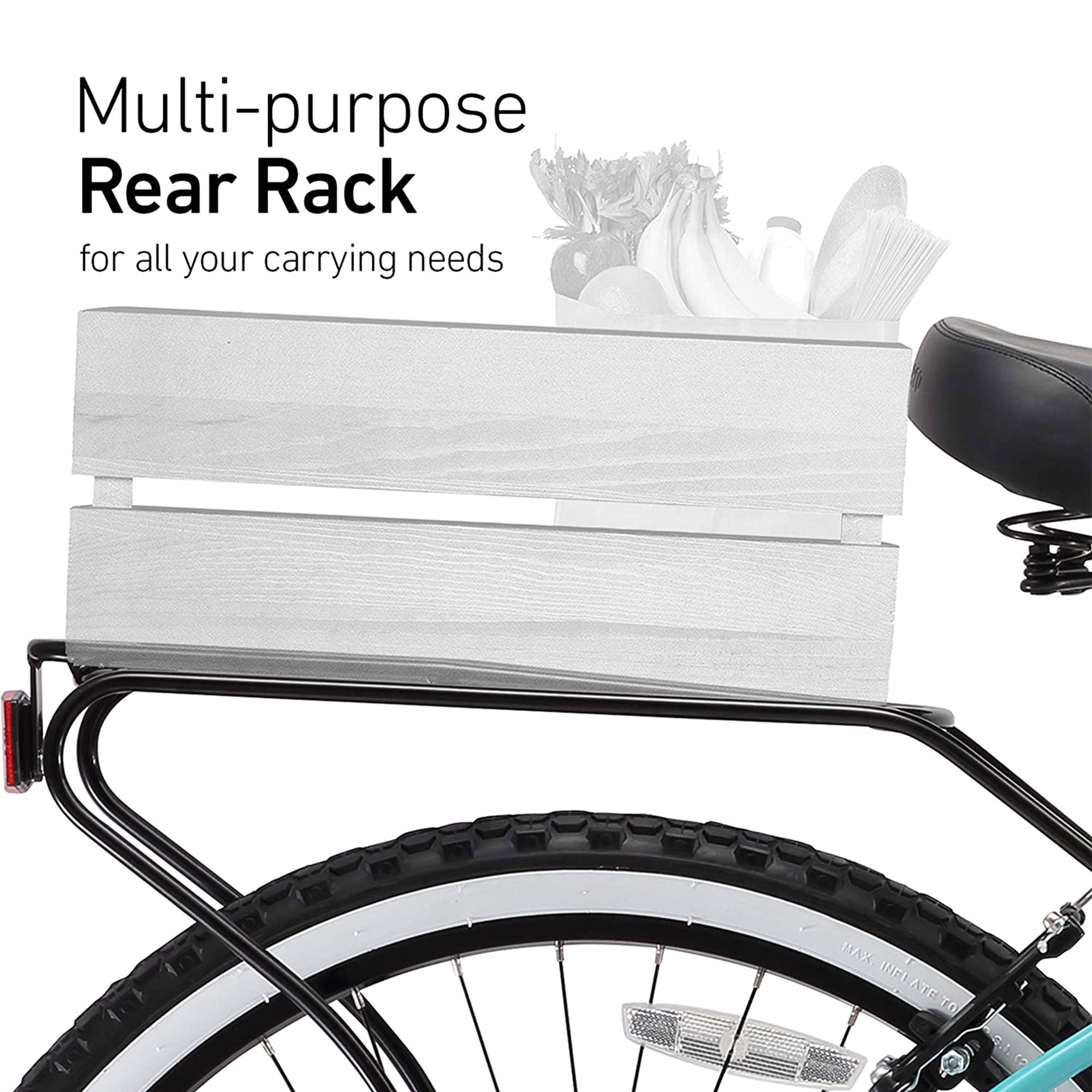 Classic and curvy women’s beach cruiser bicycle features a durable 17-inch frame that looks great as you ride around the neighborhood Encourages perfect riding posture with a frame and pedals engineered to keep your body aligned, ensuring a comfortable trip Enjoy a smooth, relaxing ride to the store or around the block with the cushioned dual-spring saddle seat and foam-gripped handlebars Control the bike and traverse bumpy roads with ease on the semi-slick 2-inch-thick tires; 26-inch wide whitewall tires effortlessly traverse different terrain Mount baskets, panniers, and other cargo on the included rear rack; Ideal for casual up-tempo rides; Not for high-intensity exercise Easily mount the bike using the step-through frame and free yourself of care on the durable steel frame Fits women 5 to 6 feet tall Speeds: 1 Material: Steel Color: Teal blue Dimensions (L x W x H): 67.00 x 28.00 x 17.00 inches Weight: 34.00 pounds Manufacturer warranty: 1-year warranty