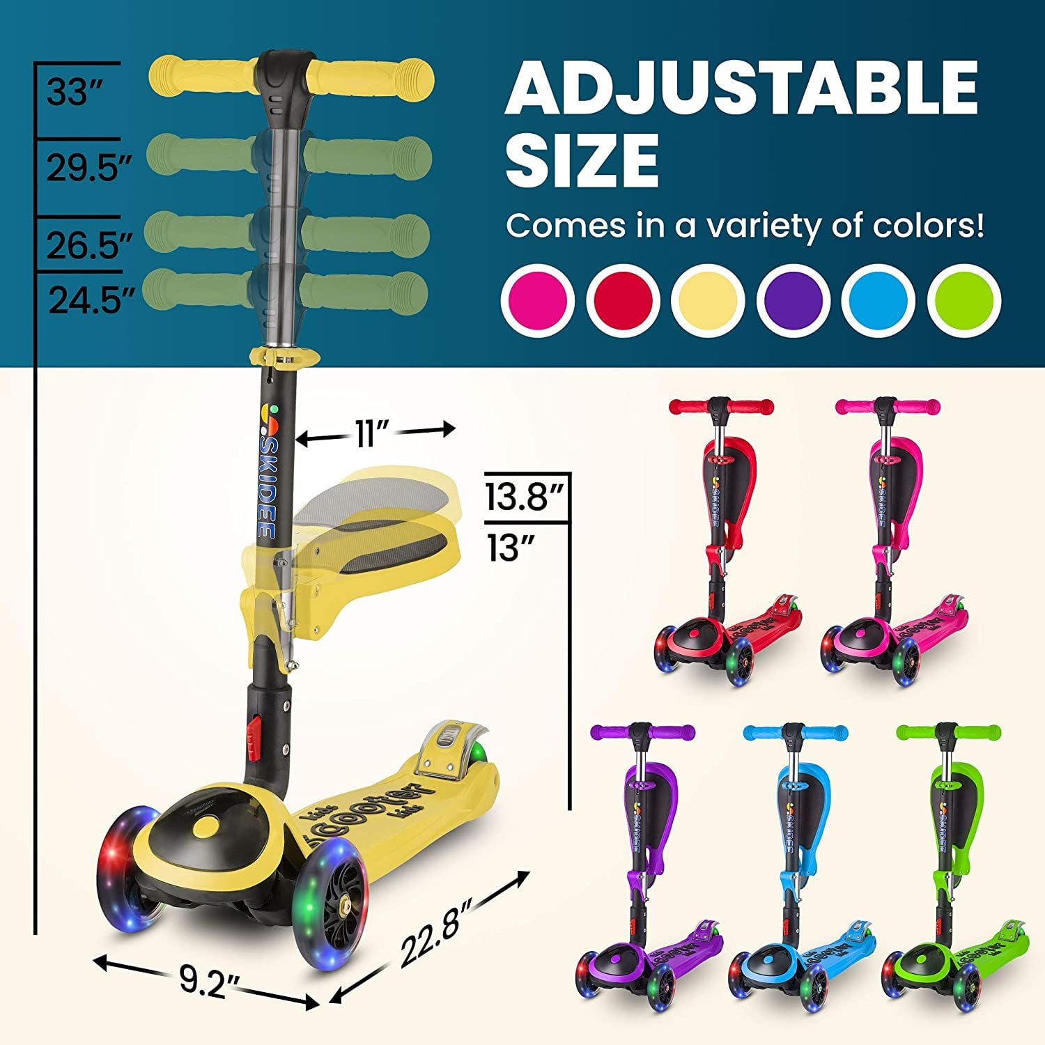 Skidee Kick Scooters for Kids, Adjustable Height, Foldable, LED Lights, Rear Brake, Ages 2-12, Yellow SKIDEE Kick Scooter is equipped with a wide standing board and 3 wheels that provide plenty of support and a perfectly balanced ride for kids ages 2-12 years old With its adjustable and removable seat, this Kids Scooter offers ultimate versatility. It allows your kids to comfortably scoot sitting or standing up Convincing your kids to engage in physical activities is made a lot easier with this Glowing Wheels. They automatically light up when kids ride the scooter – no battery needed The combination of strong and sturdy design and Lean-to- Steer Technology makes it the most stable Scooter that will help them develop balance and coordination