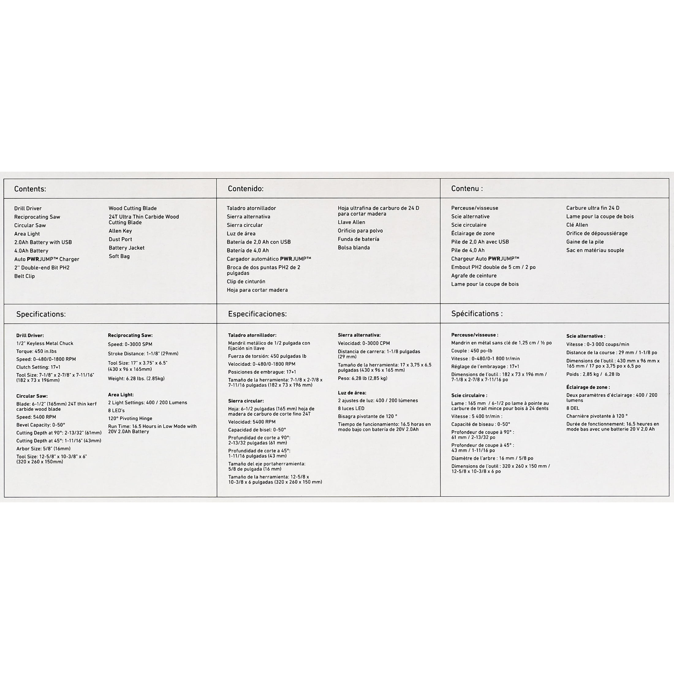 4 Tool Combo Kit – Includes 20V Brushless Drill Driver, 20V Brushless Circular Saw, 20V Brushless Reciprocating Saw, 20V LED Area Light, 4.0Ah & 2.0Ah Lithium-ion Batteries with PWR JUMP Charger 20 v Brushless Cordless Drill Driver– inch drill driver variable speed trigger (0-480/0-1800RPM) 20 v Brushless Cordless Circular Saw – 6-1/2 inch 24-tooth carbide for fast clean cuts up to 2-13/32” depth at 90 degrees, with bevel capacity up to 50- degrees. 20 v LED Area Light – Great for illuminating dark workspaces. 20 v Brushless Cordless Reciprocating Saw – Made for cutting through tough materials during a teardown and more.
