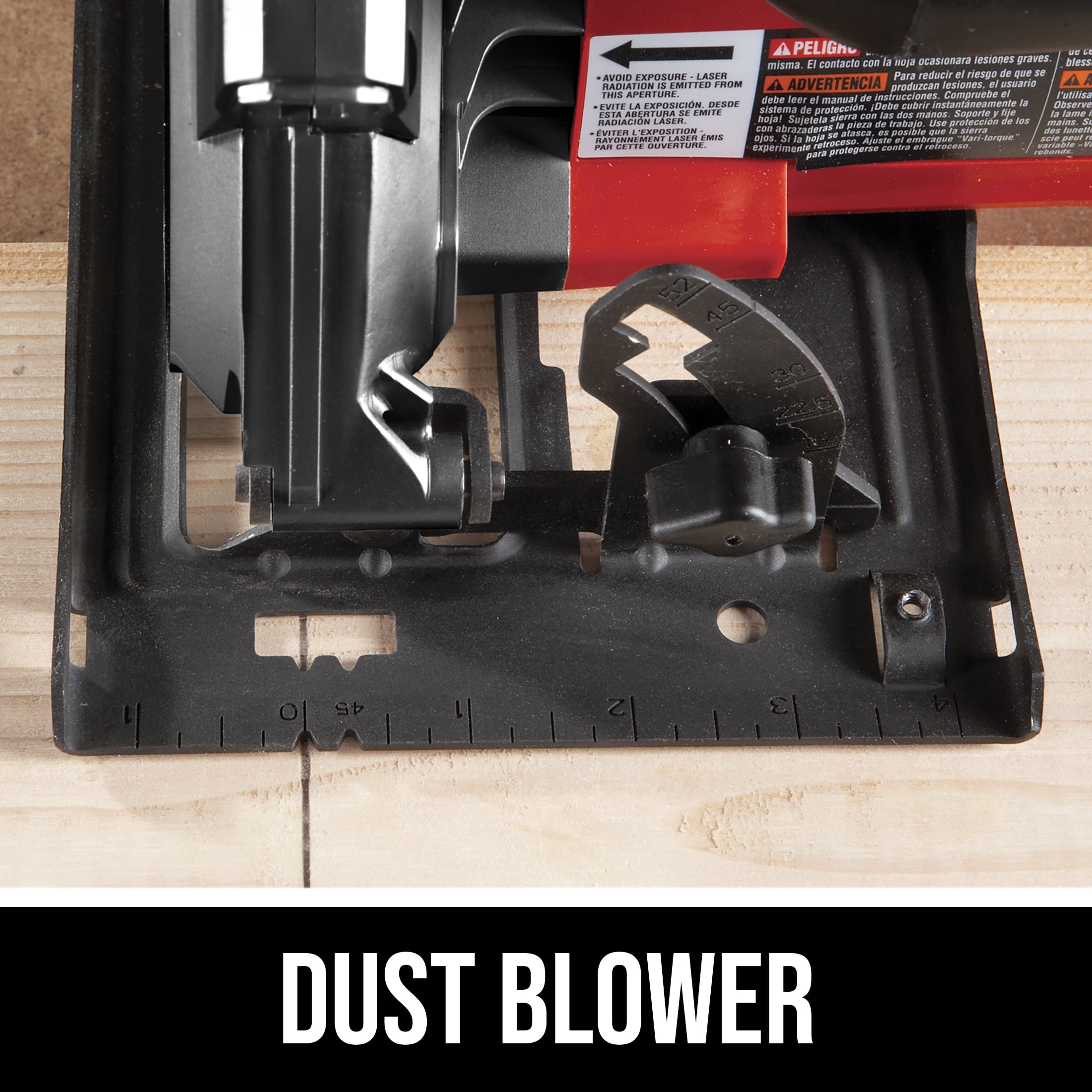 15-AMP 2.5 HORSEPOWER MOTOR – Easily cuts through a wide variety of materials SINGLE BEAM LASER – For more accurate cuts SPINDLE LOCK – For fast, convenient blade changes 51-DEGREE BEVEL WITH POSITIVE STOP AT 45 DEGREES – For greater cut capacities including 1-15/16-inch max. cut capacity at 45 degrees and a 2-7/16-inch max. cut capacity 24-TOOTH CARBIDE CIRCULAR SAW BLADE INCLUDED – For quick, quality cuts in lumber and sheet materials INTEGRATED DUST BLOWER – Keeps line of cut free of sawdust CONTOURED MAIN HANDLE – For comfort and control, with a safety lock guarded trigger to prevent inadvertent startups and a power-on indicator to alert user to tool power status ANTI-SNAG LOWER GUARD – Reduces snags when making narrow cut-offs WIDE FOOT PLATE – For stability when cutting REAR LEVER DEPTH ADJUSTMENT – For quick adjustments to desired depth of cut