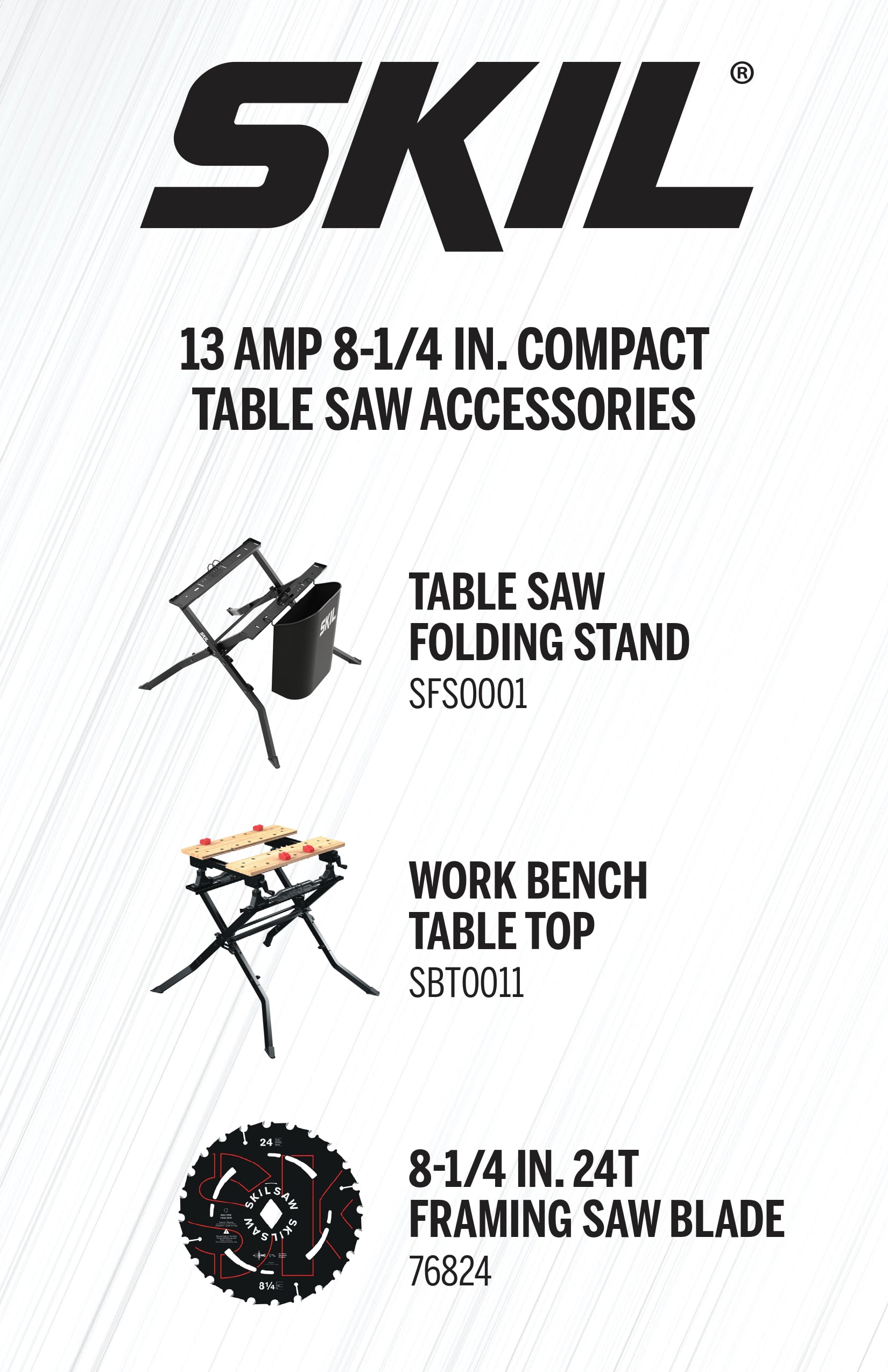 SKIL 8-1/4 Inch Table Saw Rack and pinion fence rails – Ensures fence stays parallel to blade for fast, smooth, accurate cuts AC Motor – Power for a range of applications Compact Size – Portable for easy transportation and storage Aluminum Table – For accurate and high-quality cutting performance Safety Switch – Delivers immediate shutdown for added safety Parallel Blade Alignment – Available micro adjustment of blade so that it is parallel to rip fence and miter slot Rated Voltage: 120 V Input Power: 13 Amp Blade Diameter: 8-1/4 in. Teeth of Blade: 24T Speed: 5000 RPM Blade Arbor Hole Diameter: 5/8 in. Max. Bevel Angle: -2°-47° Max. Width of Dado: 5/8 in. Max. Rip of Right of Blade: 24.5 in. Max. Rip of Left of Blade: 13 in. Max. Cutting Depth – 45° Bevel: 1-3/4 in. Max. Cutting Depth – 0° Bevel: 2-1/2 in. Cord Length: 6 ft. Includes: 1pc table saw, 1pc fence, 1pc miter gauge, 1pc push stick, 1pc modular guard system, 1pc anti-kickback pawl, 1pc dust port elbow, 1pc hex wrench, 2pcs blade change wrenches Model Number: TS6328-00