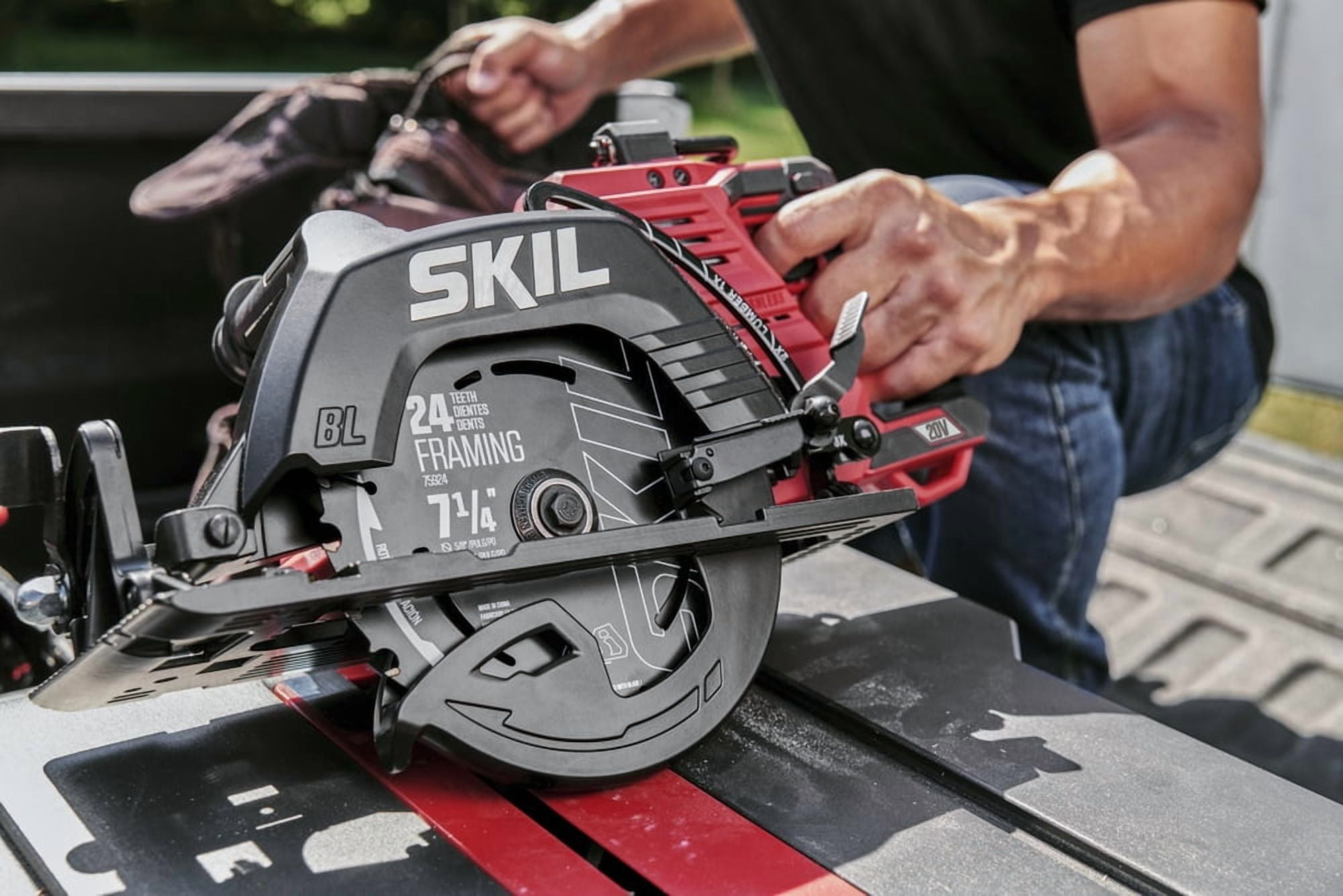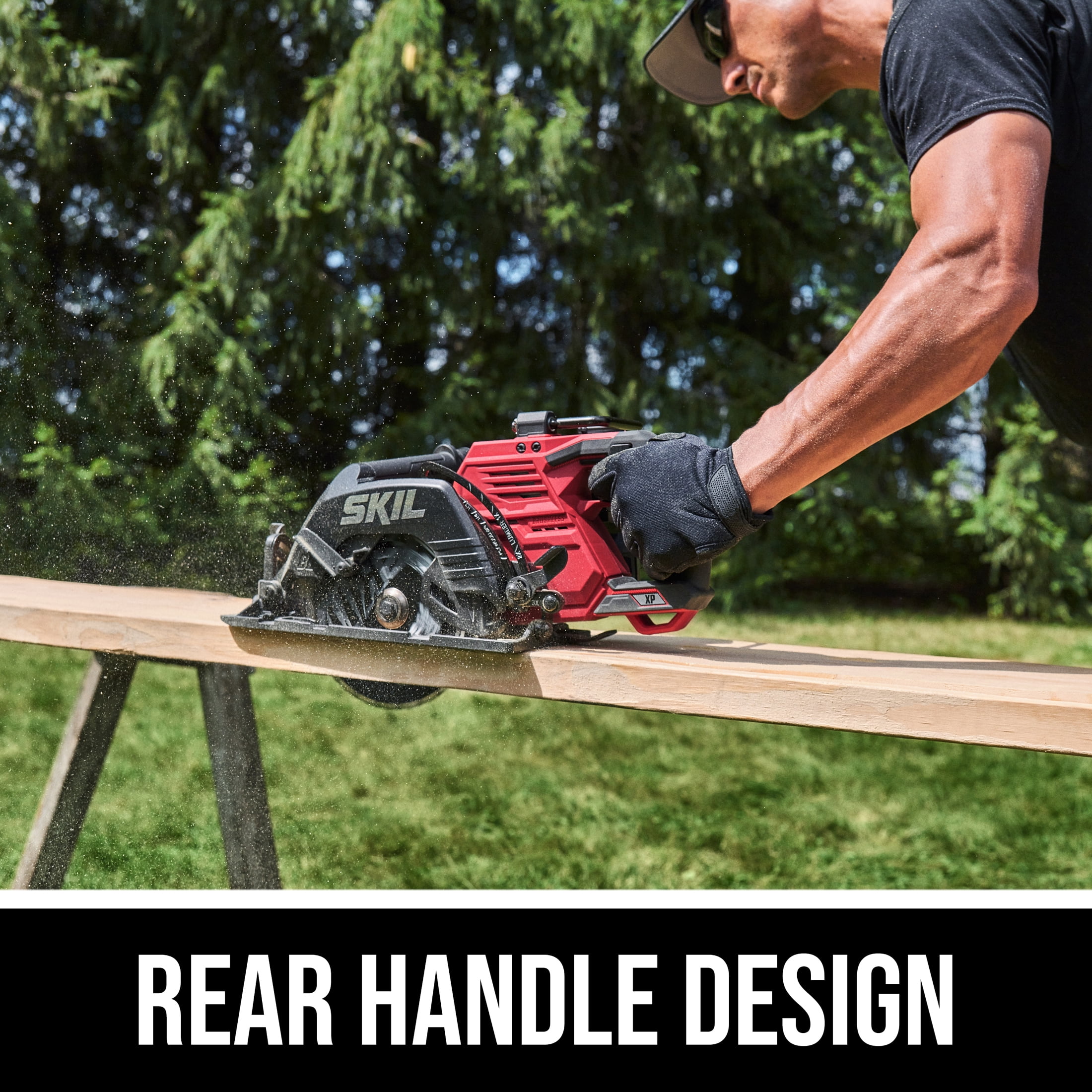 Extreme POWER. Extreme PERFORMANCE. Rip through 3X lumber in one pass with the SKIL PWR CORE 20 XP Brushless 7-1/4 In. Rear Handle Circular Saw. Its brushless motor delivers 5,300 RPM for extreme cutting performance, and the included 24 Tooth 7-1/4 In. Carbide-Tipped Blade provides smooth and accurate cuts. Other versatile features include an adaptable dust port to direct sawdust away from the work area, an LED light, built-in rafter hook and tether notch, and 0-53 bevel capacity to cut a variety of angles. The two included PWRCORE 20 5.0Ah lithium-ion batteries deliver 25% longer run time and up to 600 cuts per charge. All this SKIL power and performance is backed by an industry-leading 5-year warranty. It’s a SKILSAW.