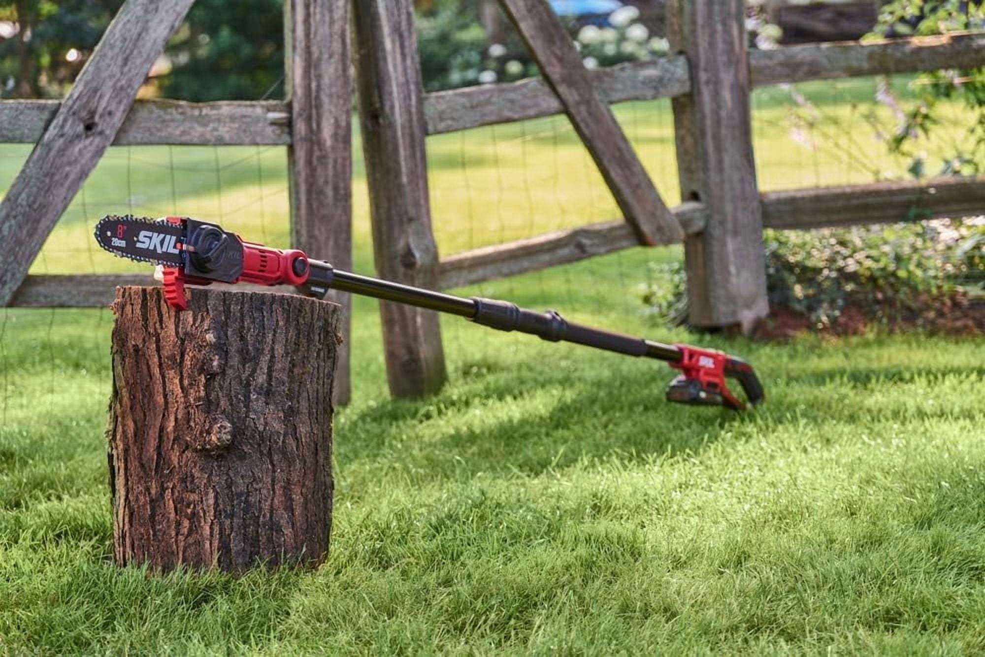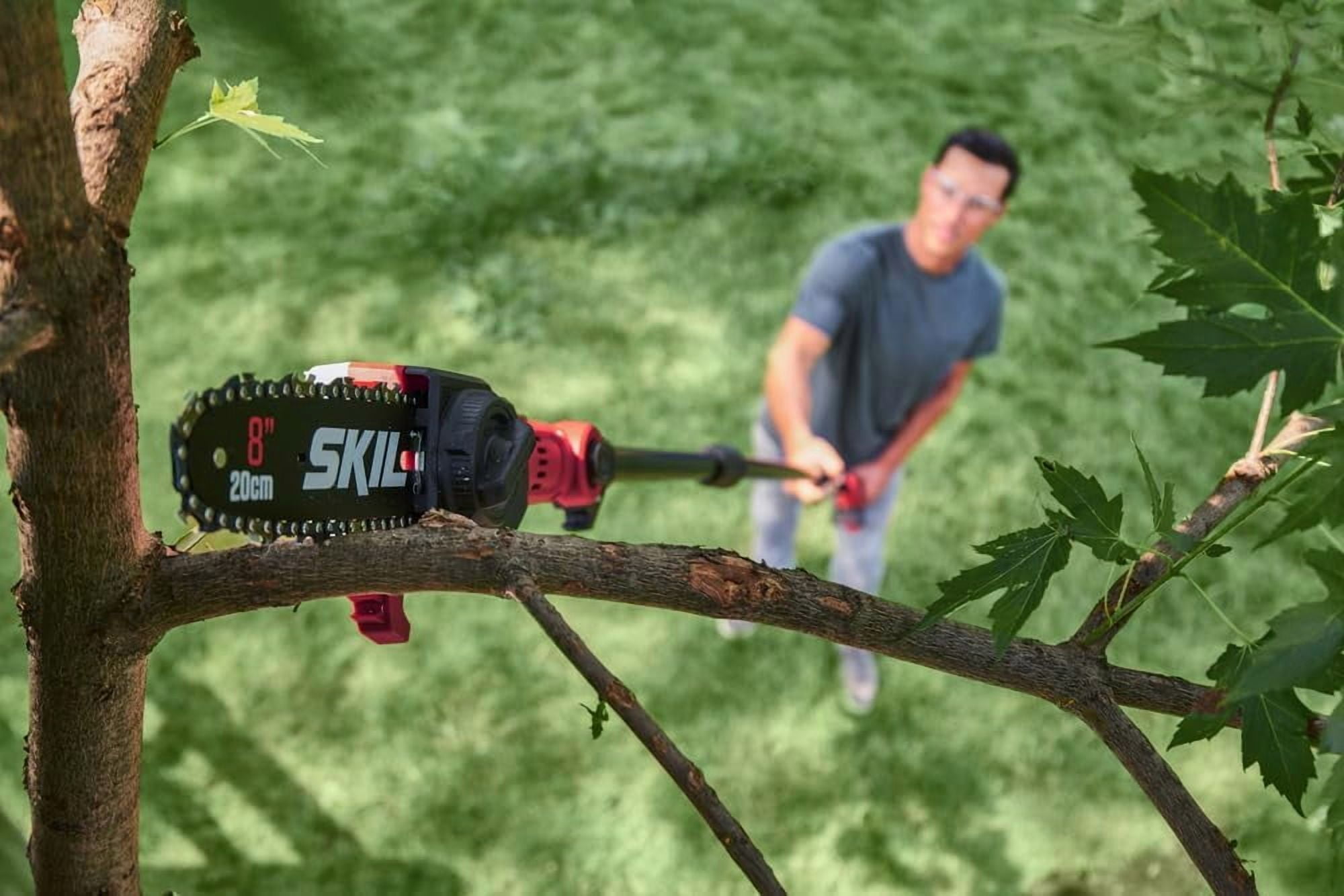 CORDLESS POLE SAW – Includes PWR CORE 20™ 8 In. 20V Pole Saw, 2.0Ah Battery and Charger LONGER RUN TIME & BATTERY LIFE – Industry leading PWR CORE 20™ lithium battery technology wraps each cell with cooling material to keep it powering on for 25% longer run time and 2X battery life 10 FT EXTENDABLE SHAFT – The SKIL pole saw comes equipped with an aluminum 3.5-foot extendable shaft, taking the 6.5-foot stock pole saw to 10-feet in a quick snap 135 DEGREE PIVOTING HEAD – This saw comes equipped with an 135 degree Pivoting Head with 8 position settings along the way, allowing the 8-inch bar and chain head to rotate for maximum cutting control AUTO-LUBRICATING & TOOL-LESS CHAIN TENSIONING – The auto-lubricating feature provides efficiency and performance, while paired with tool-less chain tensioning for hassle-free adjustments EASY STORAGE BRACKET – This pole saw comes equipped with an Easy Storage Hook and Bracket, to conveniently store all your SKIL PWR CORE 20™ outdoor equipment with ease