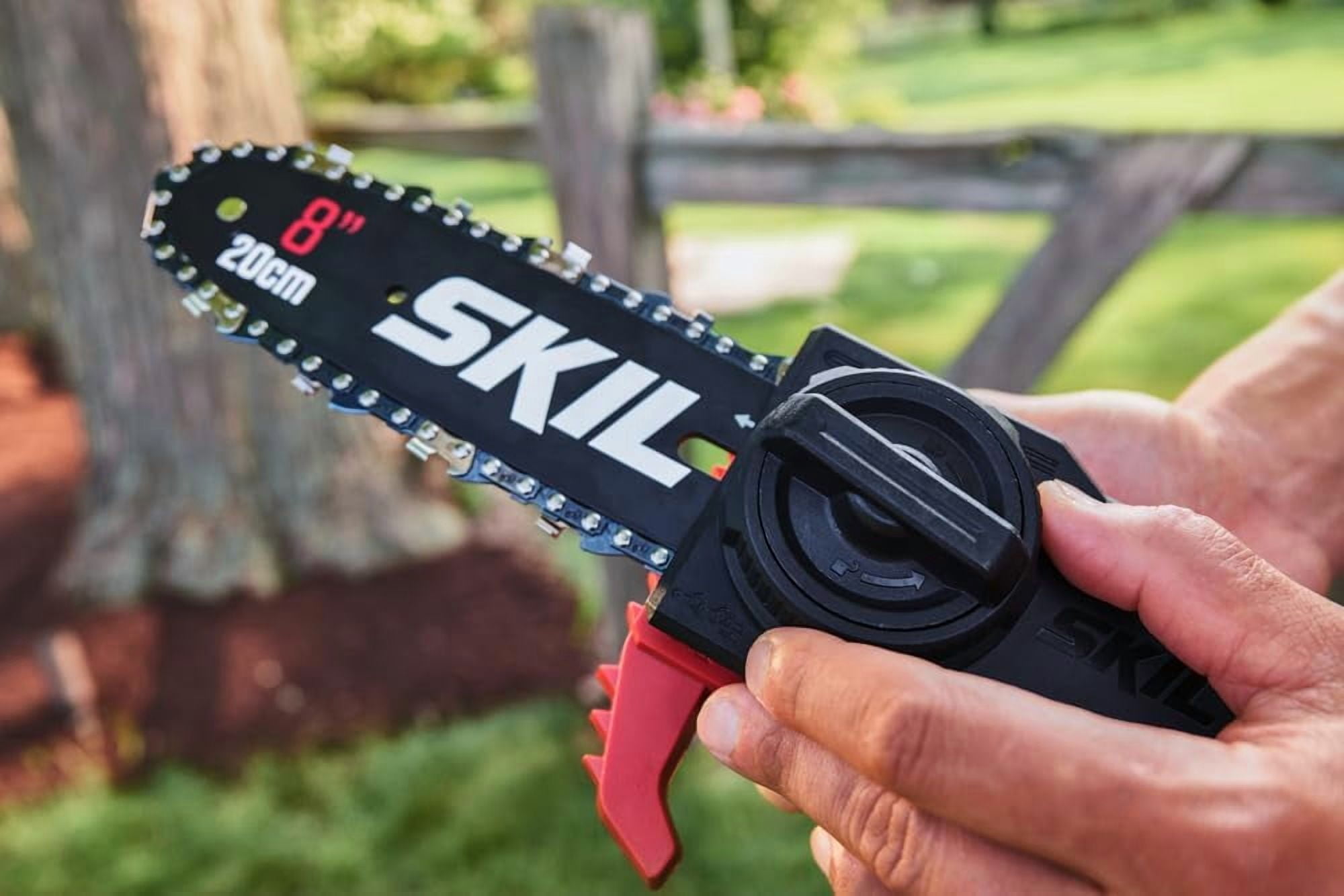 Get dependable performance with a cordless pole saw powered by SKIL PWR CORE 20™ lithium technology. The saw comes equipped an 8-inch bar and pivoting head, along with a 3.5-foot extendable aluminum shaft, transforming the stock 6.5 ft pole saw to 10 feet with ease. Additionally, this saw comes equipped with a 135° pivoting head and 8 presets, providing greater control and convenience for tough to reach branches. The pole saw features an auto-lubricating chain for reduced friction and enhanced durability, while tool-less chain tensioning allows for hassle-free adjustments on the job. This pole saw kit includes a PWR CORE 20™ 2.0Ah 20V Battery and Charger, plus an Easy Storage Bracket to conveniently store all your SKIL PWR CORE 20™ outdoor equipment with ease. The included PWR CORE 20™ 2.0Ah Battery and Charger are compatible with all SKIL PWR CORE 20™ tools.