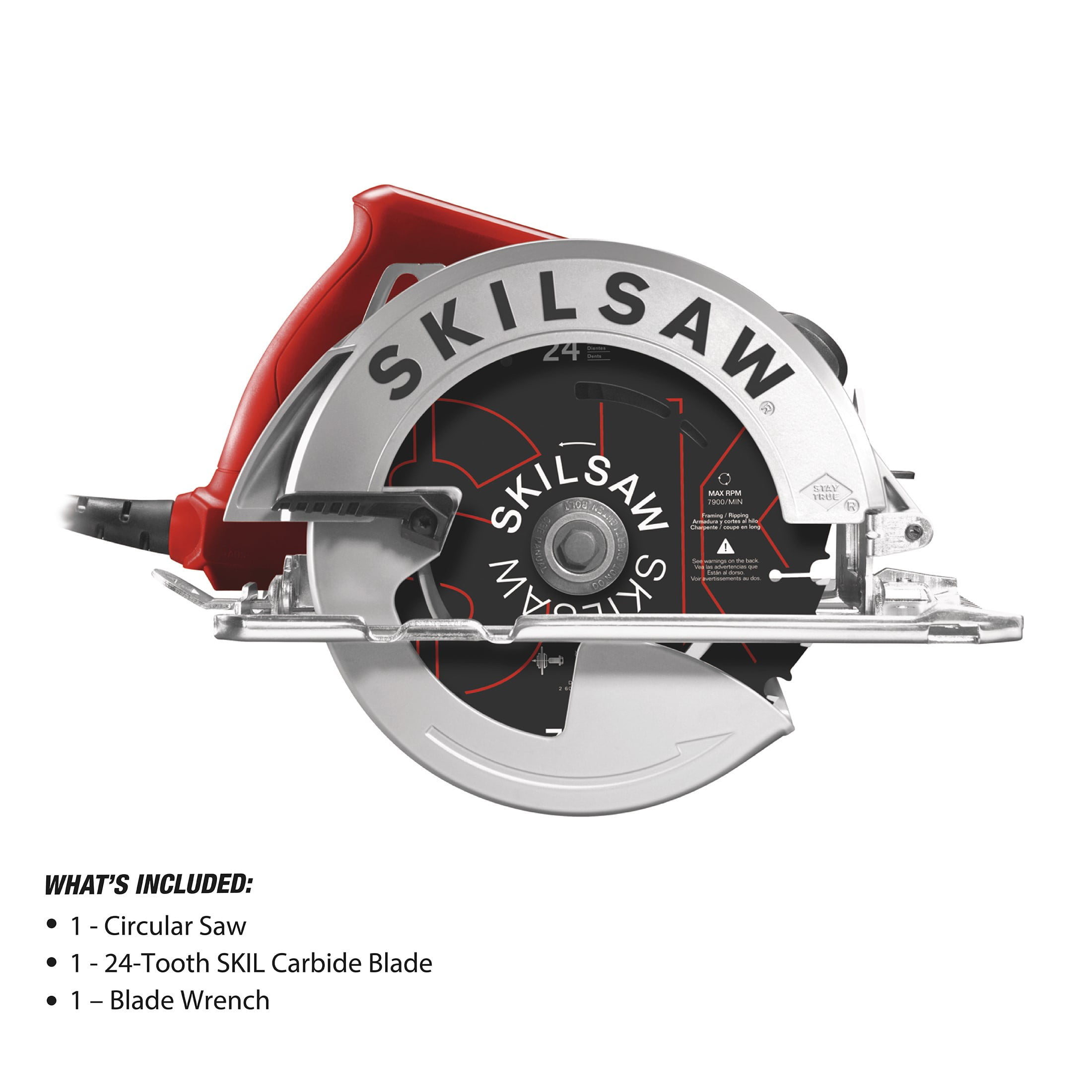 7-1/4 in. lightweight motor housing Best-in-class torque improves productivity and speed of cut Dual-field motor is especially designed for saws by providing increased cooling to extend tool life 51° precision beveling capacity Comes with 7-1/4 in. 24-tooth SKILSAW blade and multi-functional wrench Dust blower clears the line of cut for increased accuracy Included: 1 – 7-1/4in. circular saw;1 – blade; 1 – blade wrench Ratings: 15A, 120VAC, 60HZ No-load RPM: 5,300 Cord length: 6ft.(1.8m) Arbor size: 5/8” round Capacity: 2-7/16 in.(62 mm)Max cut at 90°;1-7/8in.(47mm)Max cut at 45°;1-11/16in.(43mm)Max cut at 51° 1-year limited warranty Model# SPT67WE-01 For product replacement parts contact customer service at 1- (833) 908-2024 Sunday – Saturday, 7:00 a.m. – 9:00 p.m. CT.