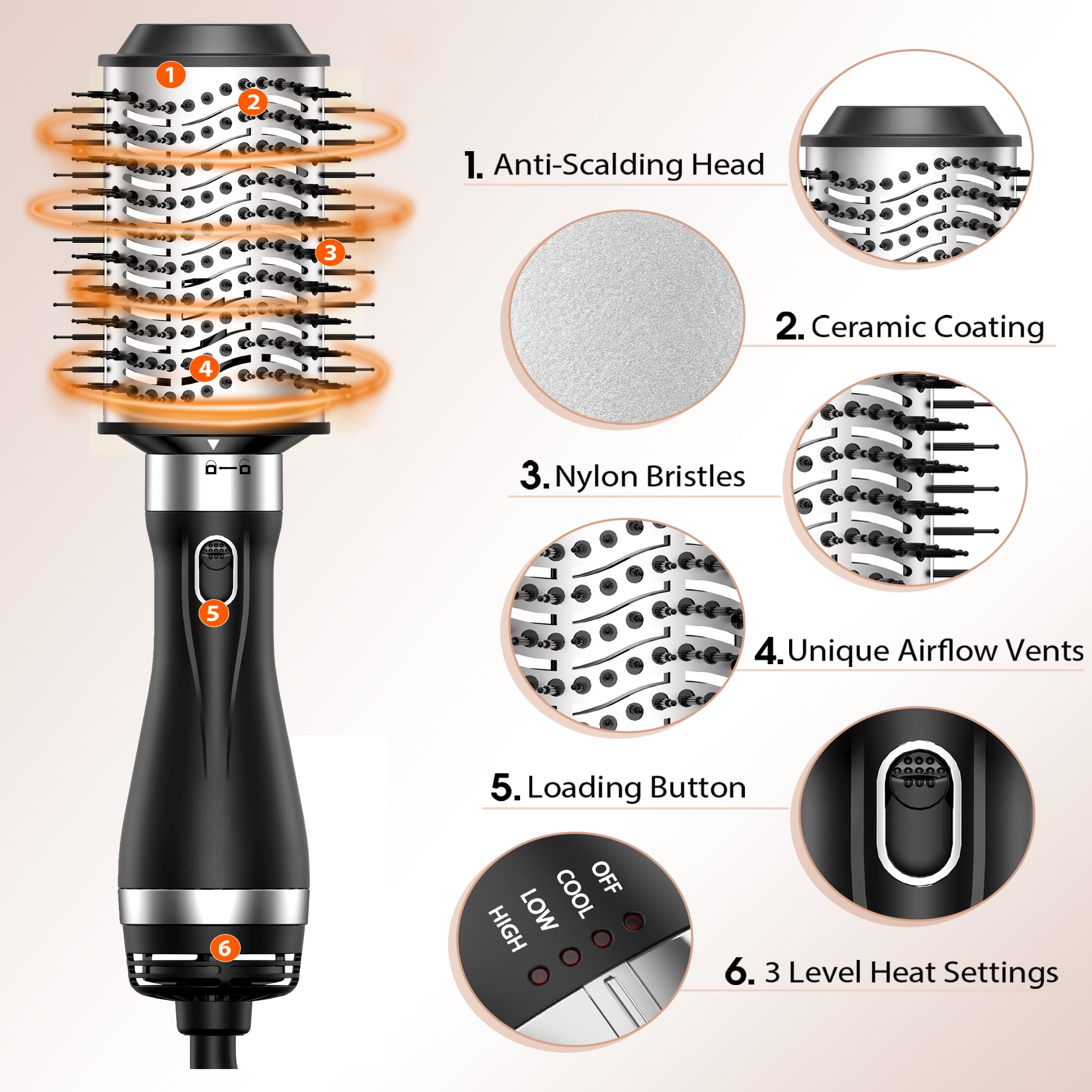 HAIR DRYER BRUSH: The brand SKIMI is simplify your hairstyling routine with our innovative 4-in-1 hot air brush. It combines the power of a hair dryer, hair straightener, curling iron, and styling brush, giving you the ultimate all tool for professional-quality results. NEGATIVE ION TECHNOLOGY: Our hair dryer brush harnesses the power of negative ions to eliminate frizz, reduce static, and leave your hair silky smooth. Experience salon-quality results with every use, as negative ions seal the cuticles, resulting in healthier, shinier hair. THREE-SPEED TEMPERATURE SETTING: Customize your styling experience with three adjustable temperature settings. Whether you have thin, medium, or thick hair, our hair dryer brush can cater to your specific needs and help you achieve your desired hairstyle effortlessly. CERAMIC COATING: The ceramic coating of our hot air brush ensures even heat distribution, reducing damage caused by excessive heat. This helps protect your hair from heat-related styling damage, leaving it looking and feeling healthier. ACCESSORY STYLING TOOL: Our hair dryer brush comes with various styling attachments, including a smoothing brush, a round brush, and a concentrator nozzle. These accessories enable you to create a variety of hairstyles, from sleek and straight to voluminous curls, adding versatility to your hair care routine.