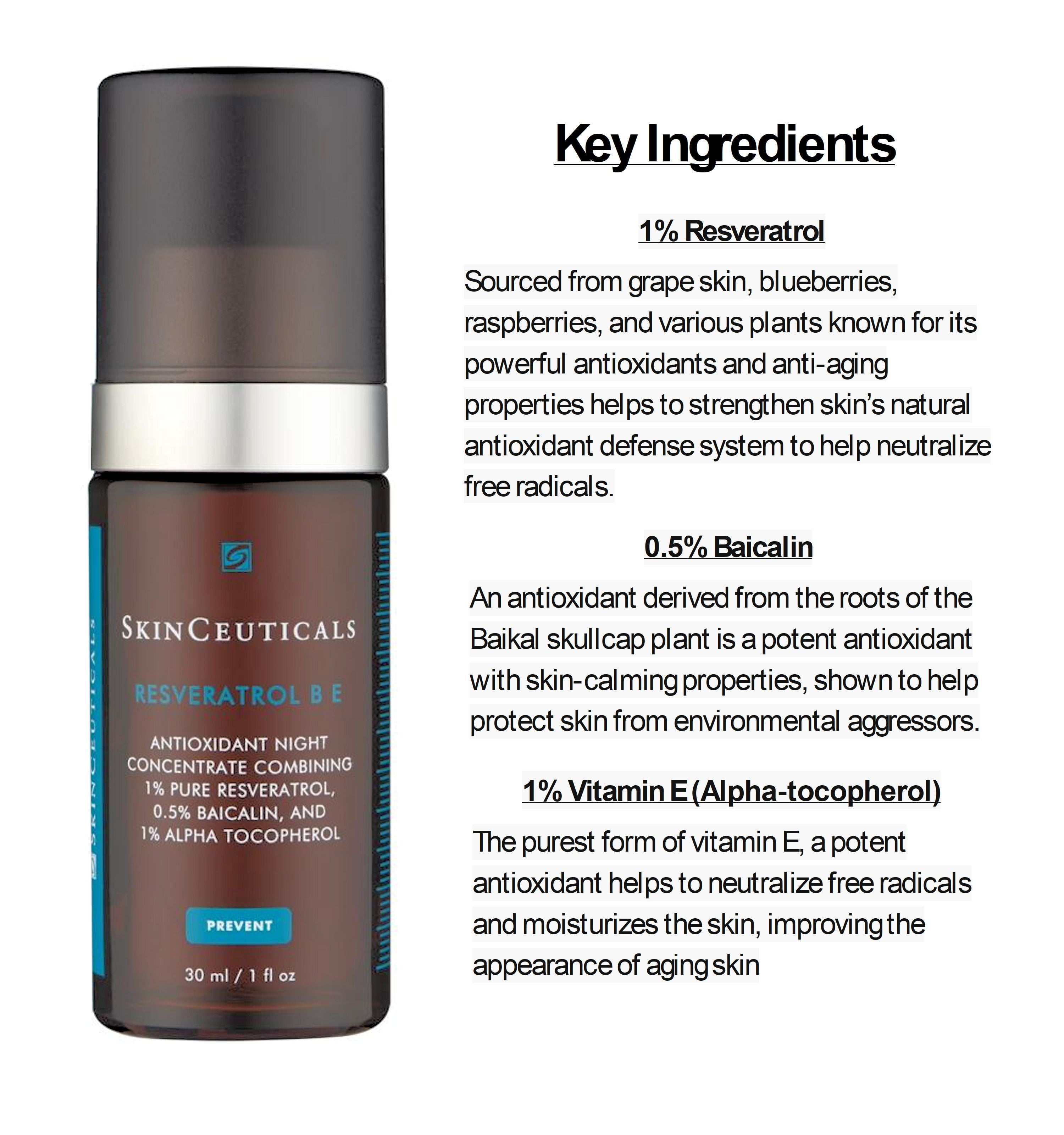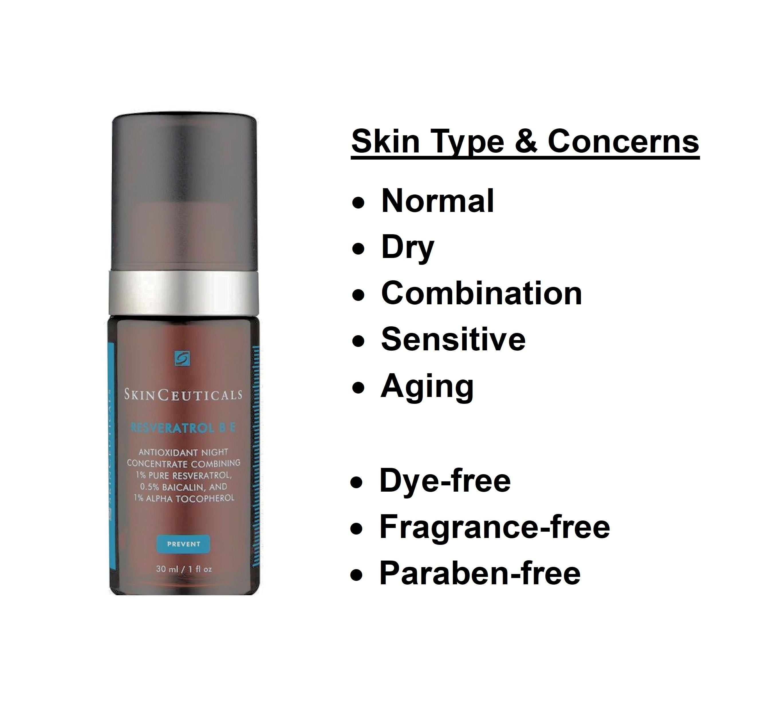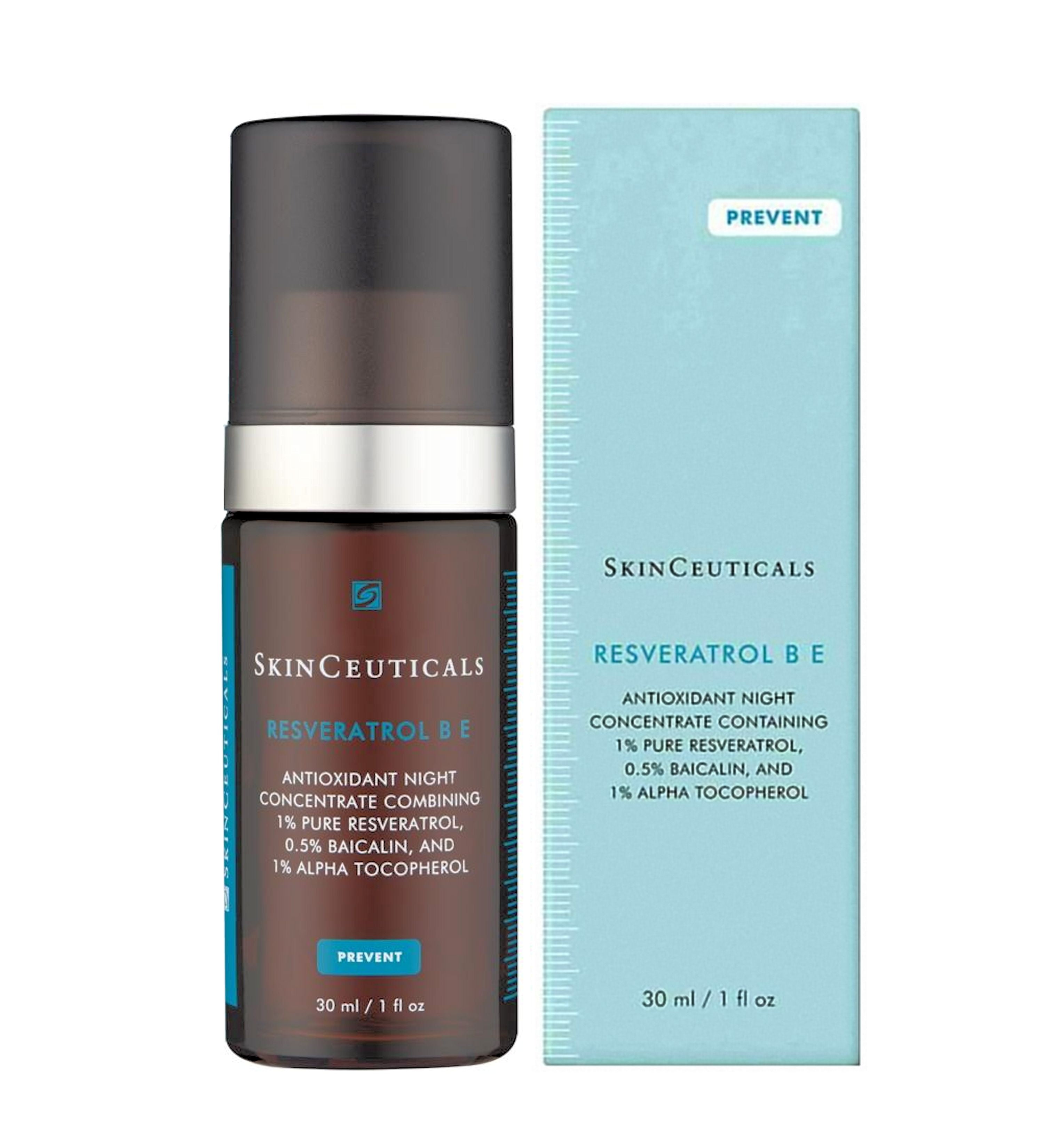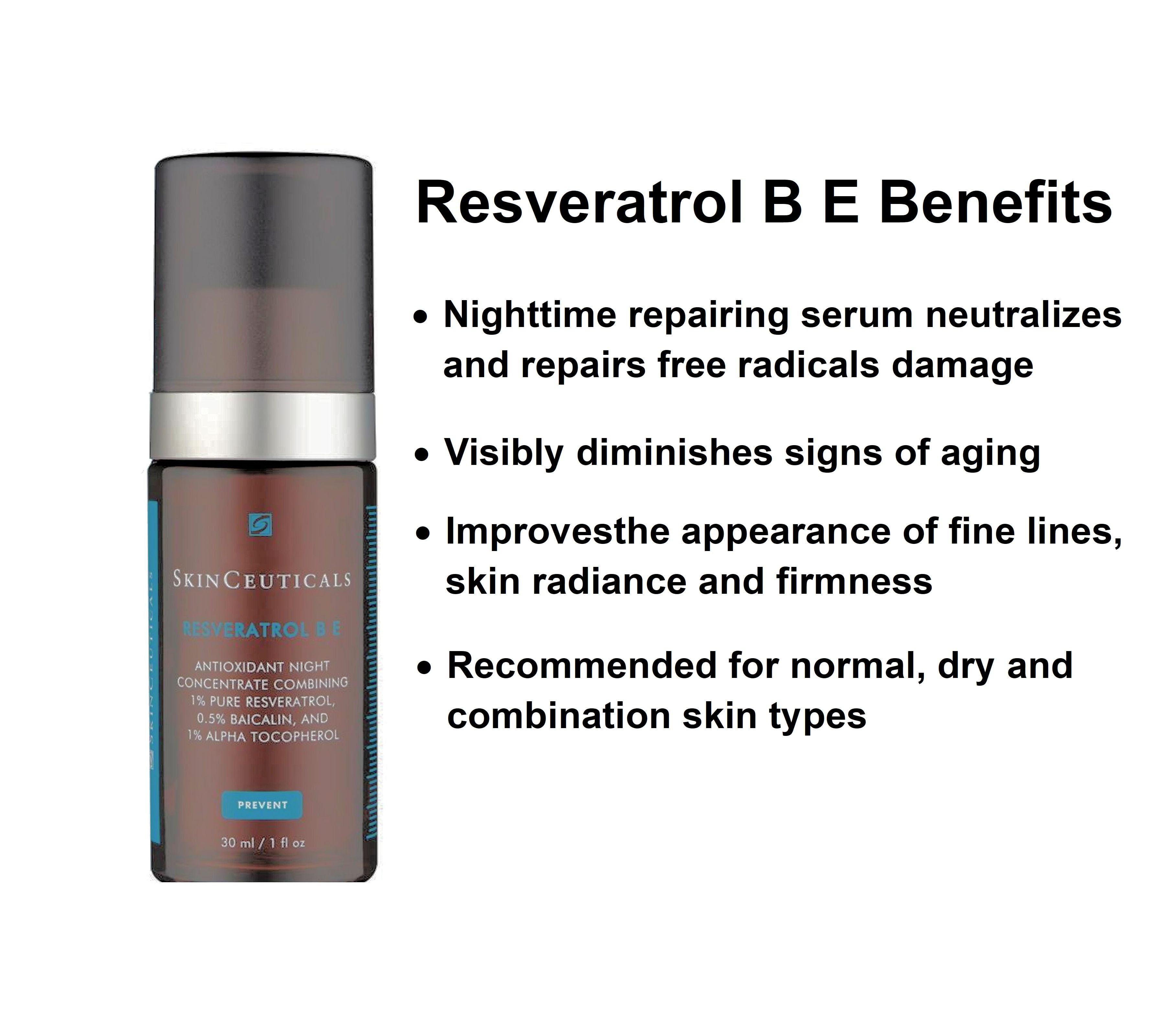 SkinCeuticals Resveratrol B E Nighttime Antioxidant Facial Serum is a concentrated night face serum with pure antioxidant-rich Resveratrol to reveal visible radiance and firmness. This patented innovative formulation combines the powerful antioxidant properties of 1% pure, stable Resveratrol with the nourishing benefits of 0.5% Baicalin and 1% Pure Vitamin E (Alpha-Tocopherol) that provides comprehensive neutralizing protection against environmental aggressors and visible signs of aging. Helps to reduce the appearance of fine lines, wrinkles, and uneven skin tone, while soothing and hydrating the skin. Free of dye, fragrance, paraben