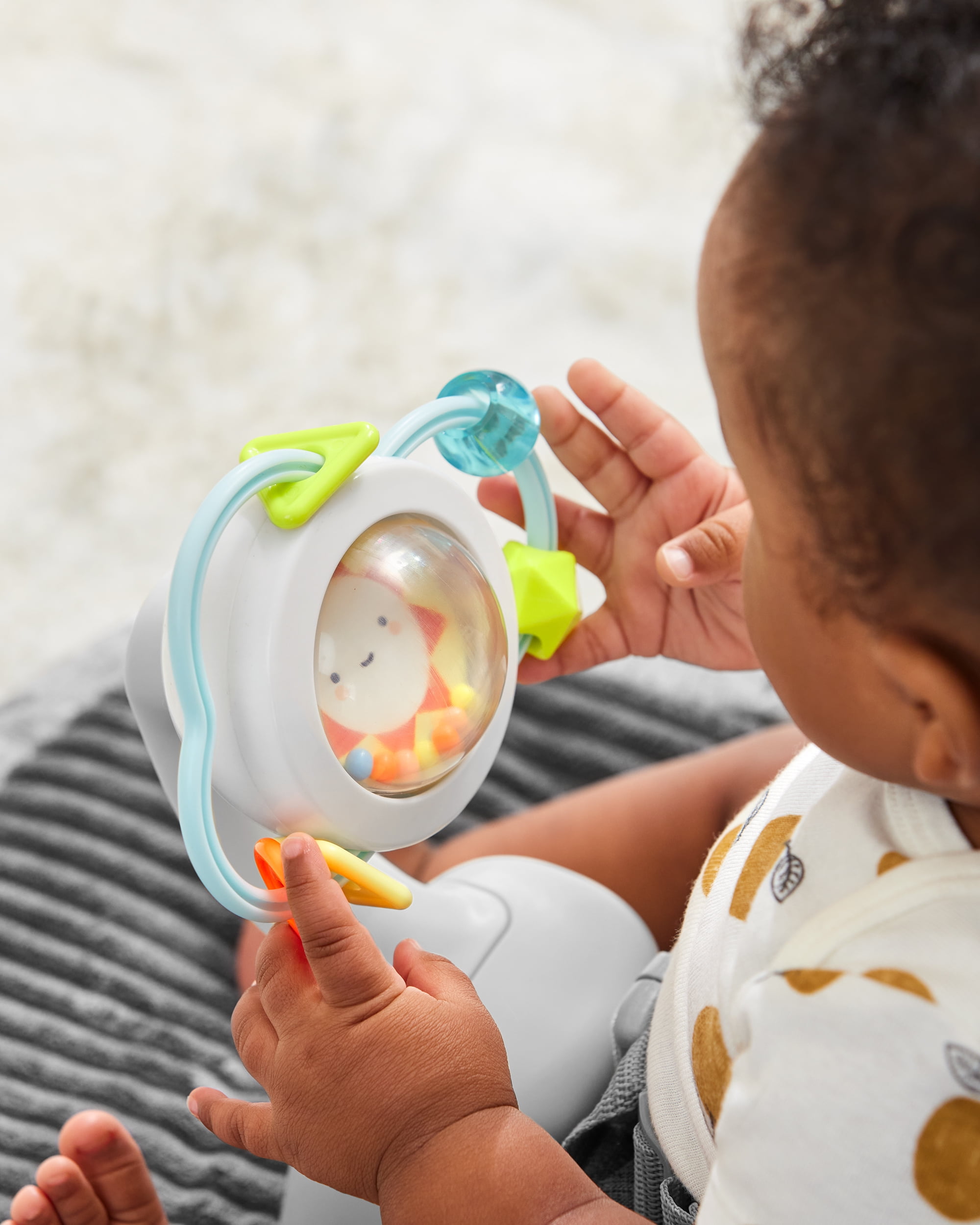 Introducing a sleek and comfy way for baby to sit and play! Thanks to its ergonomic design, our innovative activity floor seat for baby encourages healthy posture and playful discovery in any room. The open design allows for easy ins & outs, while the detachable multisensory toy attachment keeps baby engaged and entertained. The machine washable cover includes a plush foot pad, while the padded head/neck support makes this a must-have for beginning sitters. Even better? The sturdy—yet lightweight—design easily packs for travel, too.