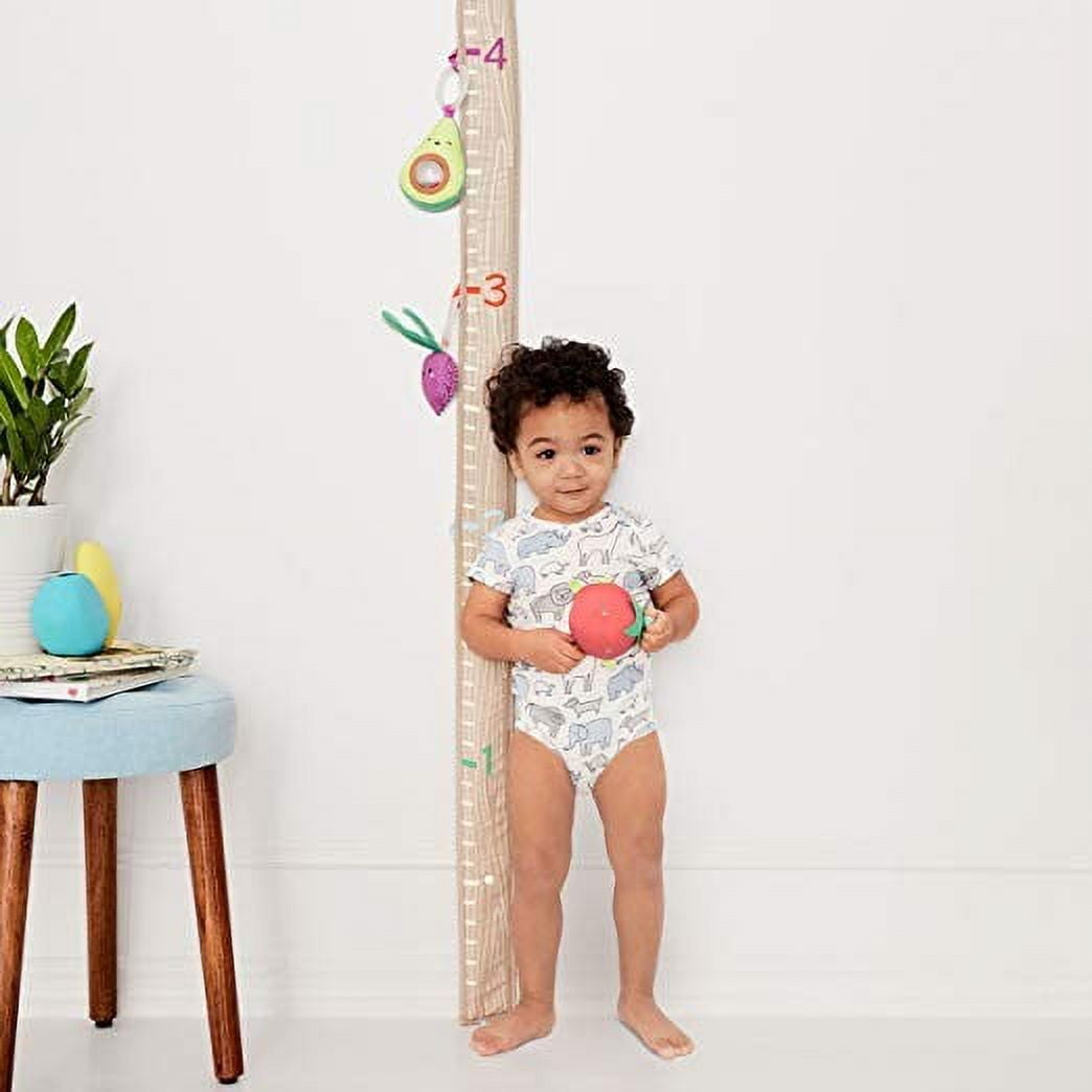 Playing with food is a good thing! A colorful garden of fun fruits, veggies and more, our Farmstand Grow & Play Activity Gym stimulates baby’s senses and continues to teach as they grow. Packed with lots of engaging textures and sounds for baby to explore, the soft playmat features cheerful farm graphics and numbers. Fold-up sides create an enclosed playspace that’s perfect for tummy time play. A bright watermelon wedge pillow with plush texture, and a cute side pocket let baby “pick” their own veggie. Five hanging toys include an avocado rattle, a beet squeaker and a musical bunny to keep baby busy and happy. When little ones sprout up, the removable arches convert to a growth chart.
