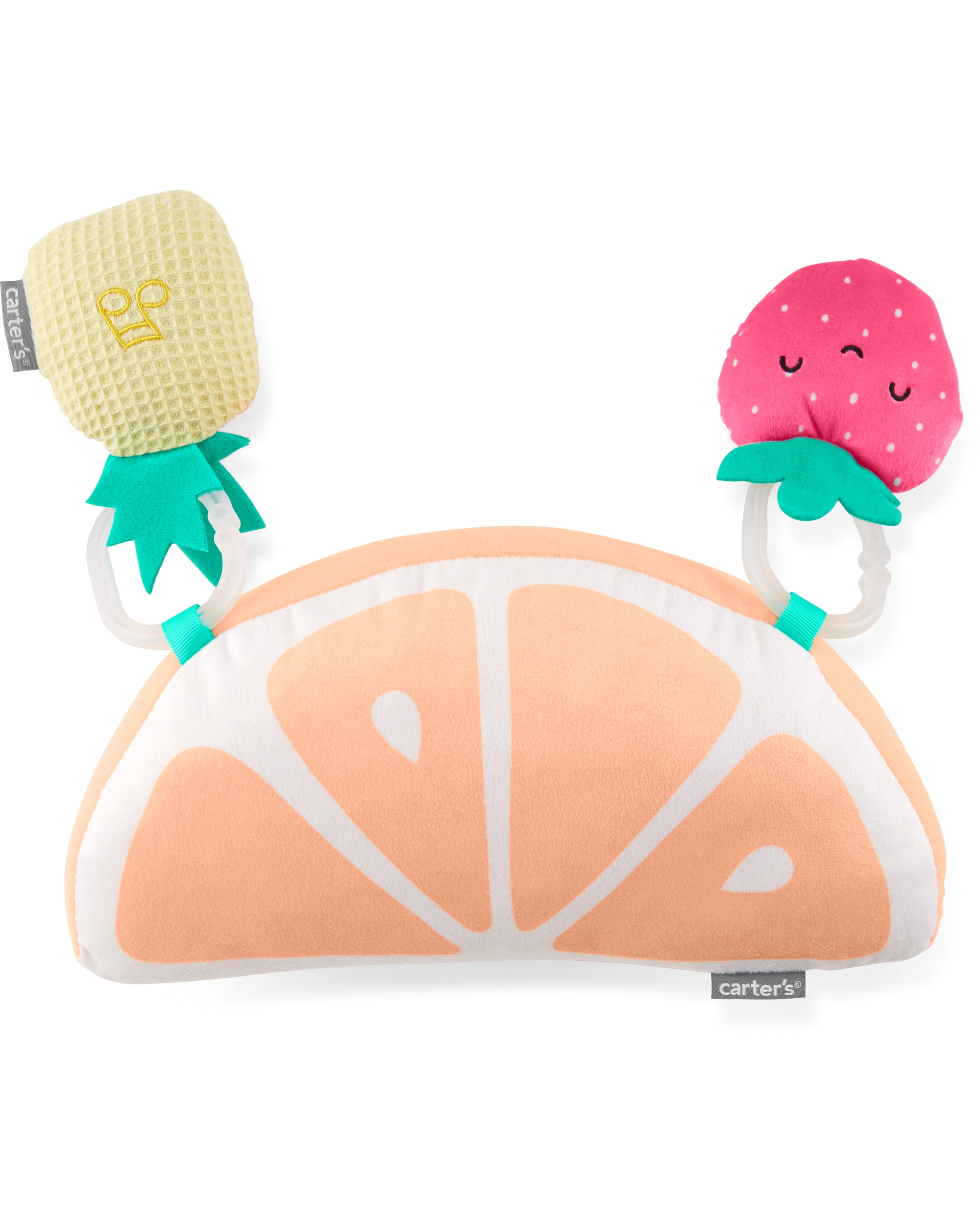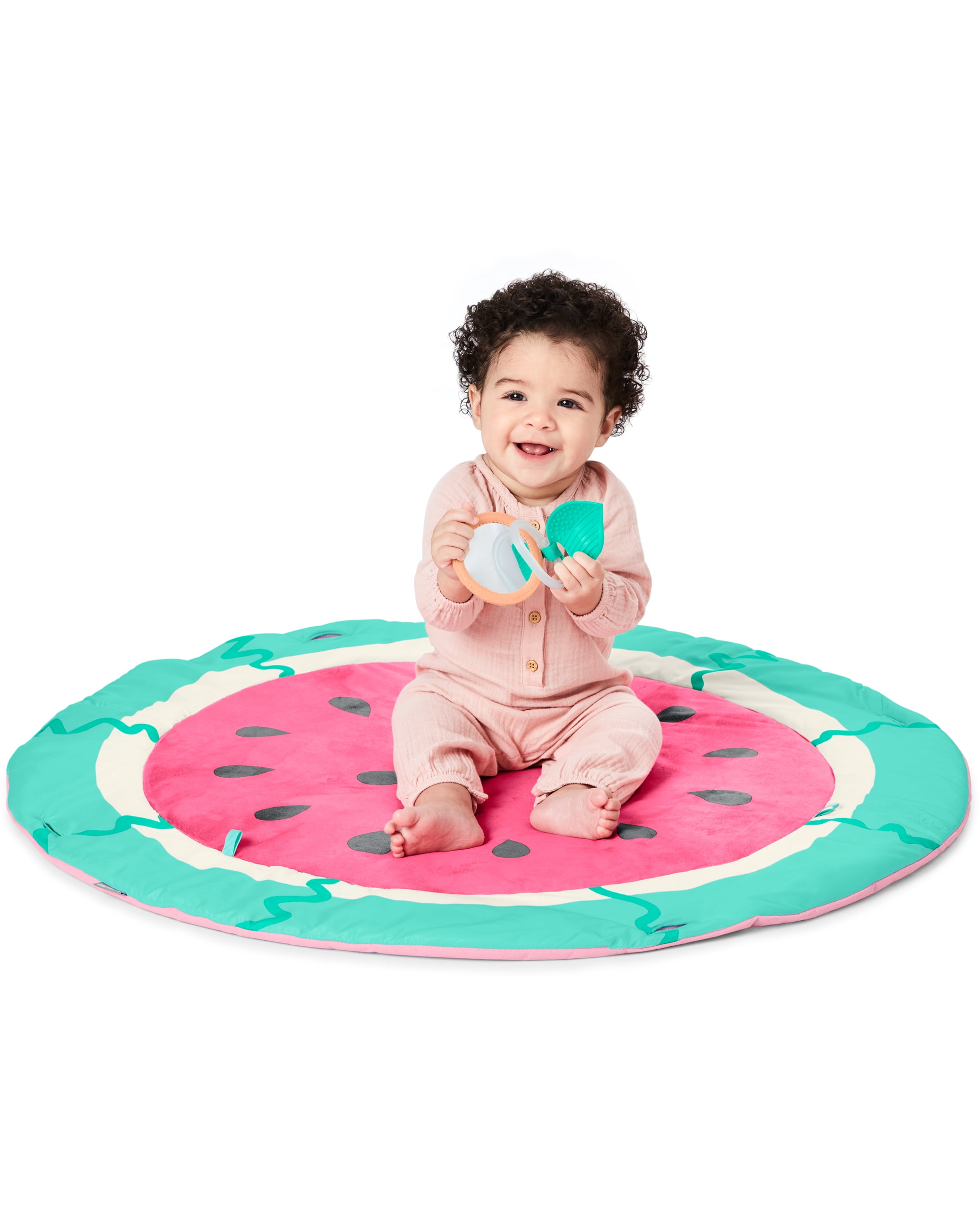 Age 0+ Three ways to play: Overhead, tummy time and seated Comfy watermelon mat Citrus for tummy time Five developmental toys include: musical pineapple, strawberry squeaker, peek-a-boo crinkle banana, cherries with rattle, orange baby mirror and leaf teether toy Size (inches): 34L x 34W x 20H; (cm): 86.4L x 86.4W x 50.8H