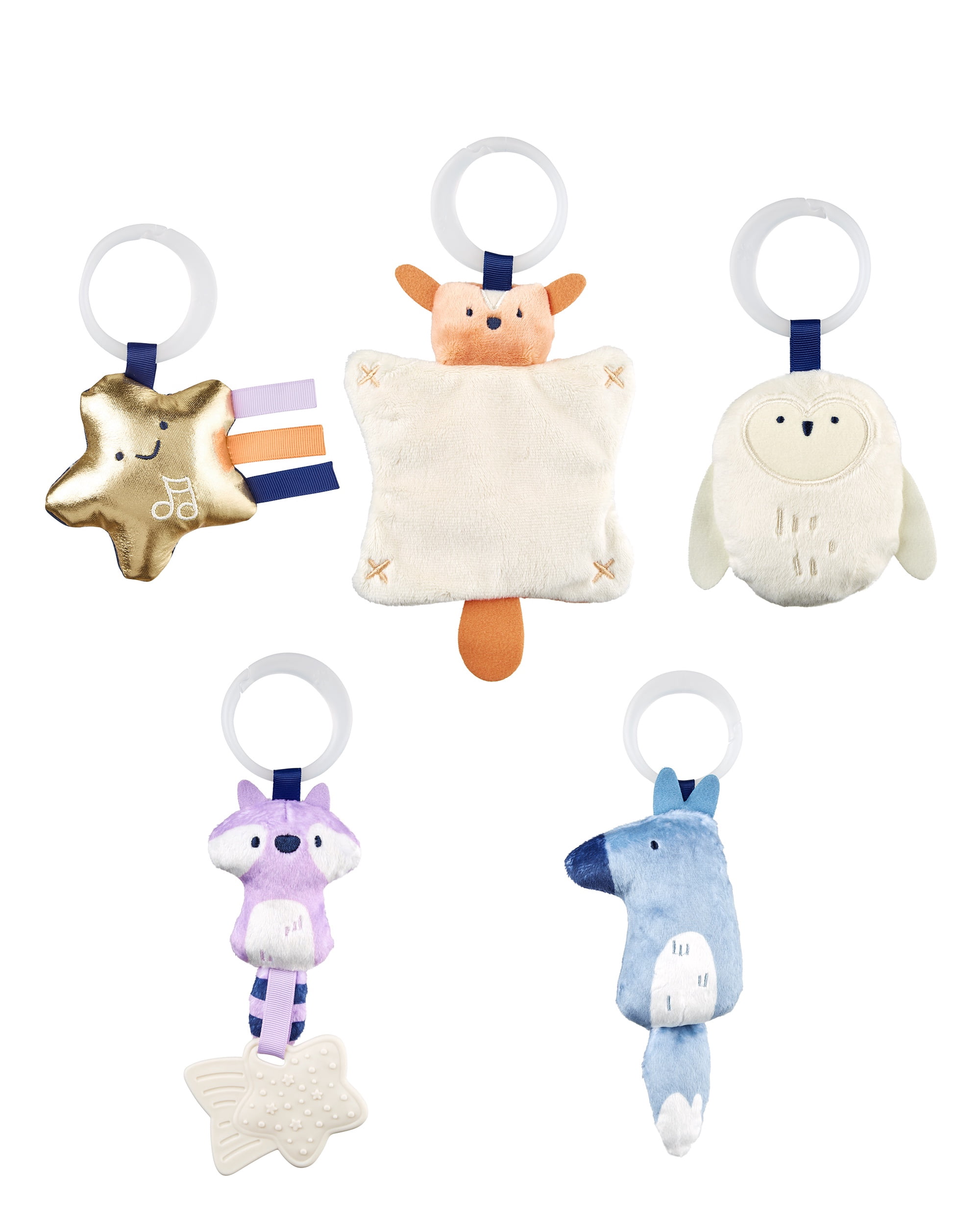 Packed with a galaxy of fun for baby, this dreamy baby activity gym features a celestial-themed baby play mat with plush quilting details and a crescent moon for baby tummy time play. Tummy time toys include a removable shooting star baby mirror to encourage self-recognition, while five nocturnal animal hanging toys engage your little one’s senses with music, sounds, textures and more to explore.